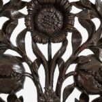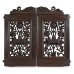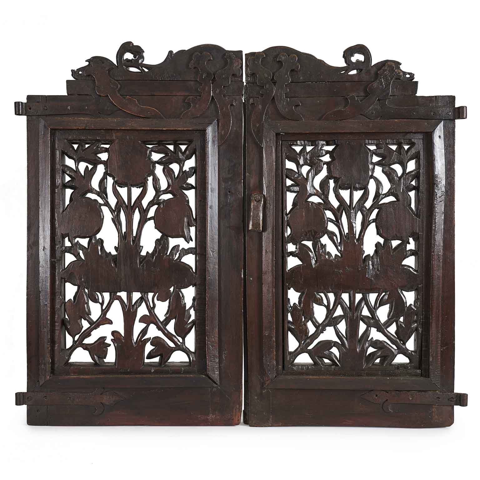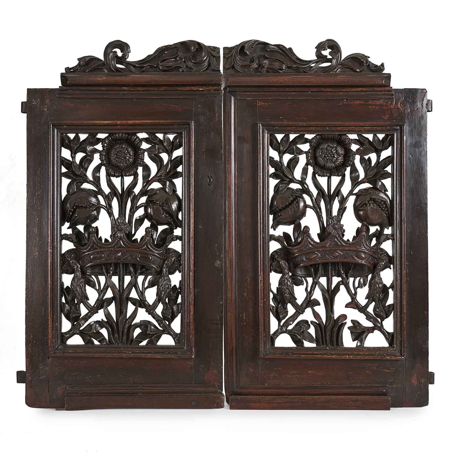 Antique Italian carved walnut two door gate of the 18th century from a church altar chapel carved and pierced with floral motifs, pomegranates and sunflowers. In the lower part two birds holding a crown, which has been integrated into the right-hand leaf; in the upper part above a frame there is a floral cymatium. The interrupted frames, the one on the right wing has been replaced, show that the gate originally went against a balustrade or similar structure. The symbolic significance of the crown, pomegranate and sunflower is interesting. On the back side, the moulded wooden cimasa supports are delightful. The dovetailed kneeling hinges are also original. In good age related condition.