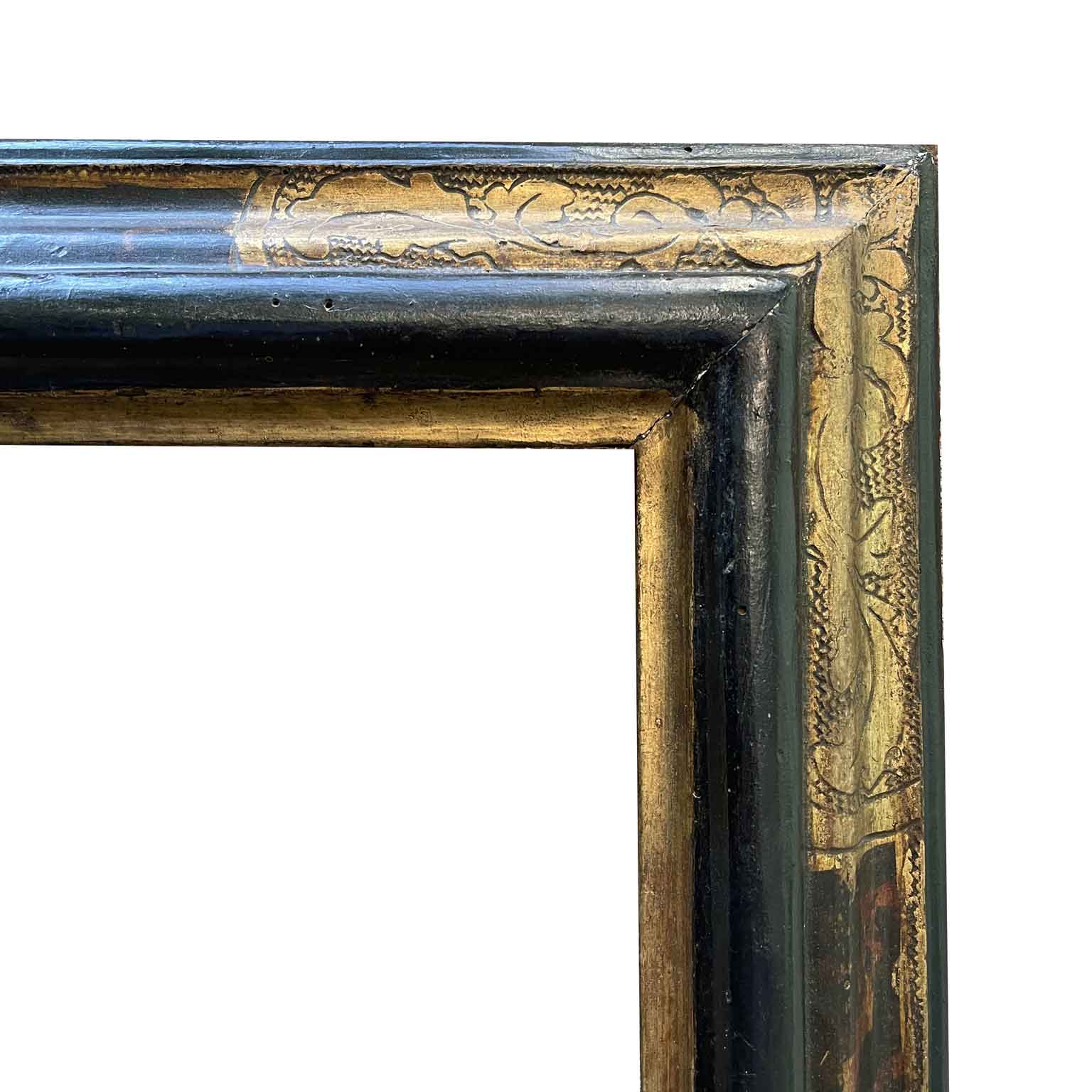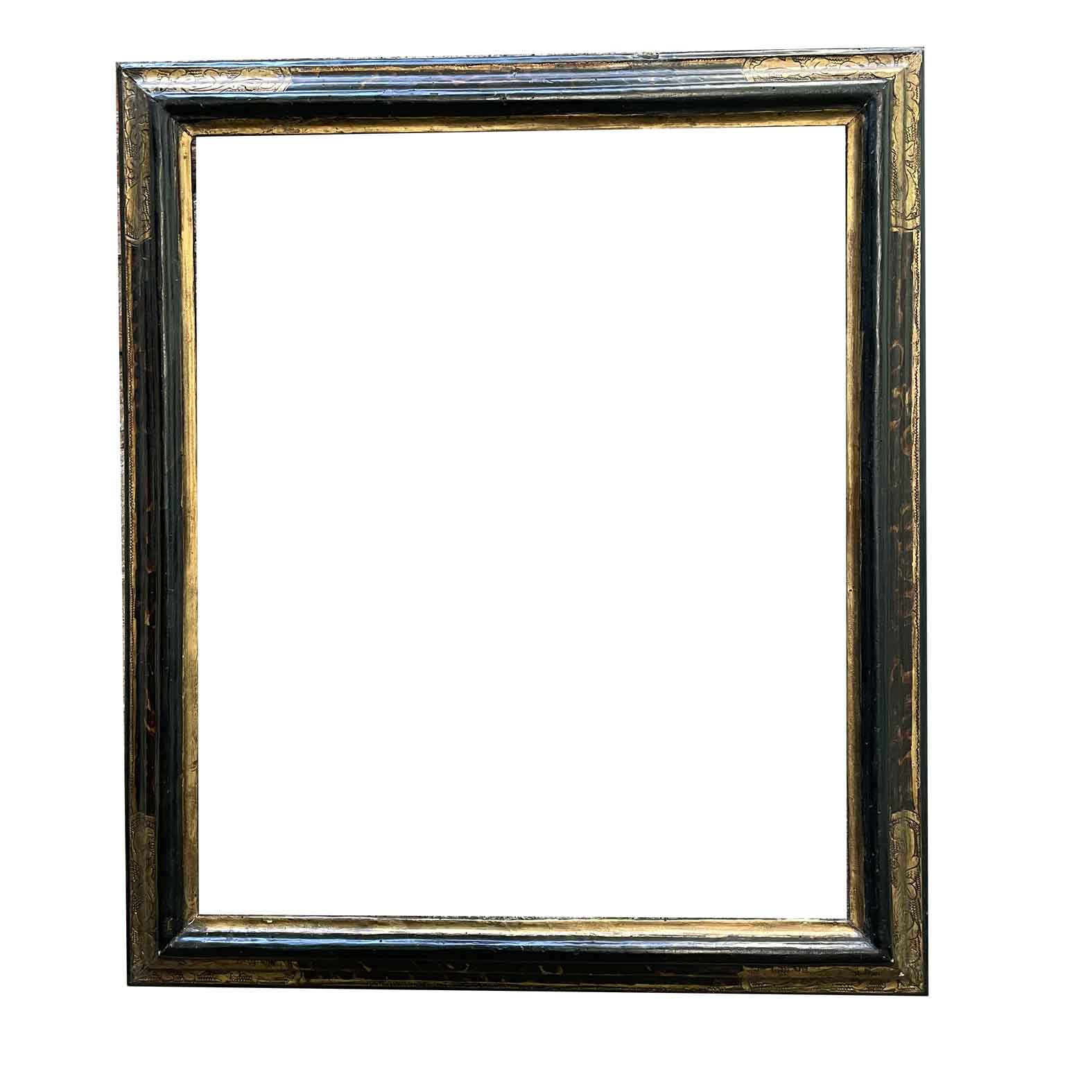 18th Century Italian Frame with Faux Tortoiseshell Finish Gilded Corners and Graffiti in good condition. The frame is made of shaped wood with brown tempera lacquer and faux tortoiseshell on the outer part of the middle sides. The corners and the inner profile near the rebate are gilded and graffitoed. Marche region, central Italy, 1700.