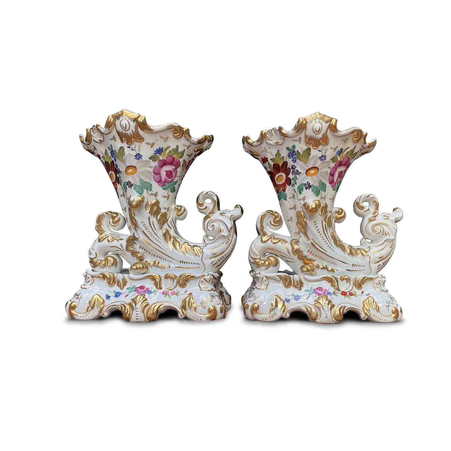 19th Century French Tulipières Pair of Porcelain Vases, neo-rocaille style, with an original cornucopia shape, richly decorated with polychrome floral motifs, vibrant compositions of bouquets of flowers and details in fine gold partially in relief on a white background. The vases, decorated and shaped like cornucopias, or horns of plenty, refer to mythological symbols of prosperity and abundance. French manufacture, they are in perfect condition. Under the base there is an indecipherable mark in blue.