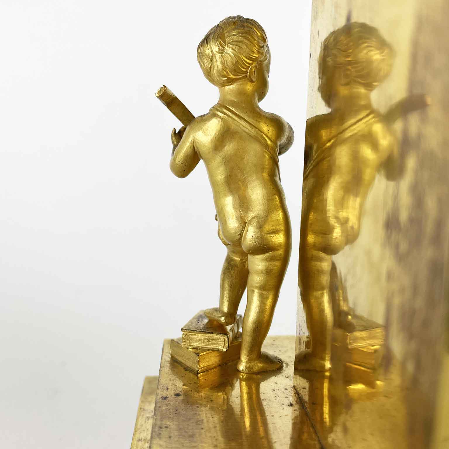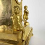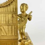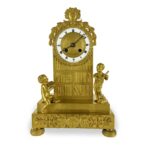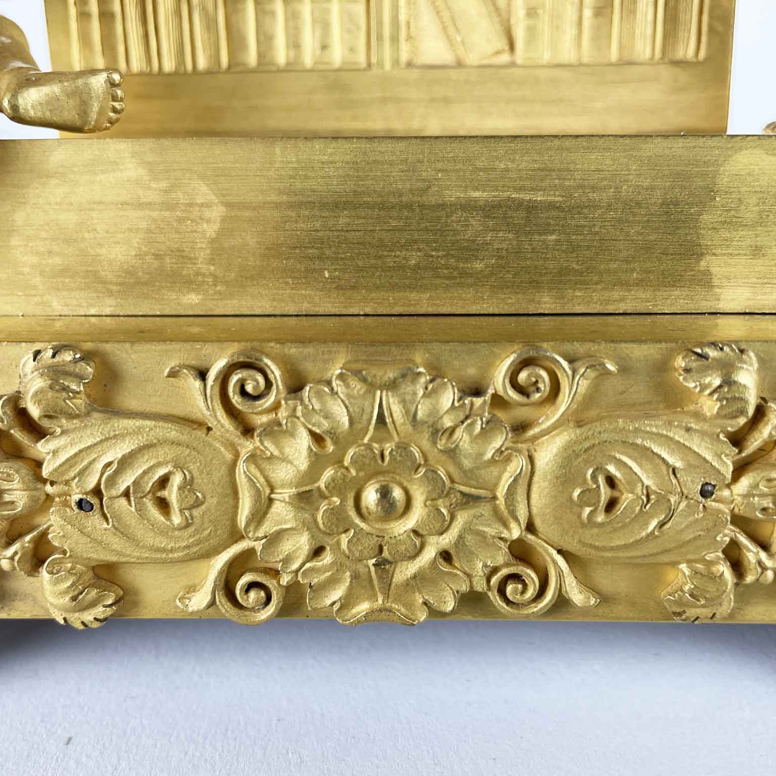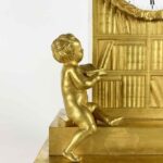 This gilt bronze table clock dating from the early 1800s is a charming French Empire clock depicting allegory of the arts. Arched case, flanked by two putti, one seated with a book and the other upright, one foot resting on books, intent on playing a musical instrument; the clock’s base, with two rectangular steps and decorative frieze with floral motifs, in the Empire style, adds an additional touch of elegance, while the beaded-bordered hemispherical feet provide good stability.
