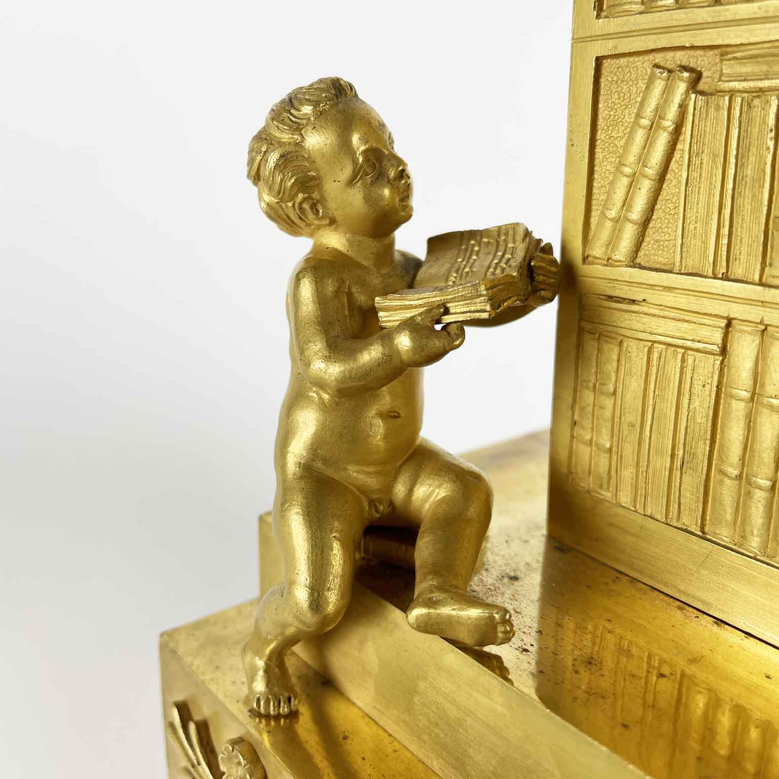 The white enamel dial with Roman numerals within mock bookcase surmounted by laurel wreaths and plant festoons, although it has a small felure, is framed by a fine leaf motif. The mask above the dial is an Empire-style decorative element that enriches the clock’s design.