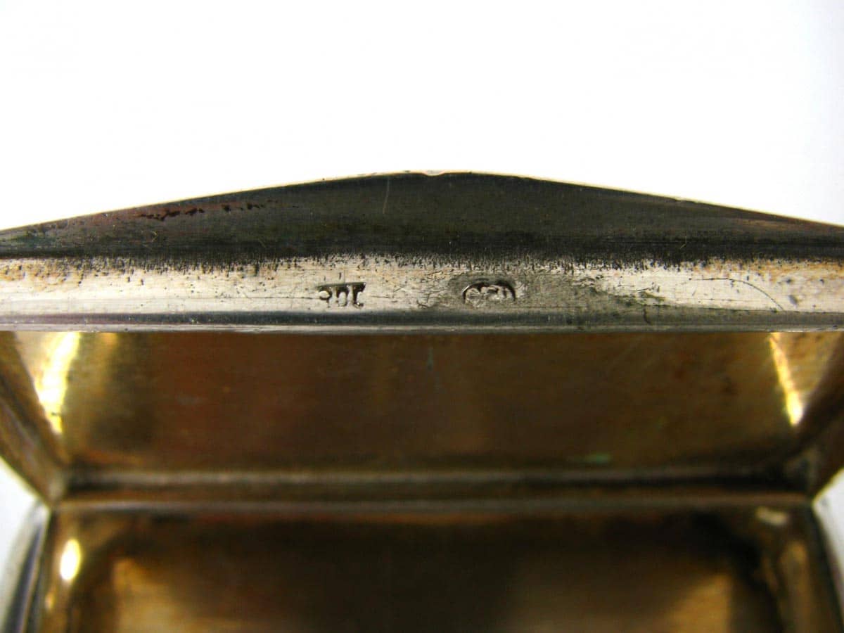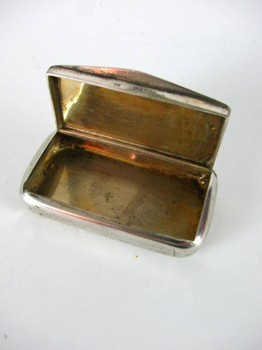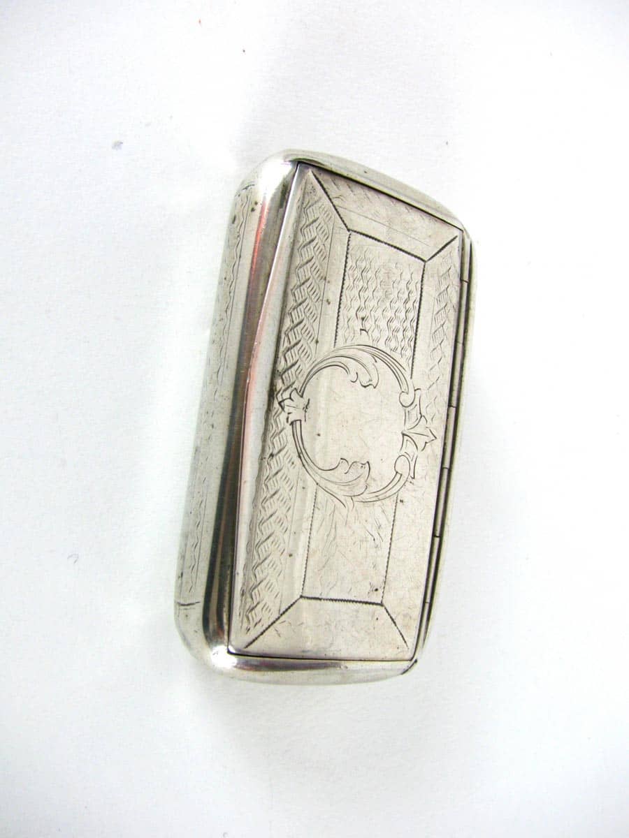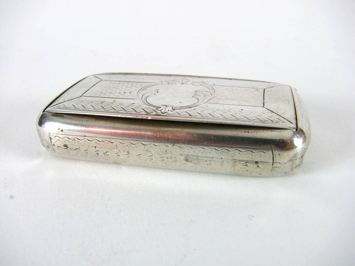 Early 20th century Silver Snuff Box, rectangular shape, rounded edges, decorated with a fine engraving with geometrical patterns and a cartouche on the lid.Marked 800 and an illegible mark. Good condition, minor dents on the corners, due to the age.