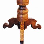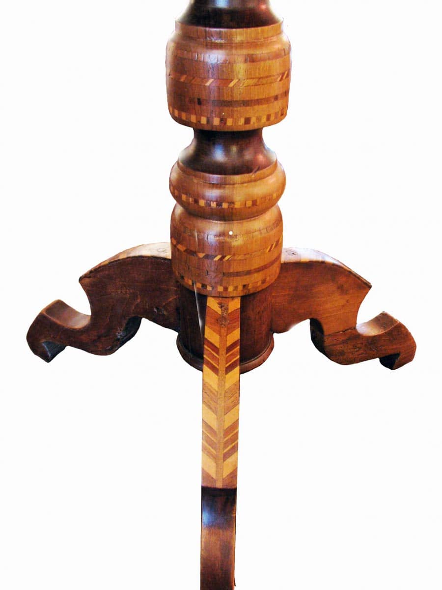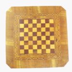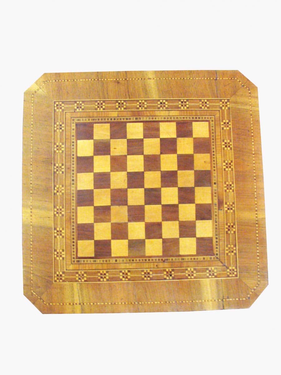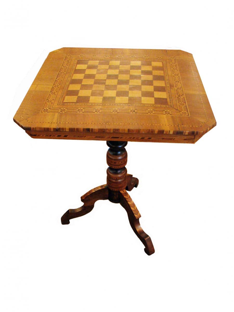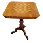 Beautifully Italian walnut made square inlaid chess table of early 20th century with tripod base and figurative pedestal. Very detailed design throughout. Good condition. Measures approx 29 inches H. by 24″ by 24″.