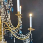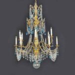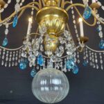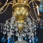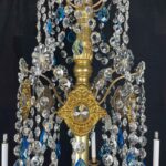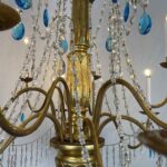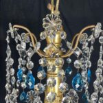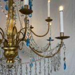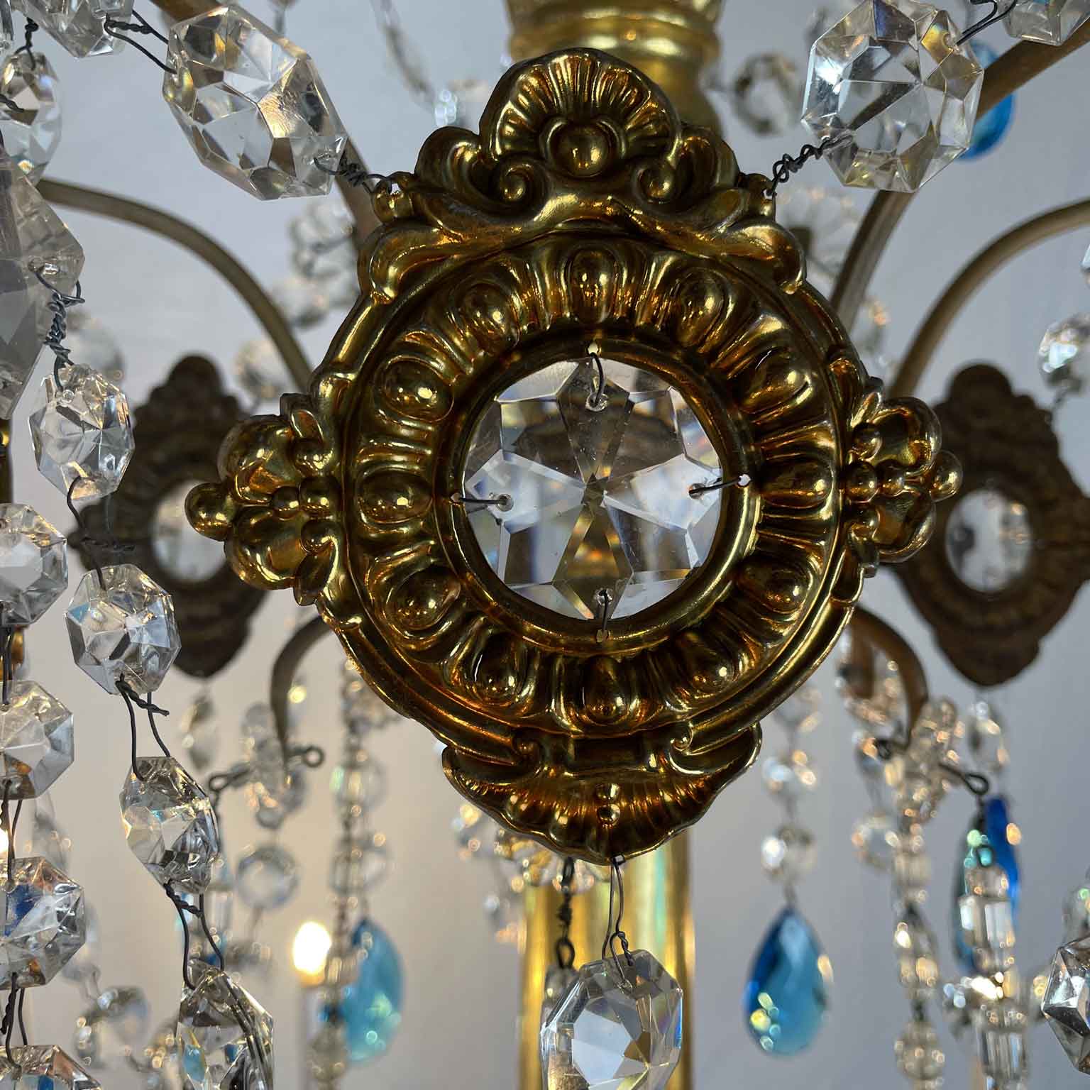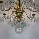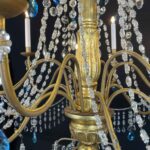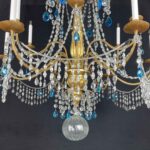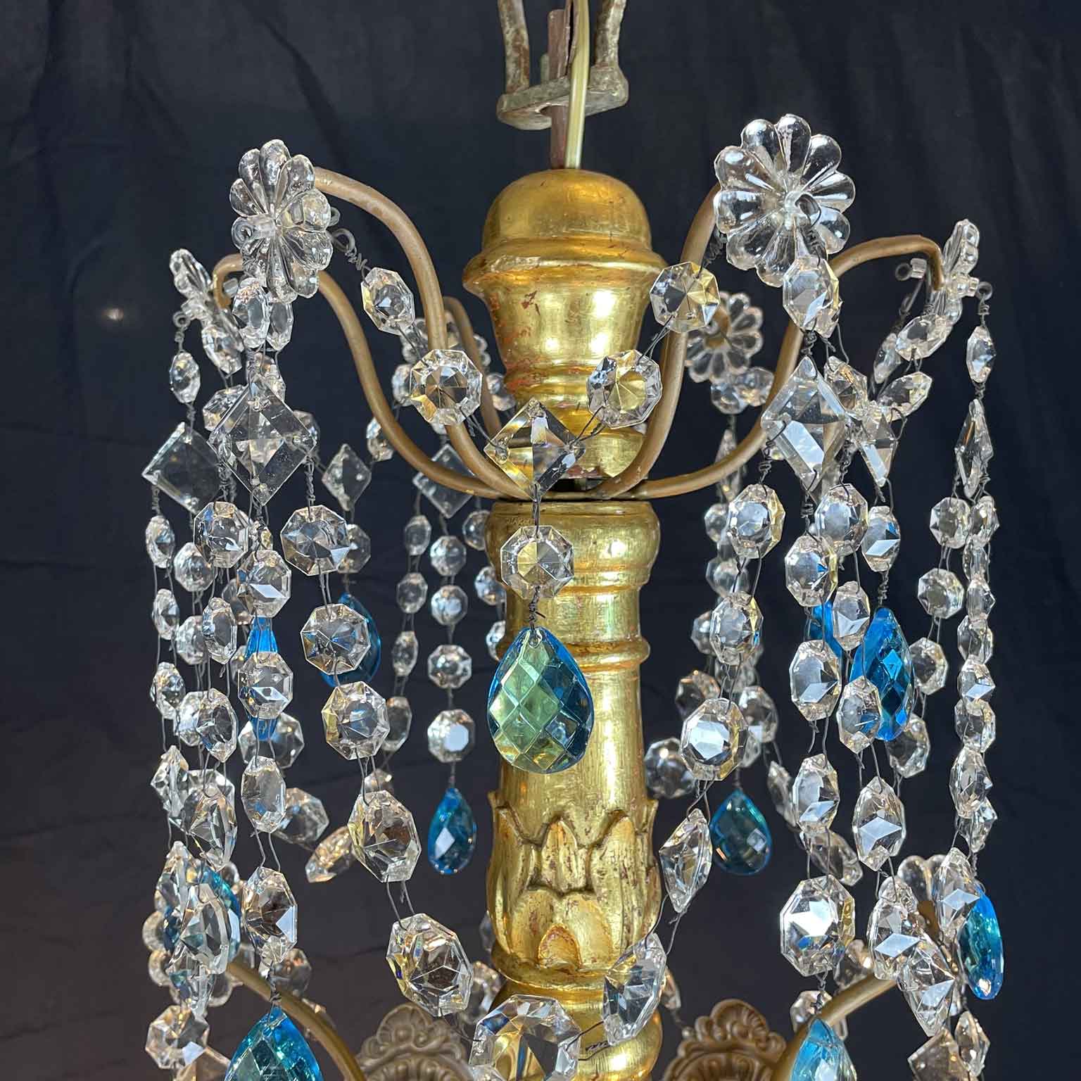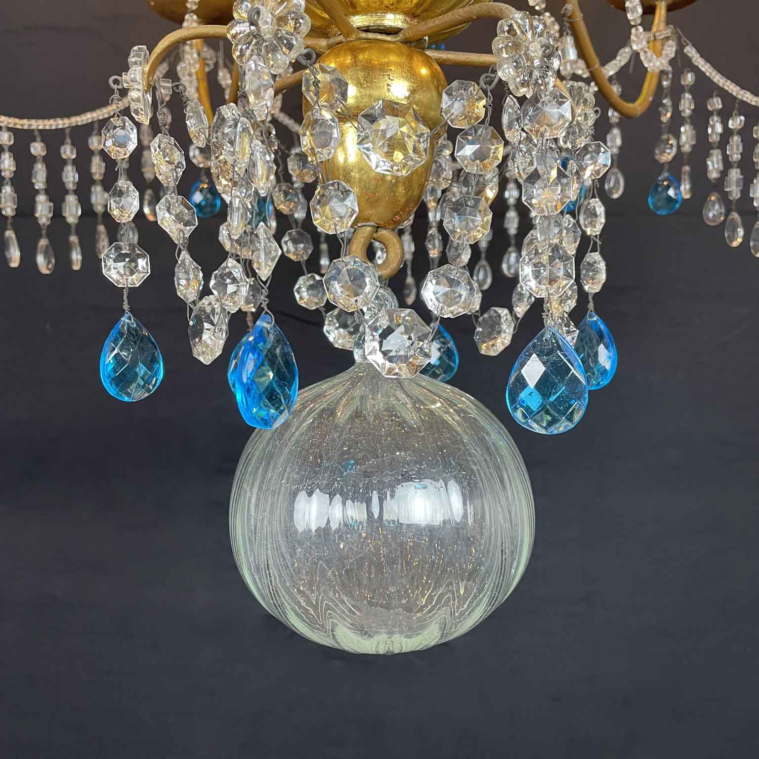 This chandelier is made with a central shaft of carved wood, carved with vegetal motifs and gilded in fine gold; this central support, consisting of several elements, is decorated by hand-forged iron elements, connected by a multitude of festoons of clear crystals enriched with blue crystals, surmounted by crystal flowers with the corolla in embossed and gilded brass, a precious and original detail that, together with the splendid gilding, distinguishes and emphasizes the timeless elegance of this important salon chandelier, from the end of the 18th century.