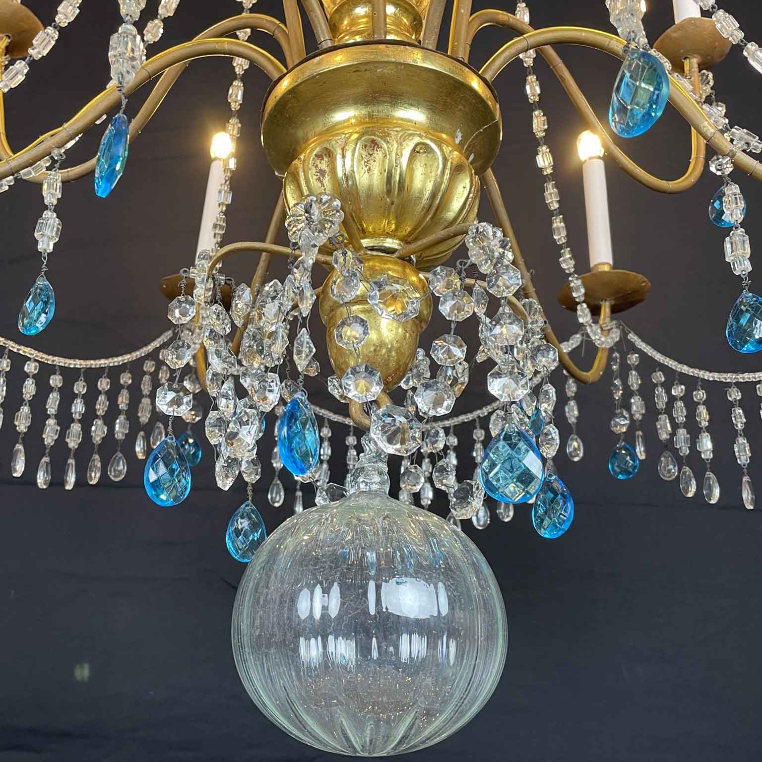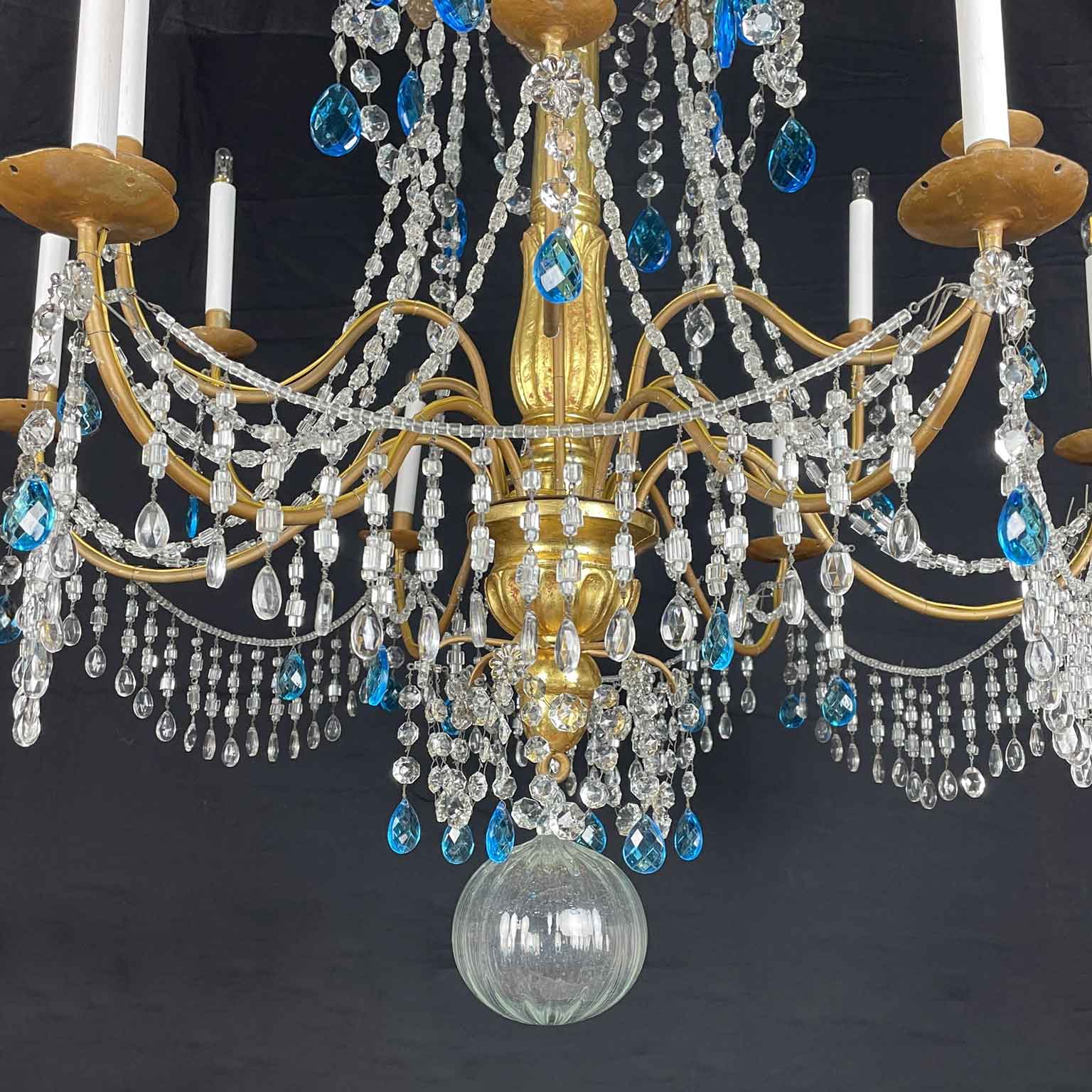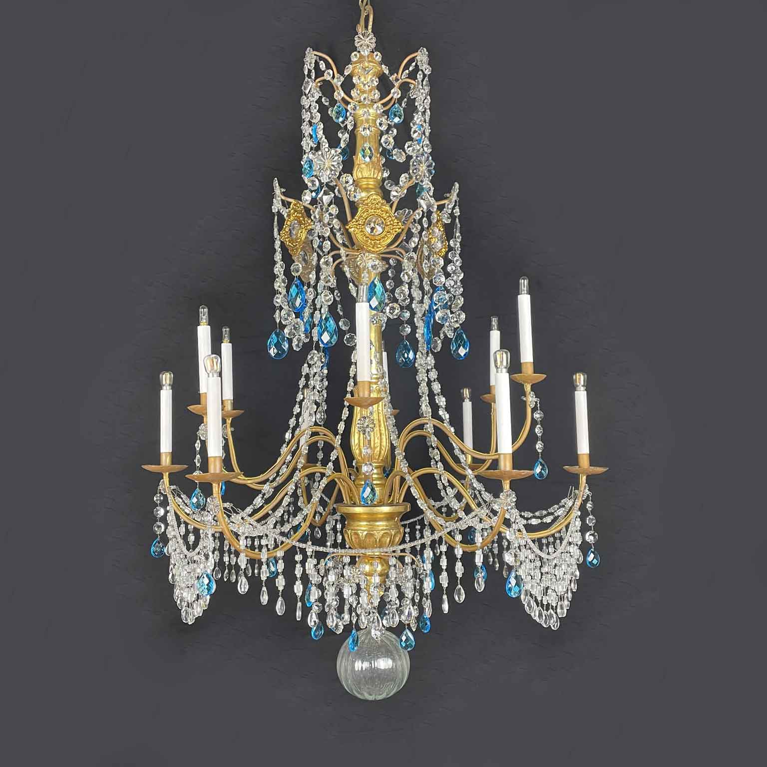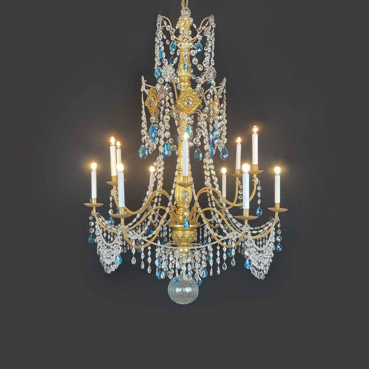 Empire Genoese Gilt Wood Twelve-Light Chandelier with light blue and clear crystals, consisting of a turned, carved and gilded wooden stem and twelve iron arms, gilded, arranged in two orders with crystals. It dates from the late 1700s and is in excellent condition restored and re-elected.