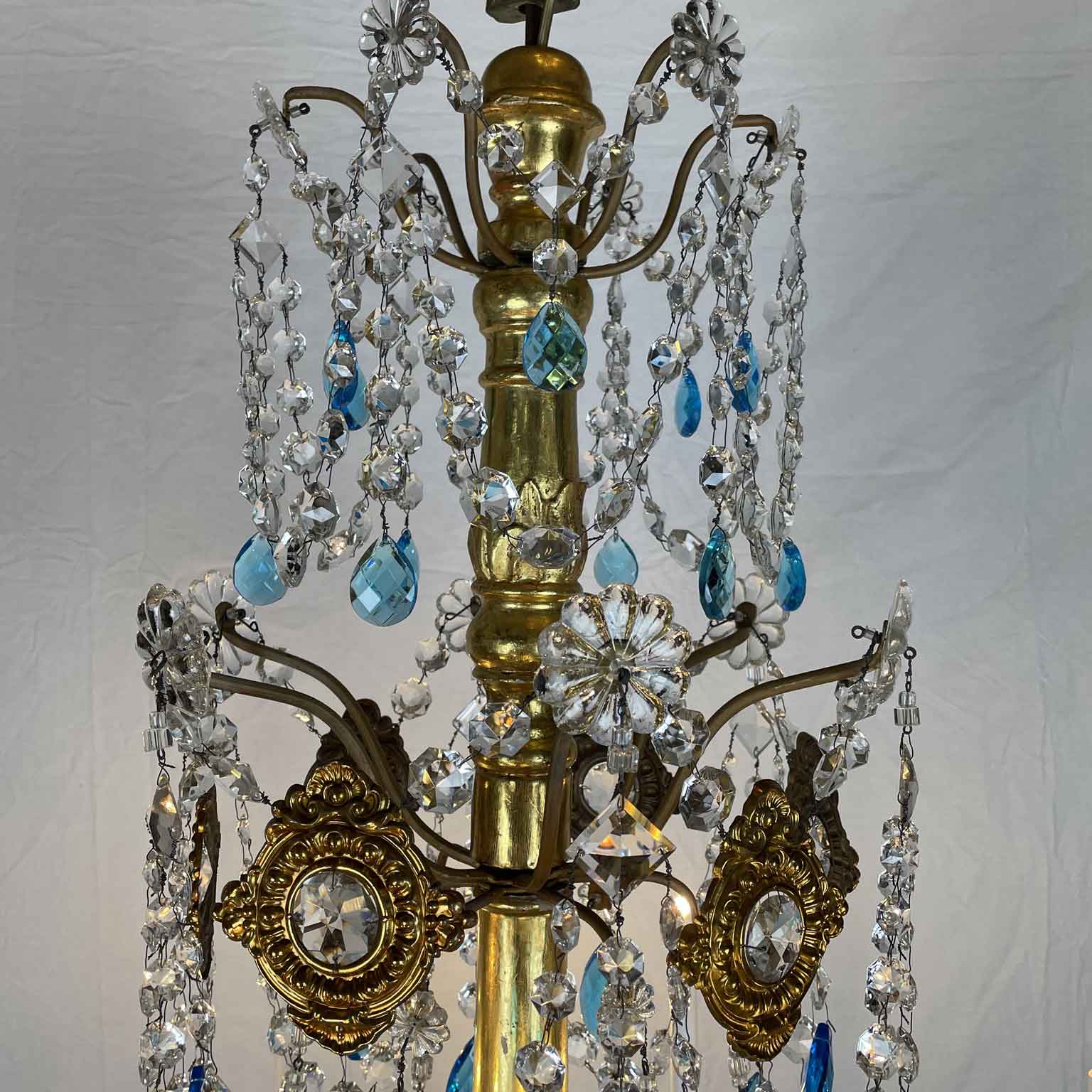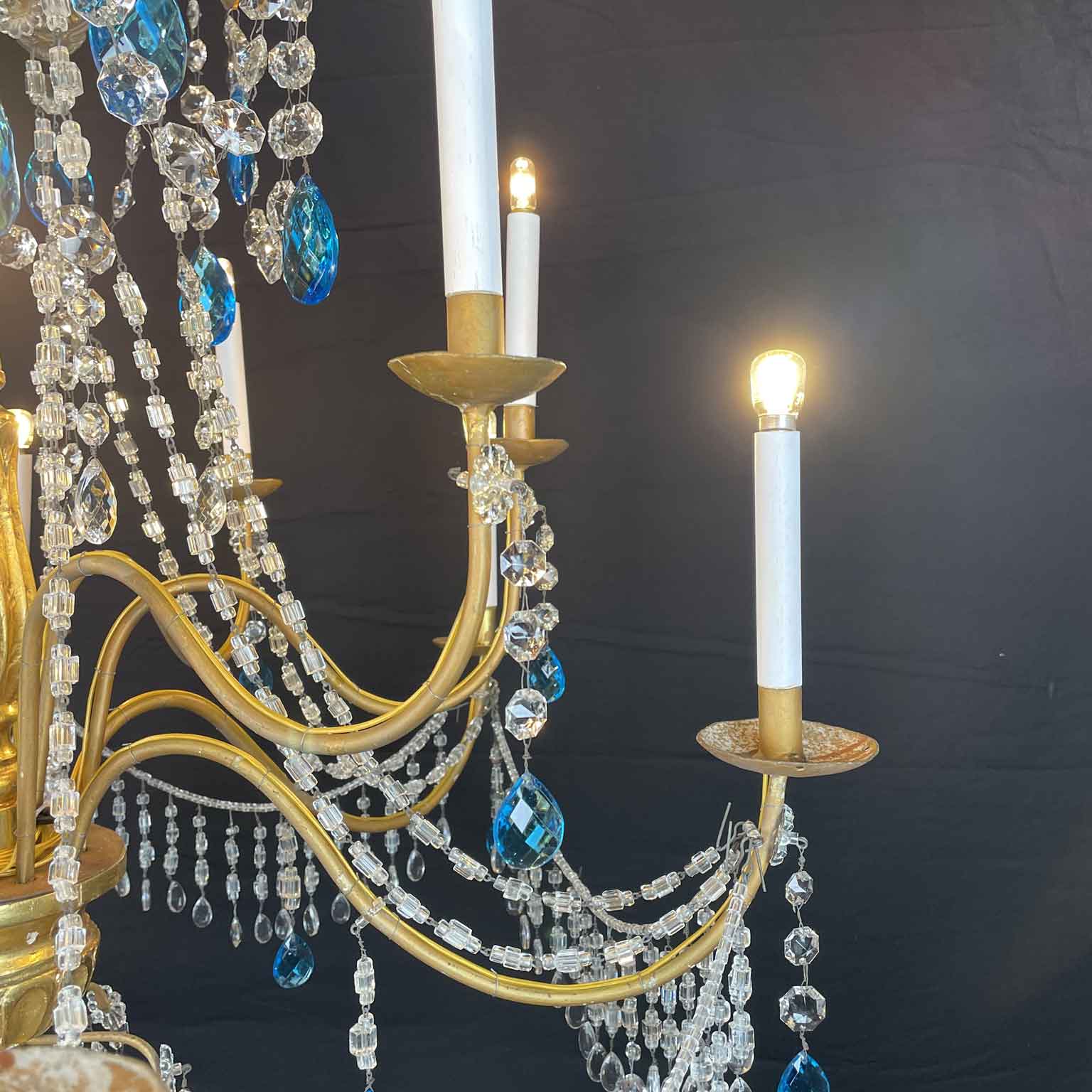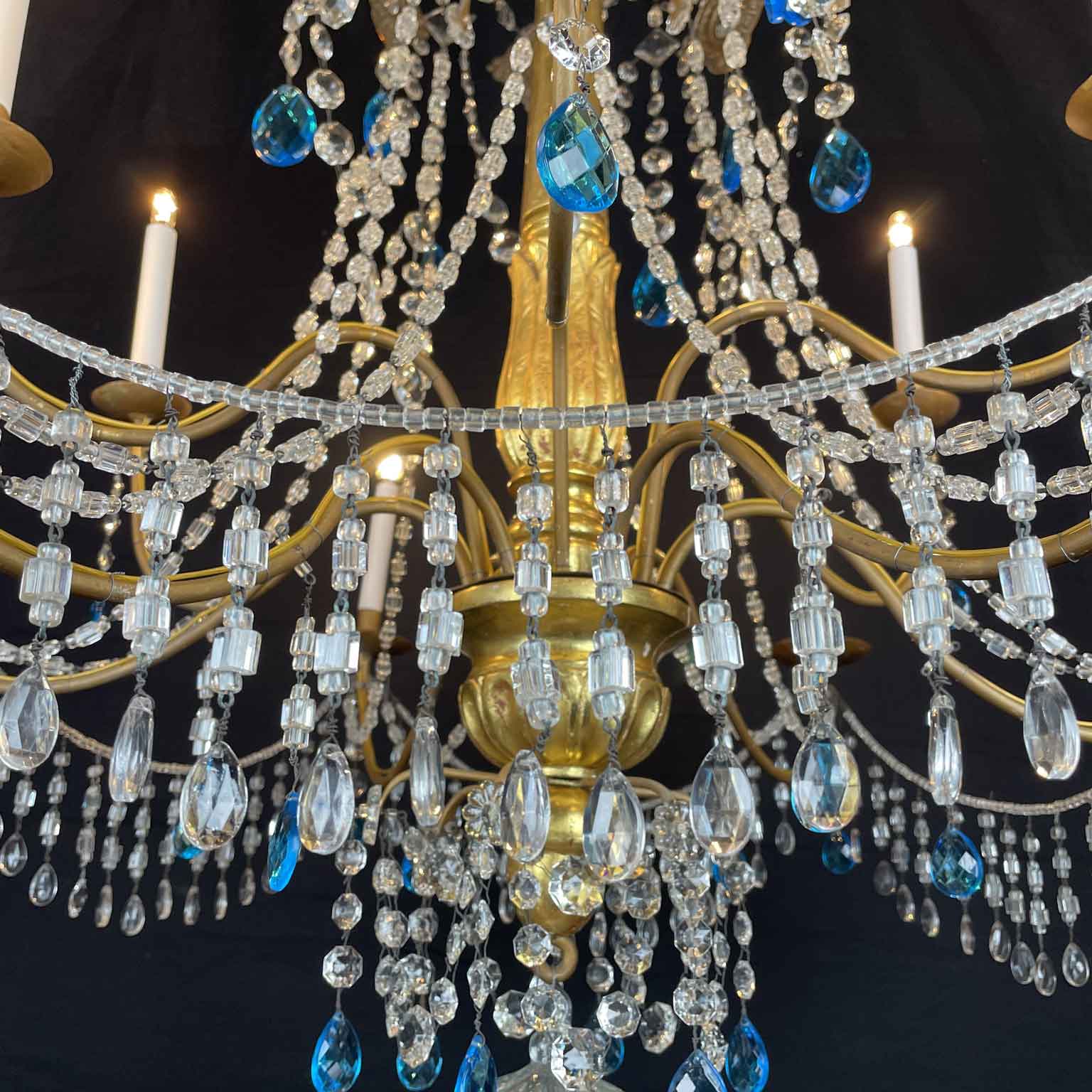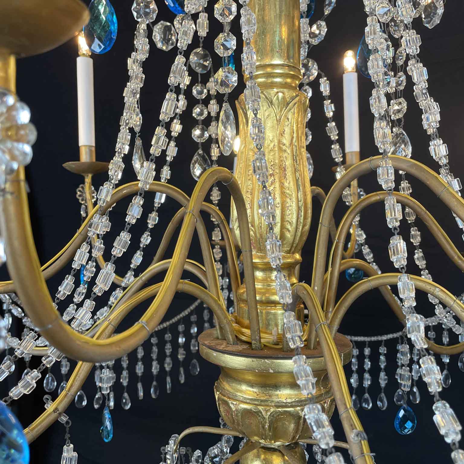 Empire Genoese Gilt Wood Twelve-Light Chandelier with light blue and clear crystals, consisting of a turned, carved and gilded wooden stem and twelve iron arms, gilded, arranged in two orders with crystals. It dates from the late 1700s and is in excellent condition restored and re-elected.