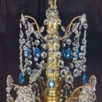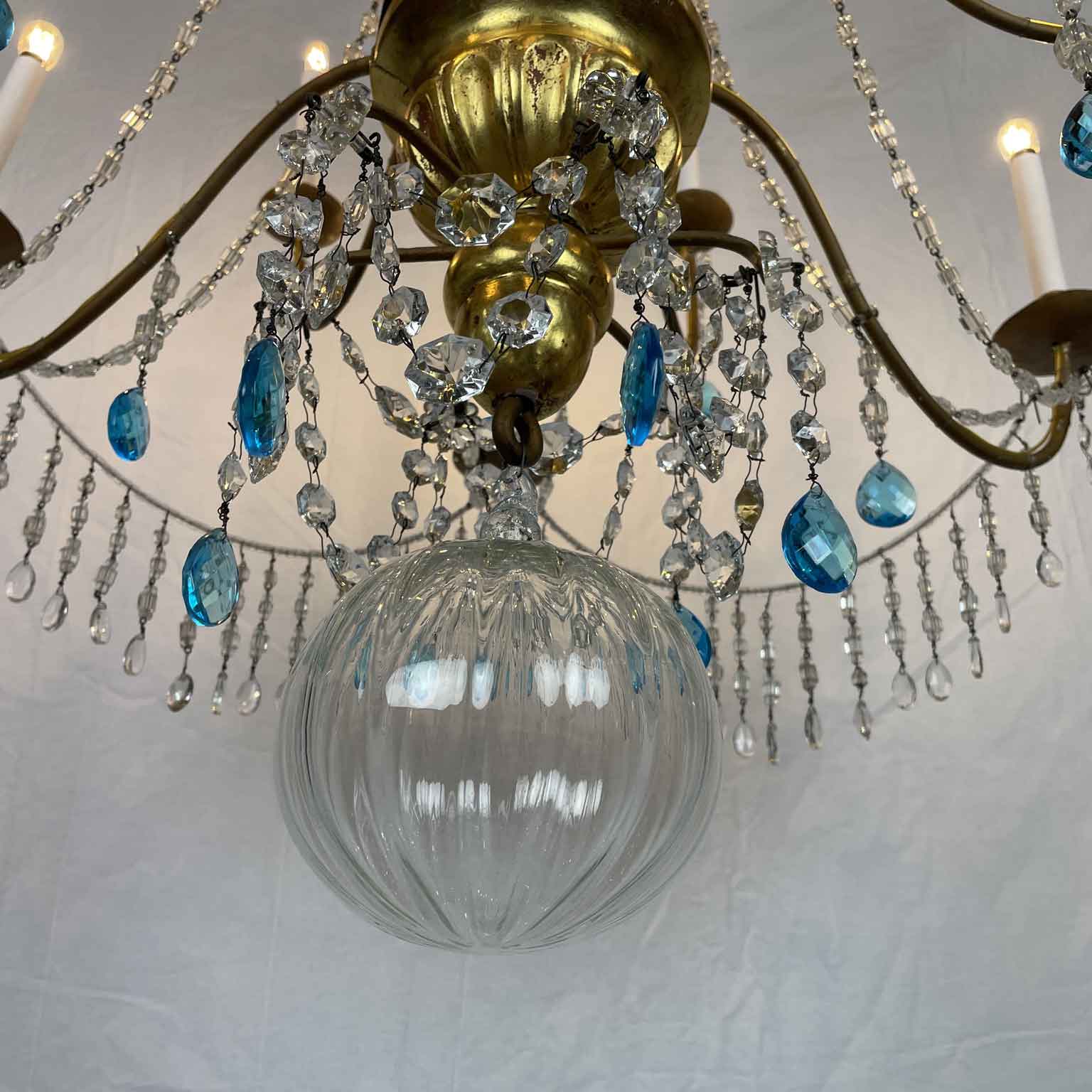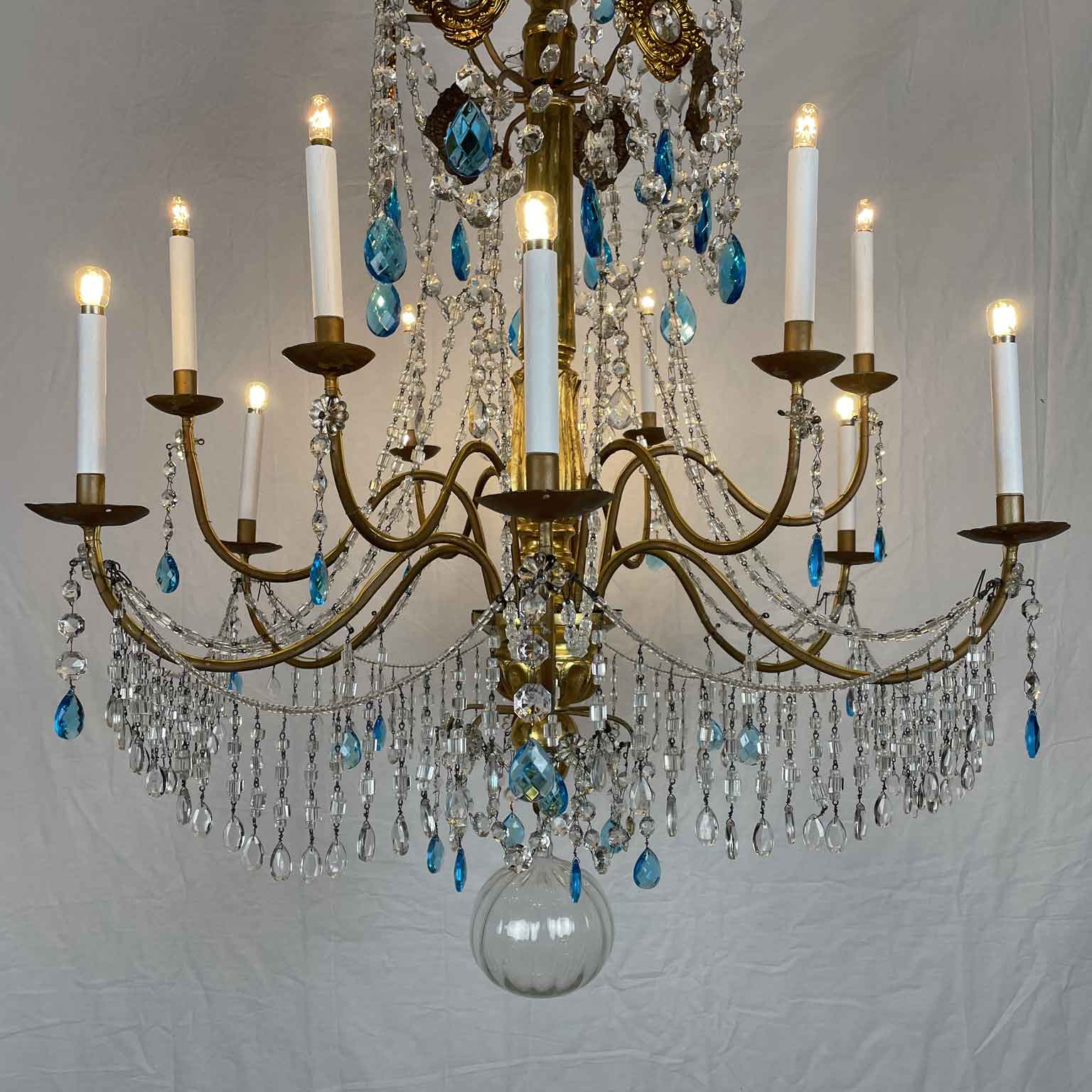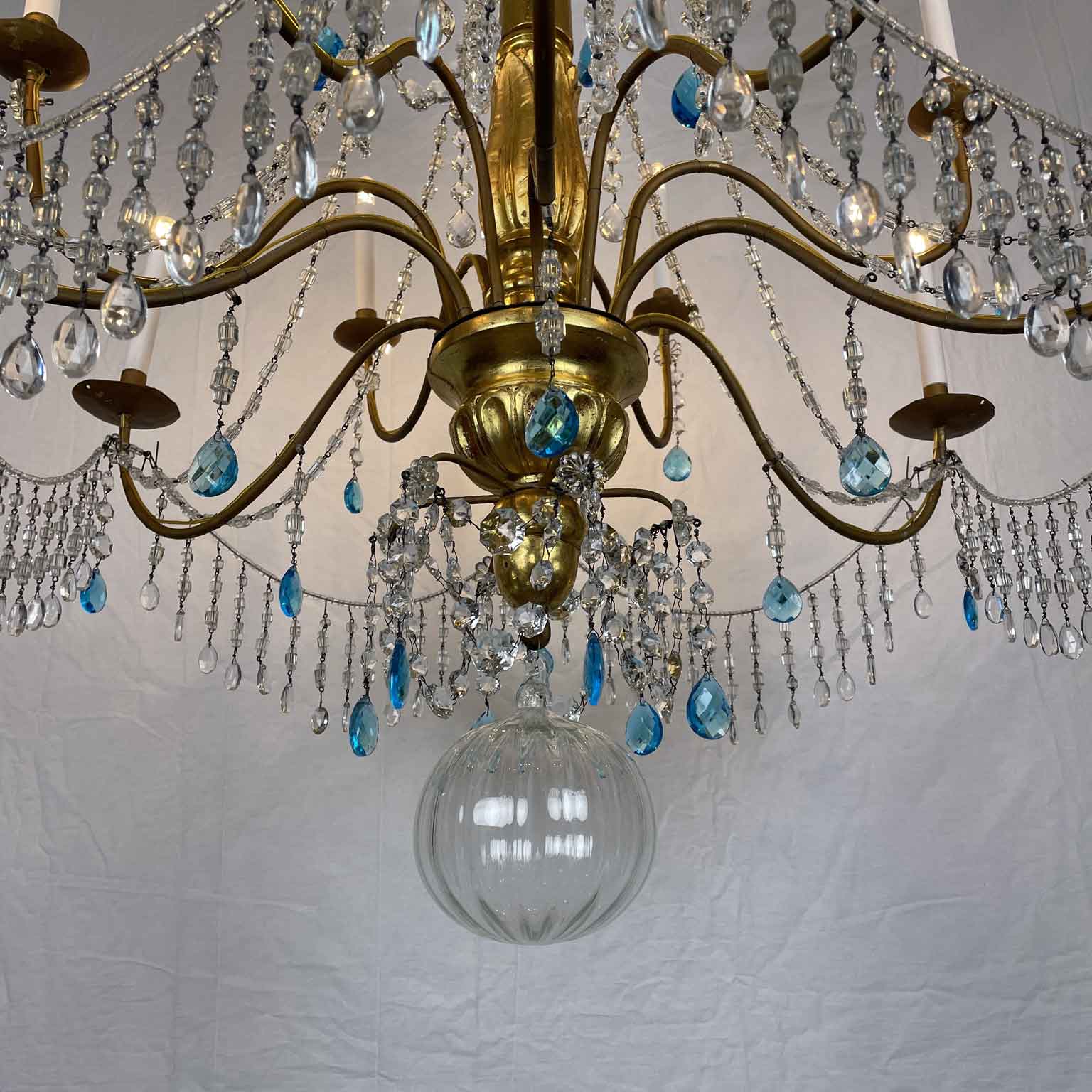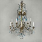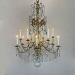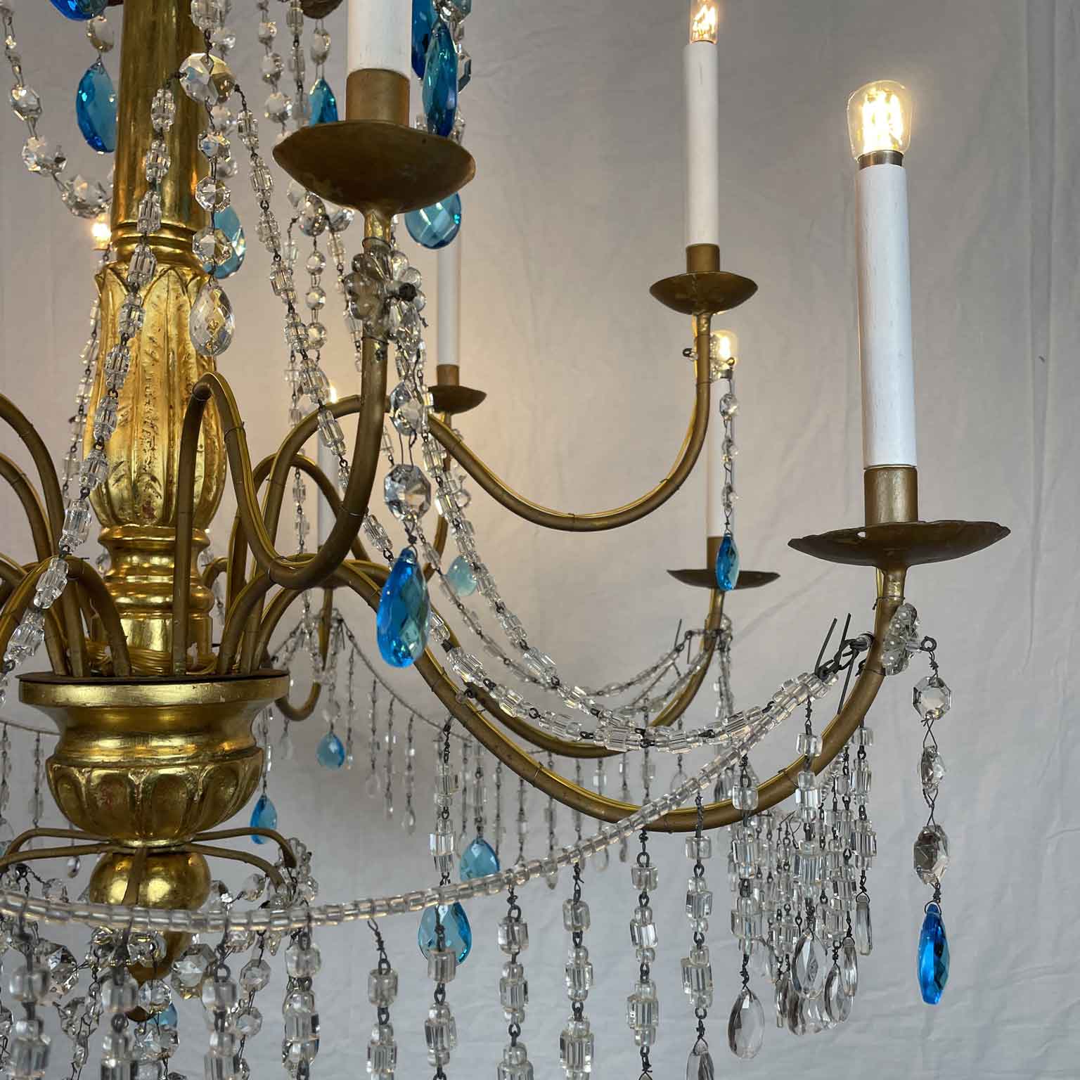 Empire Genoese Gilt Wood Twelve-Light Chandelier with light blue and clear crystals, consisting of a turned, carved and gilded wooden stem and twelve iron arms, gilded, arranged in two orders with crystals. It dates from the late 1700s and is in excellent condition restored and re-elected.