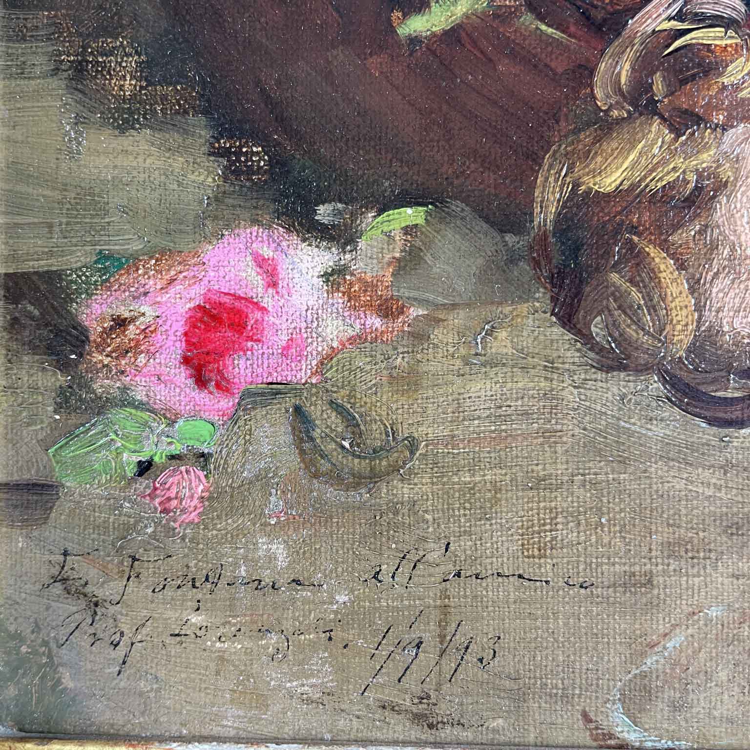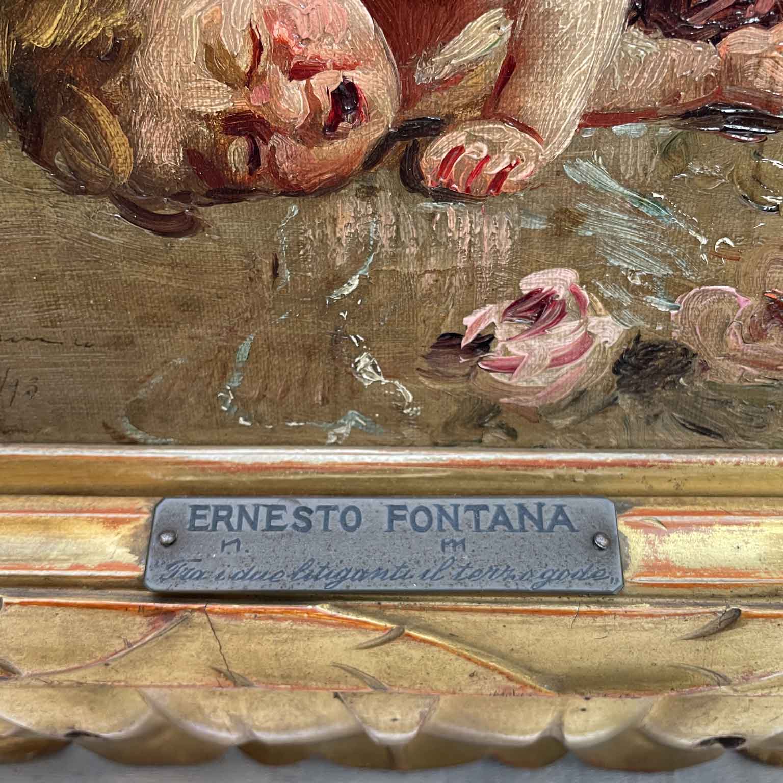 Ernesto Fontana Tra i Due Litiganti Il Terzo Gode 1893, oil painting on canvas depicting the famous Italian proverb Between Two Litigans The Third Enjoys, three children happily playing and rolling around among pink flowers, signed top right by the Milanese artist E.Fontana, Milan 1837 – Cureglia, Switzerland 1918, whereas on the lower left edge it is signed again, dated with dedication to his friend Prof. Lorenzani ?