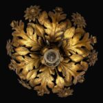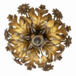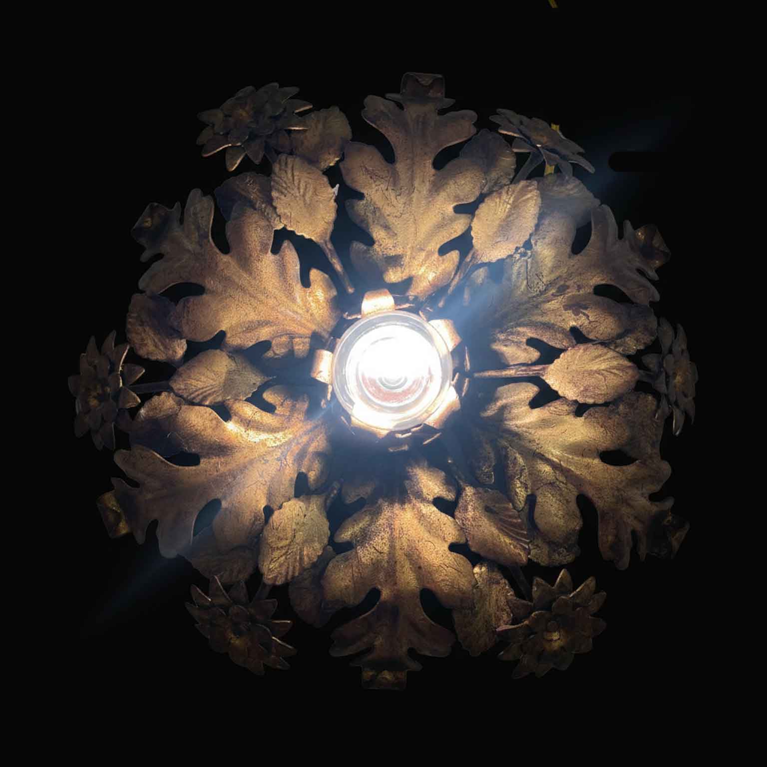 One-light gilded iron ceiling fixture lamp with embossed iron leaves and flowers with gold leaf gilding. In good working condition, it works with one E27 light bulb, with minimal signs of wear, Italy, circa 1970.