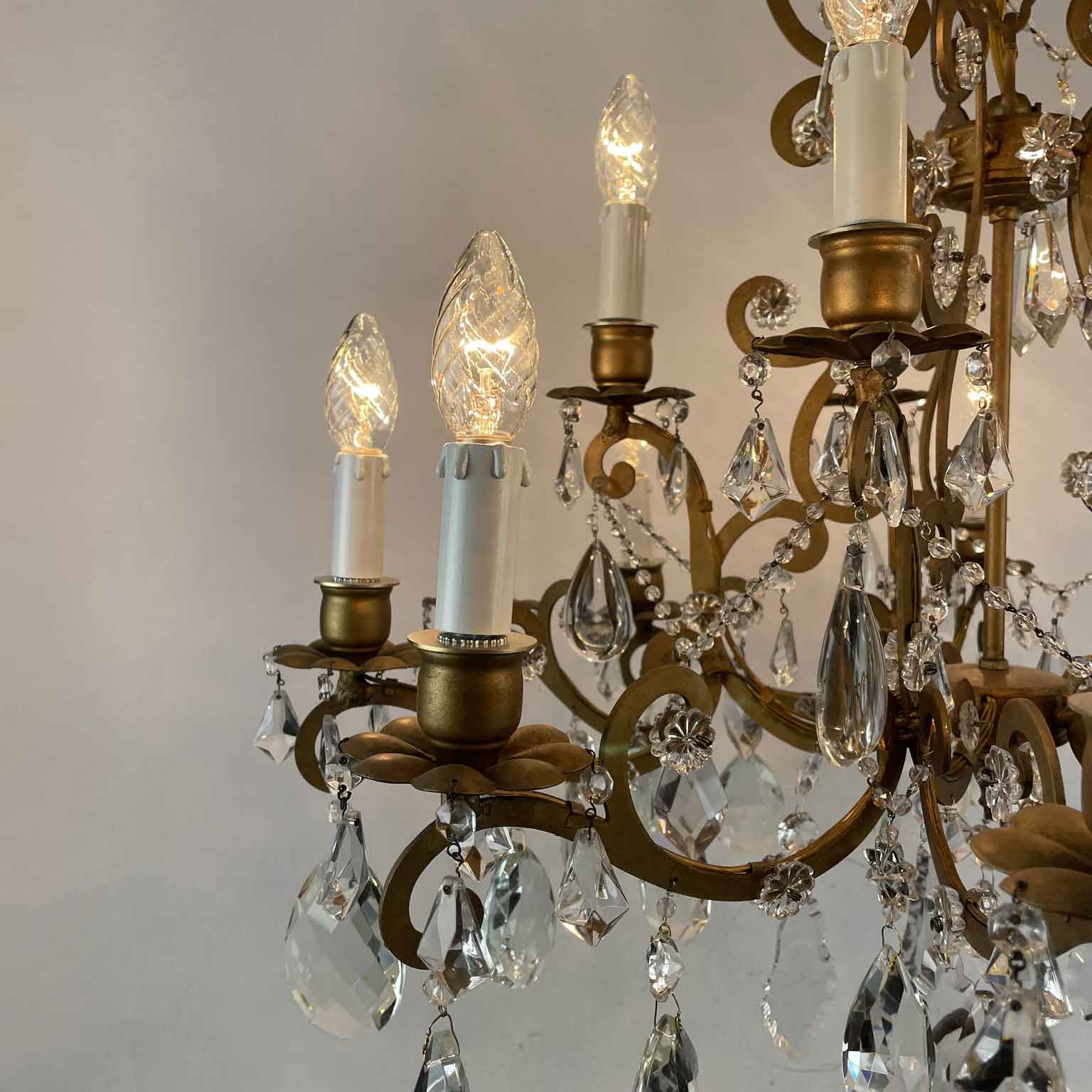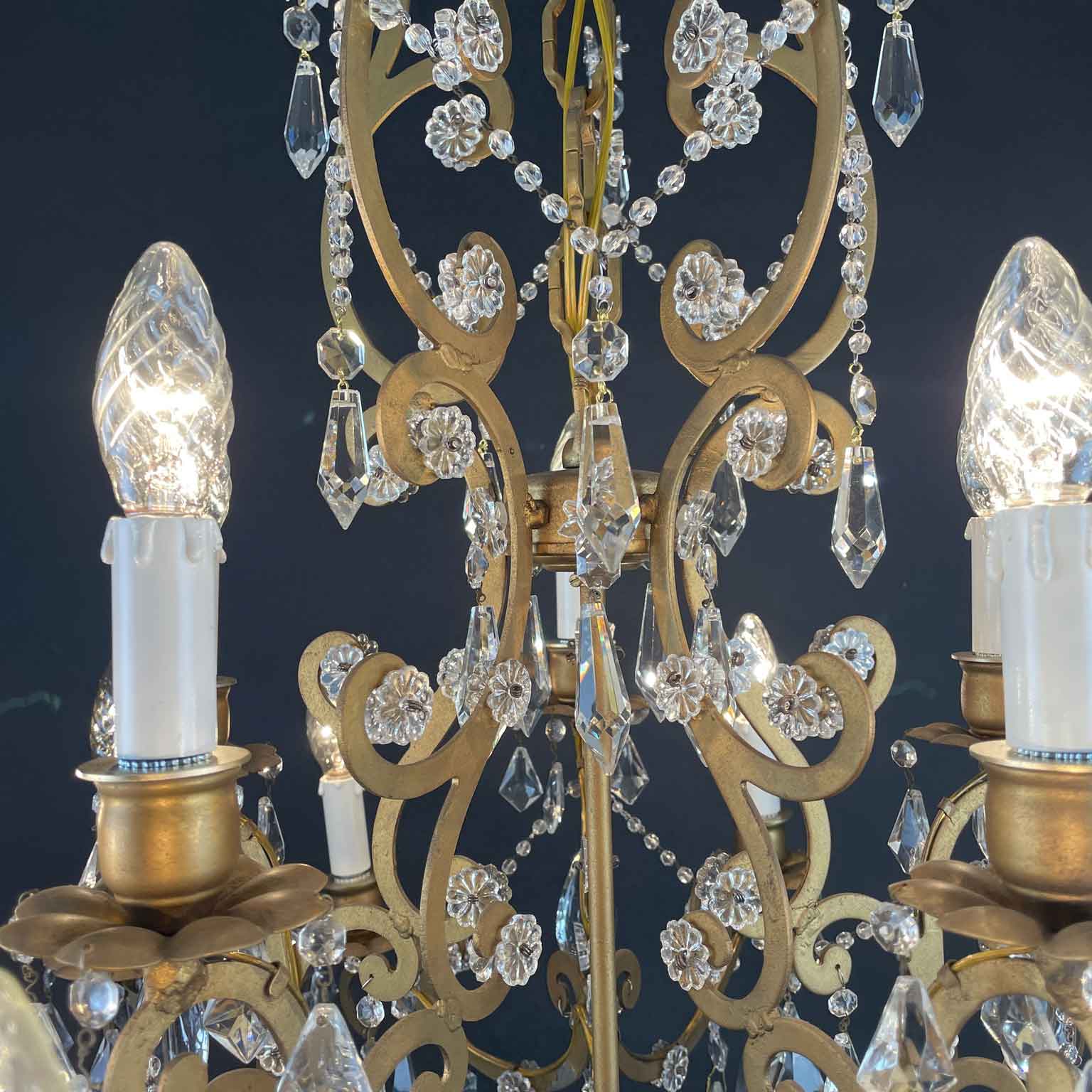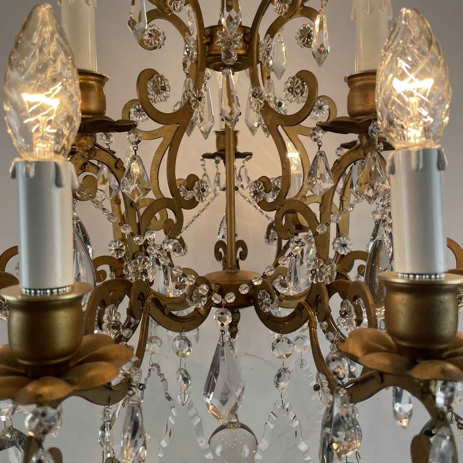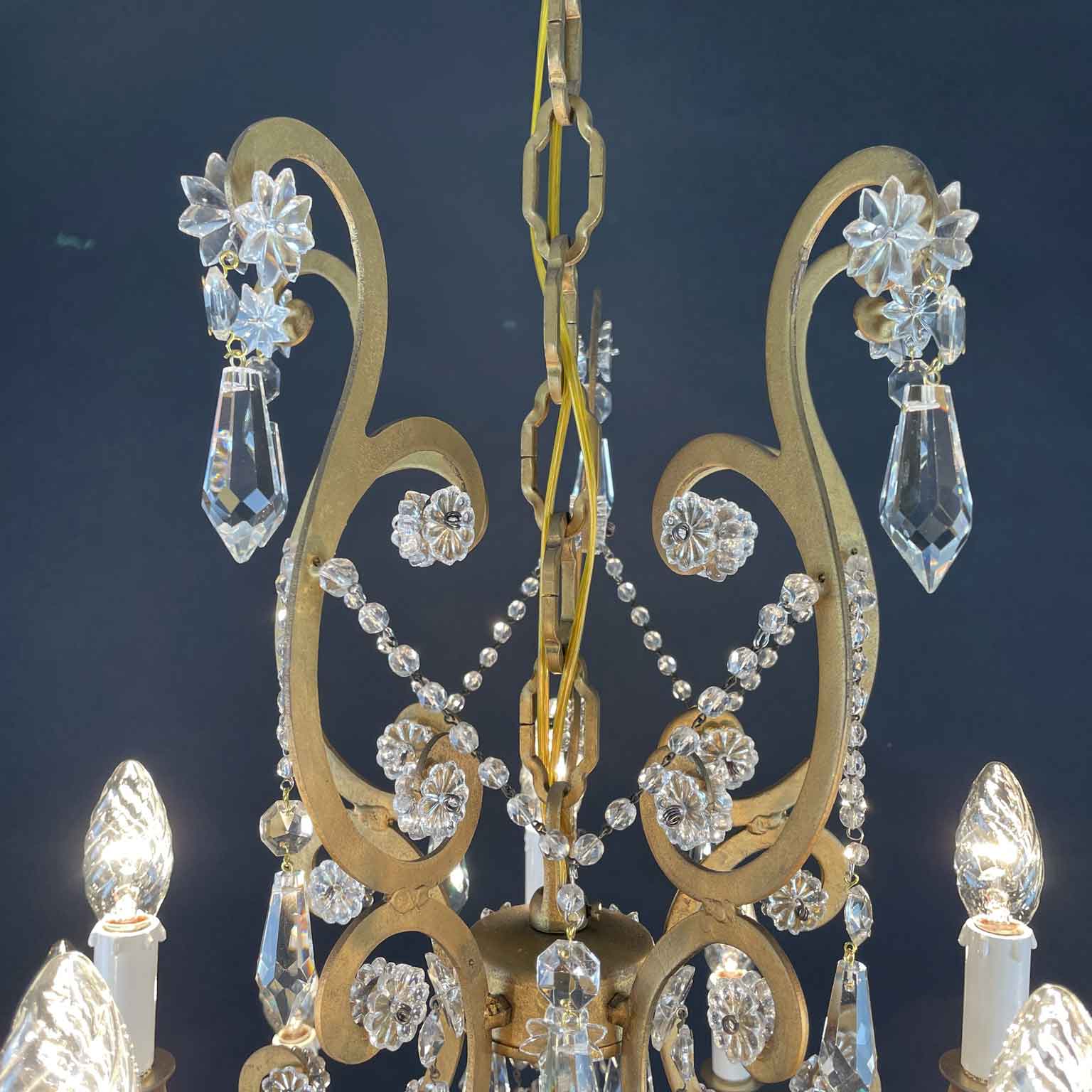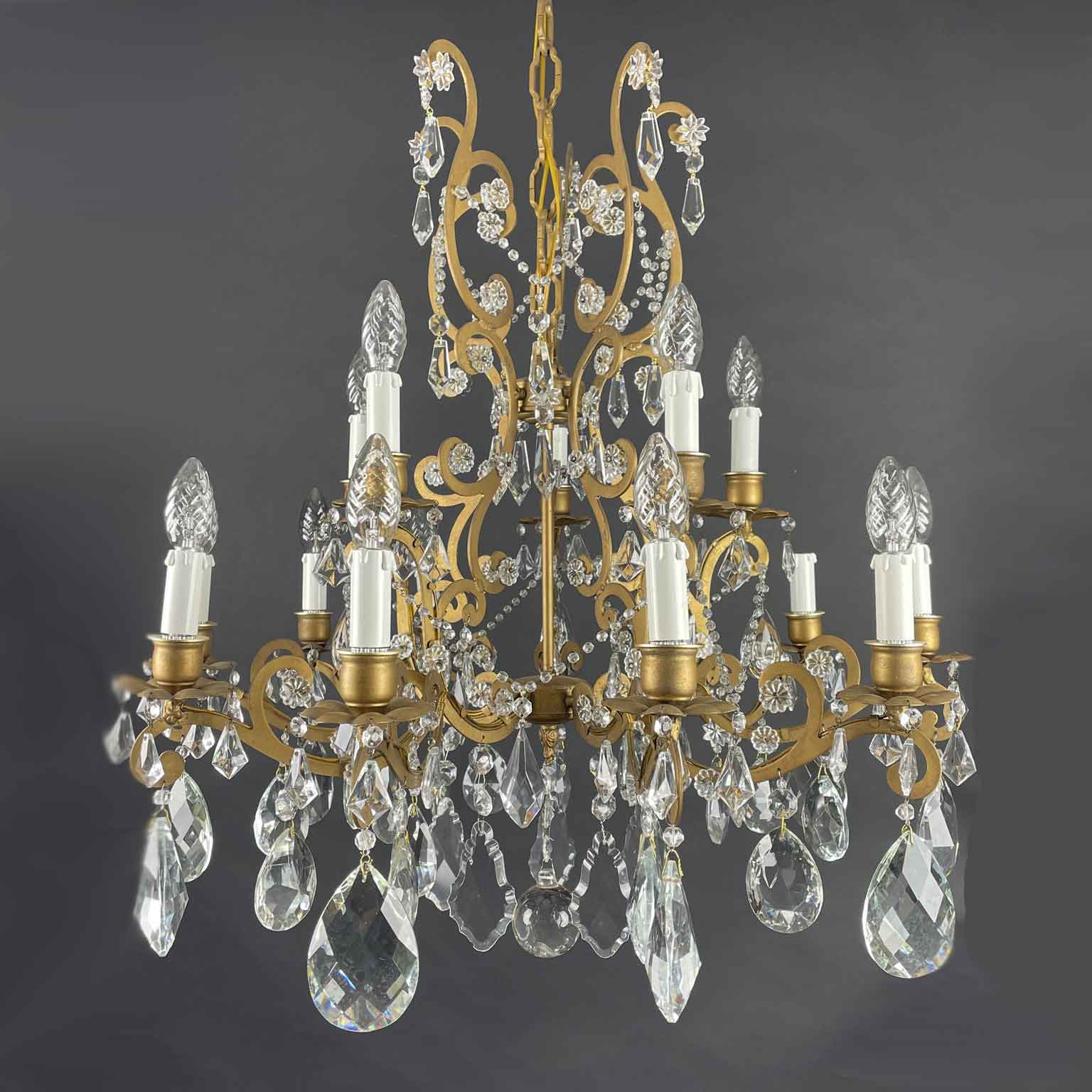 Very light gilt structure, typical of Maria Therese Style, fully dressed with faceted crystal pendants, crystal flowers and crystal beaded chain festoons. Rewired according European standards, it works with 15 Edison 14 light bulbs and is ready to hang.