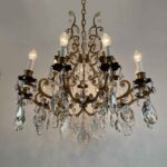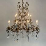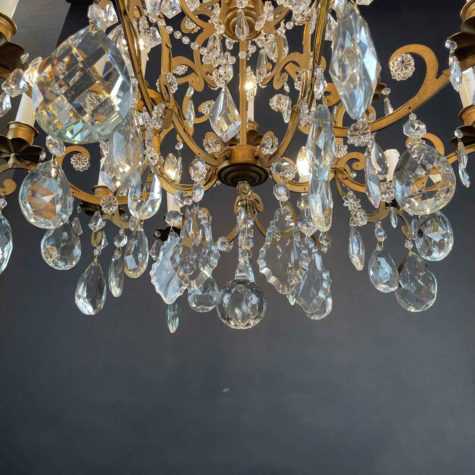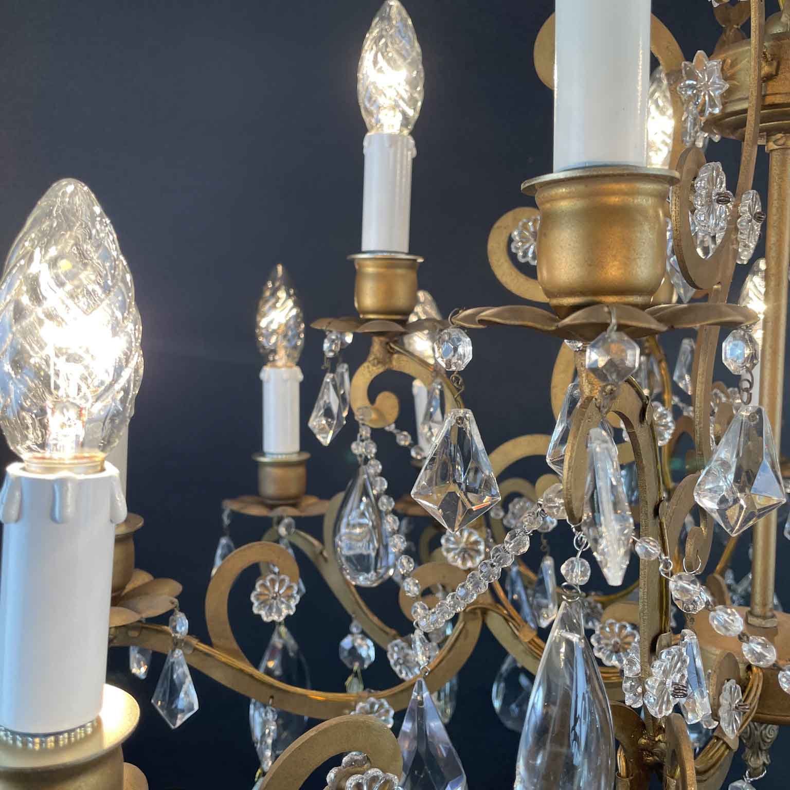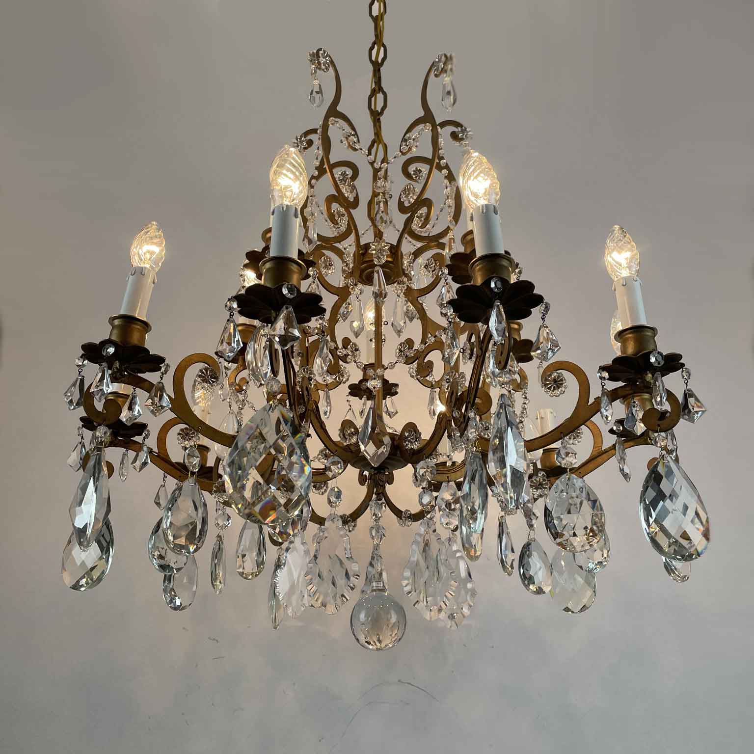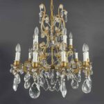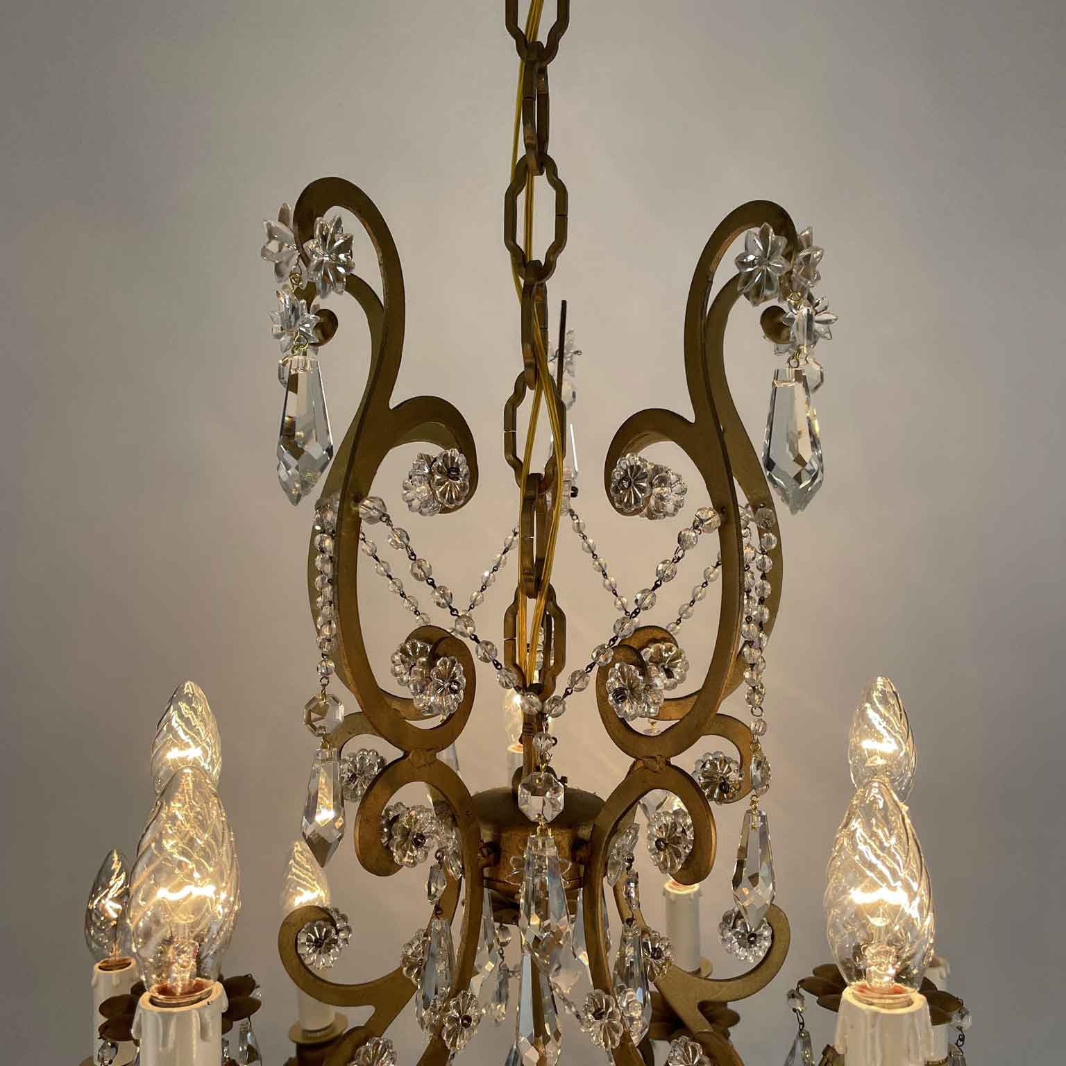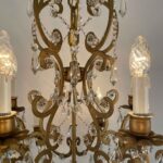 Very light gilt structure, typical of Maria Therese Style, fully dressed with faceted crystal pendants, crystal flowers and crystal beaded chain festoons. Rewired according European standards, it works with 15 Edison 14 light bulbs and is ready to hang.
