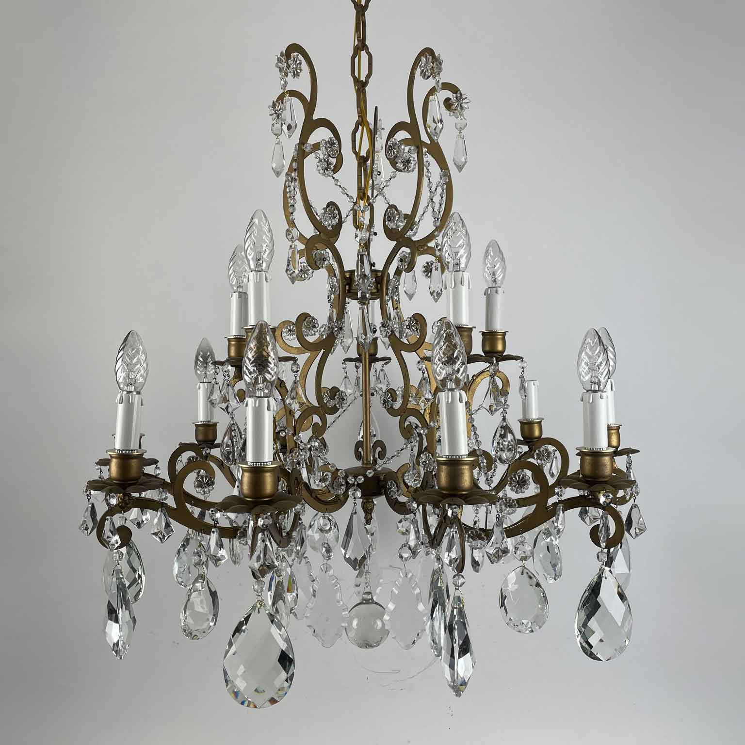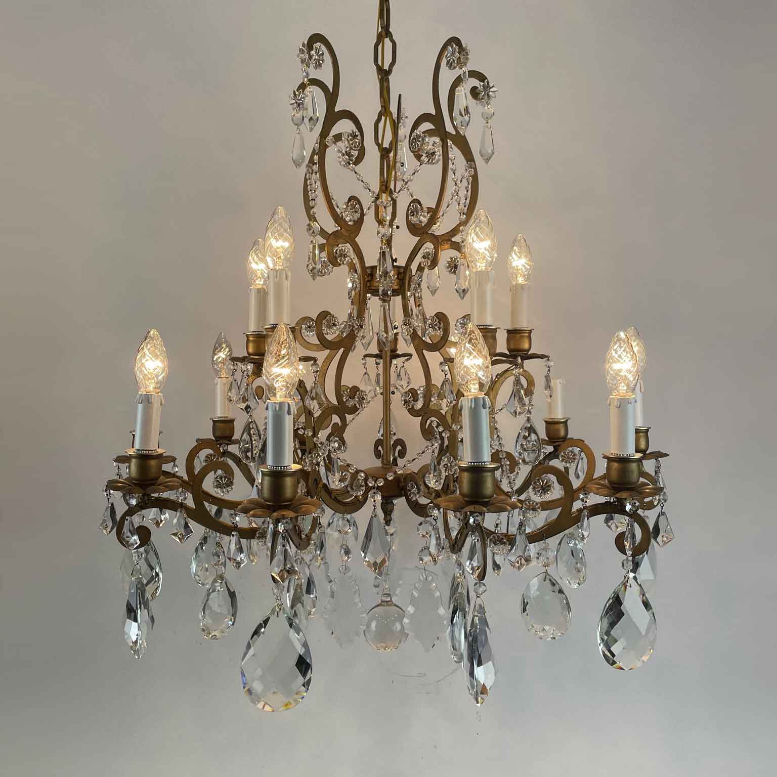 Italian Crystal and Gilded Iron Fifteen-light Chandelier 1950s Marie-Therese Style. Two tiers 15 lights, ten lower light and additional five light in the upper part. curved arms ending with floral shape bobeches.