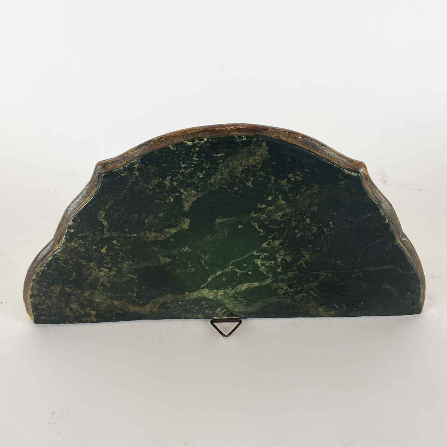 The majolica is framed by a demi-lune structure in wood carved with plant motifs and gilded with pure gold leaf. The upper part, the shaped wooden top of the shelves, is lacquered in dark green faux marble.