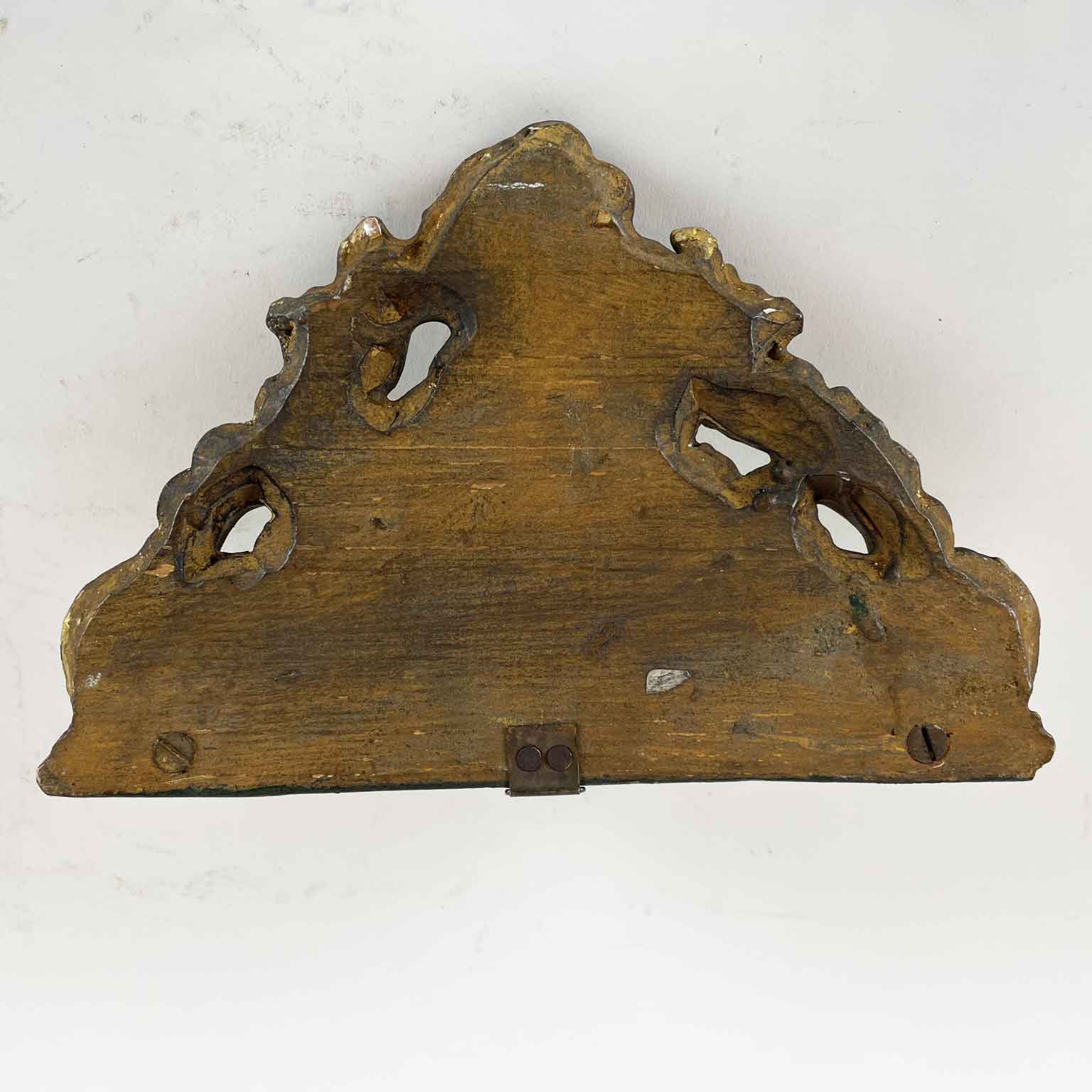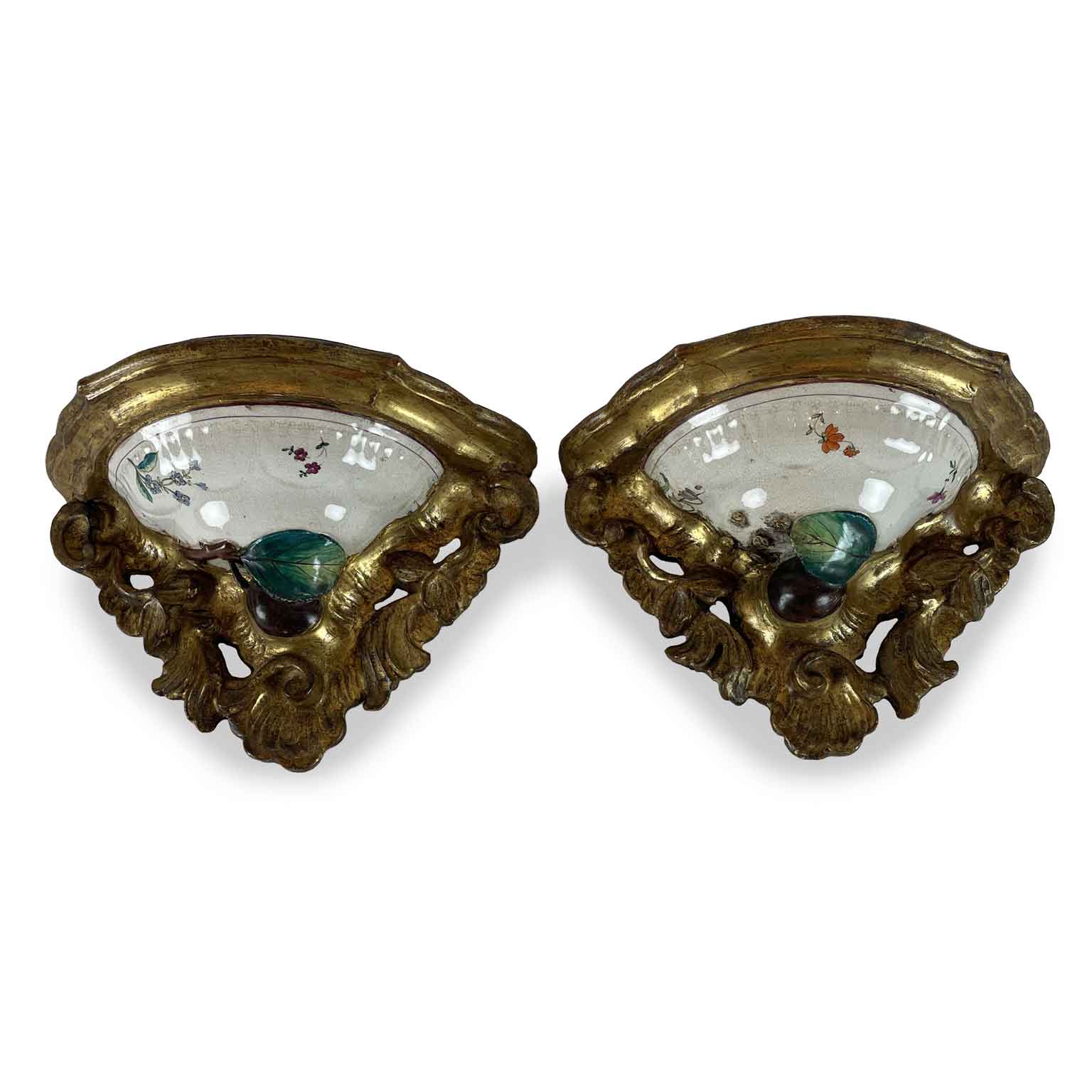 This pair of antique carved and gilded wooden shelves with polychrome majolica from the 1700s were handmade in the 19th century and are in good condition.