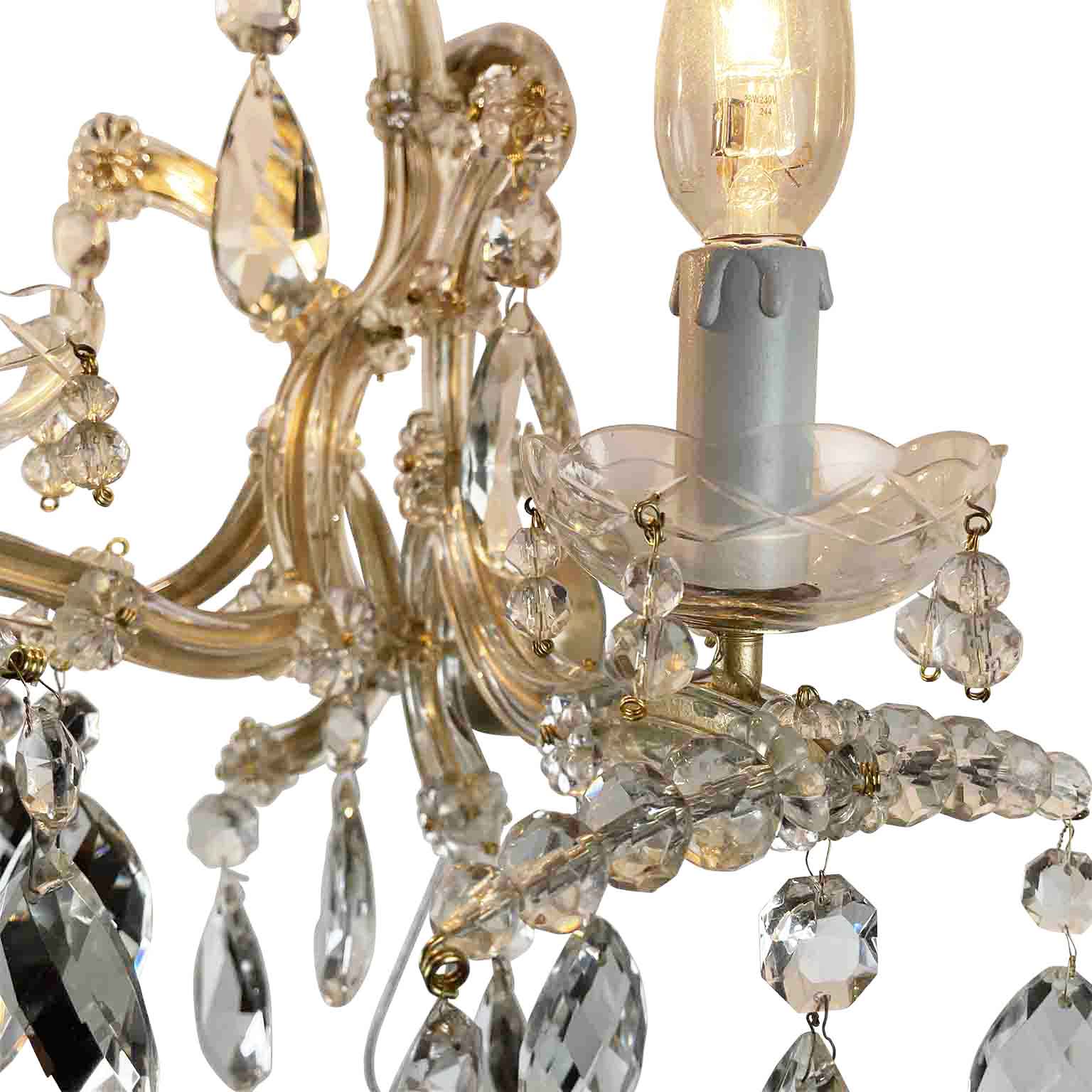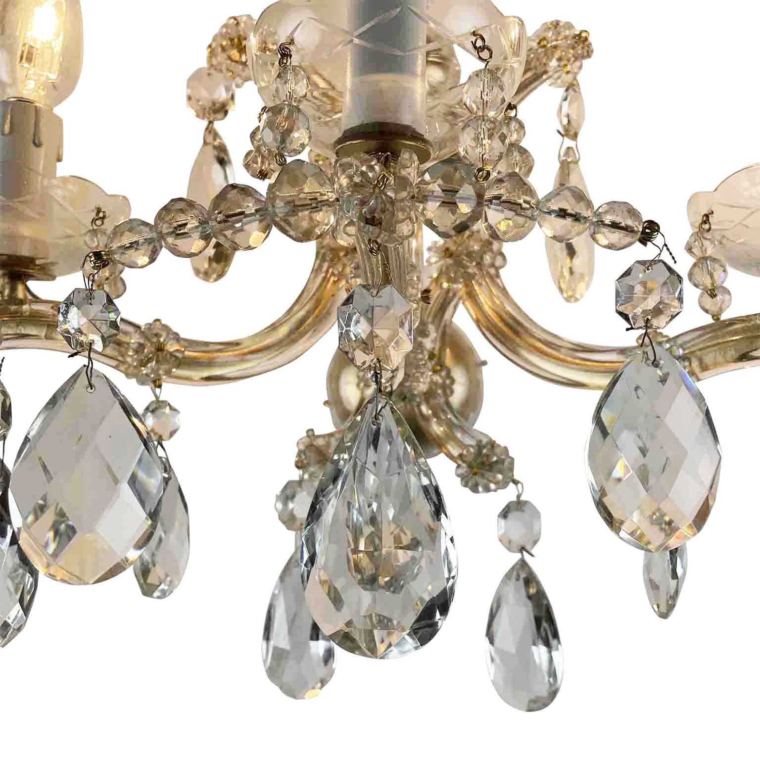 Pair of Italian Crystal Sconces, Three-lights on curved arms, the golden iron structure is fully dressed and decorated by crystal pendants, chains and festoons. Marie Therese Style, dating back to 1950s, in good conditions, rewired for European standards and ready to hang.