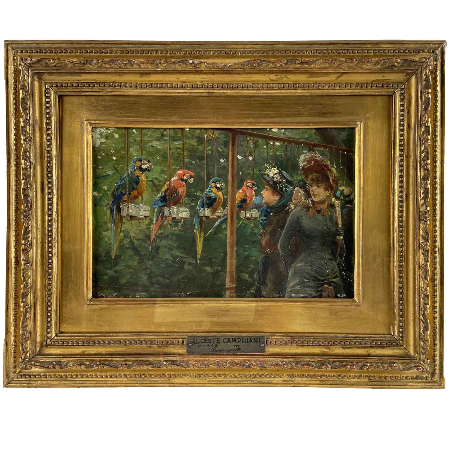 Alceste Campriani Londra Passeggiata del Pappagalli Fine 1800, dipinto ad olio su tavola in legno di pioppo raffigurante la passeggiata dei pappagalli in uno zoo vittoriano di Londra, eleganti signore in abiti tardo ottocenteschi che passeggiano ammirando pappagalli variopinti sui trespoli.