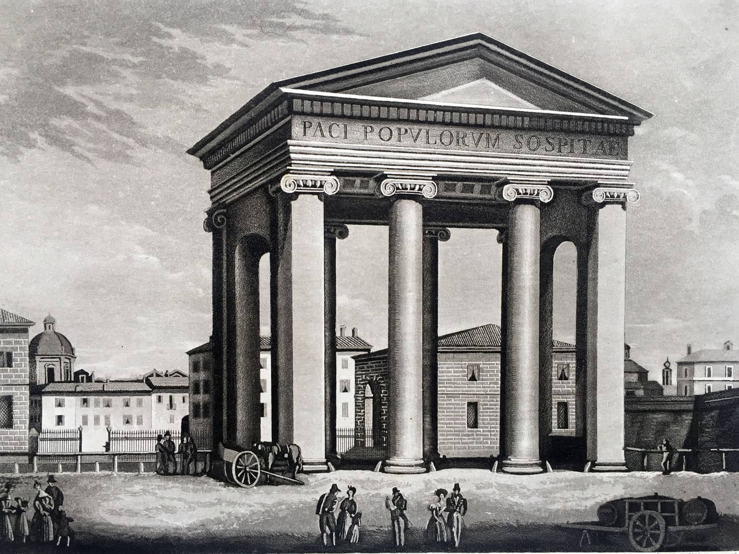 La porta fu progettata da Luigi Cagnola in stile Neoclassico e costruita fra il 1802 e il 1814. Nel 1815, al termine delle guerre napoleoniche vi fu posta l’iscrizione latina «paci populorum sospitae» («alla pace liberatrice dei popoli»).