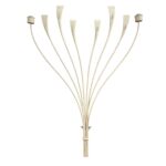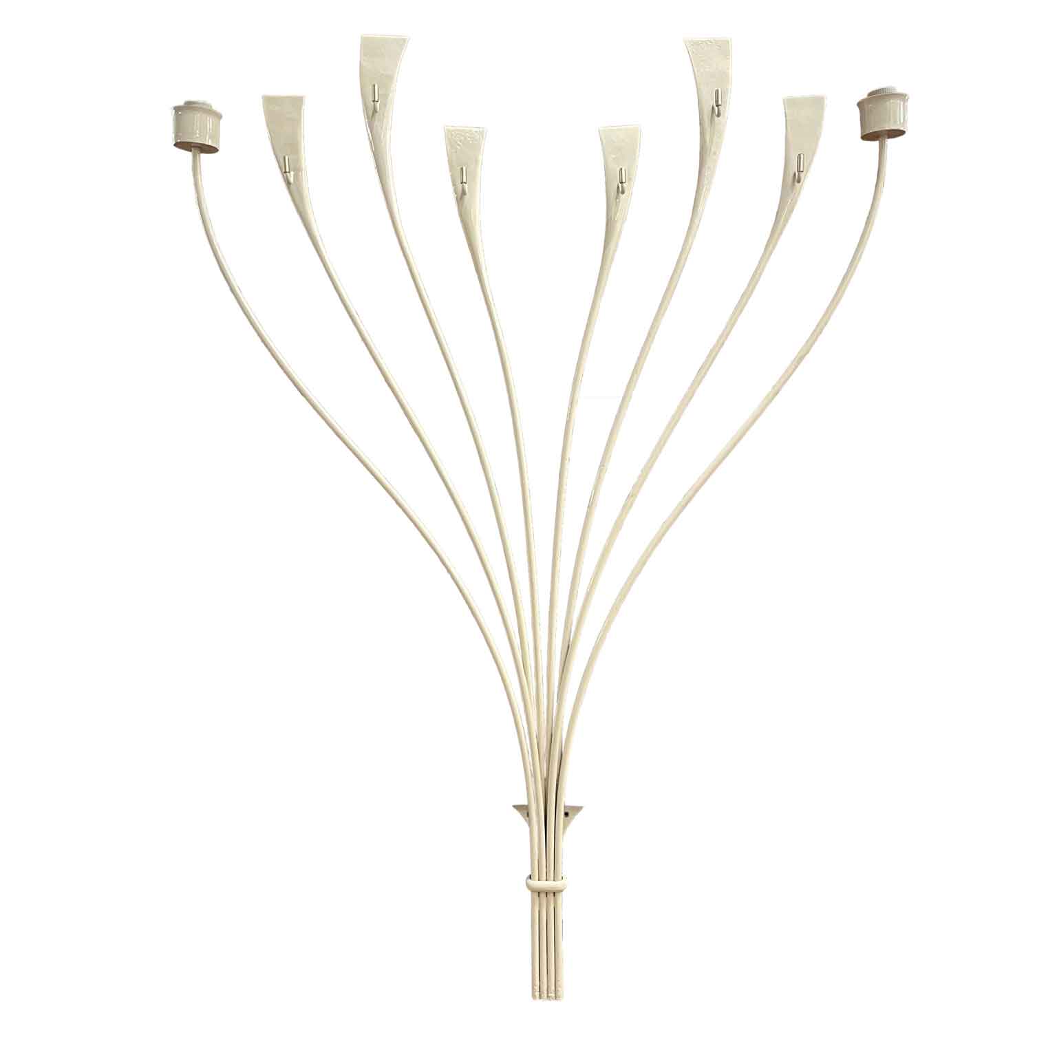 Attaccapanni Con Punti Luce Anni Cinquanta appendiabiti da parete formato da un fascio di otto tubi in ferro sagomato. I sei montanti più interni sono battuti all’estremità superiore dove sono innestati ganci porta abiti con l’estremità risvestita in lamina di ottone mentre i bracci laterali, esterni terminano con portalampade Edison 27 che probabilmente in origine portavano dei vetri. L’appendiabiti è stato riverniciato nel medesimo colore avorio originale ed è stata rinnovata la parte elettrica.