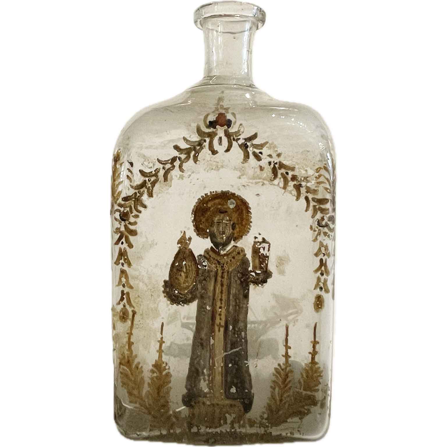 Bottiglia Con La Manna Di San Nicola Fine 1700 realizzata in vetro con decorazioni a freddo a tutto tondo tra le quali la principale è quella del Santo incorniciato da ghirlande di foglie. Nei lati una croce ed una sorta di insegna sempre contornate da fogliami, Nel retro un’imbarcazione. Nell’angolo inferiore sinistro una rottura con relativa filatura. Sul fondo e nella parte superiore interna Vi sono delle incrostazioni calcaree. Sul fondo l’etichetta A.G.G. Subert – S. Pietro All’Orto 26 – Spiga 22 – Milano.