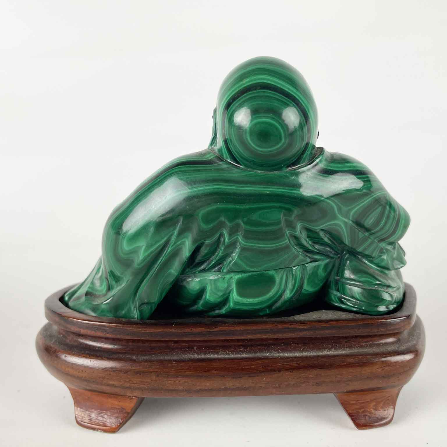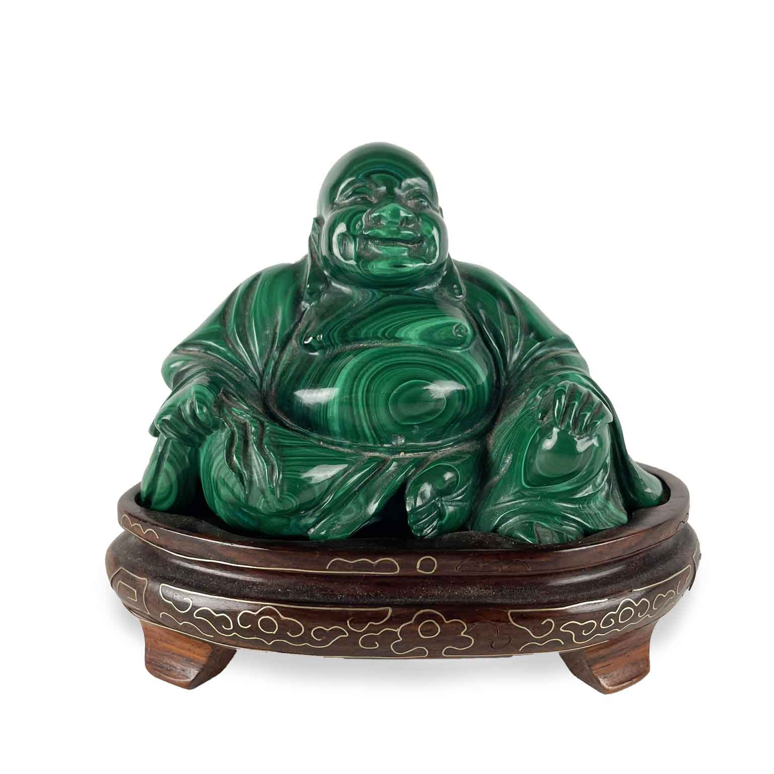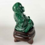 Budai In Malachite Cinese 1950 Circa  è una splendida scultura di Budai, spesso chiamato il “Buddha che ride”, intagliata in un minerale molto particolare chiamato Malachite.