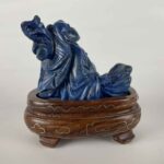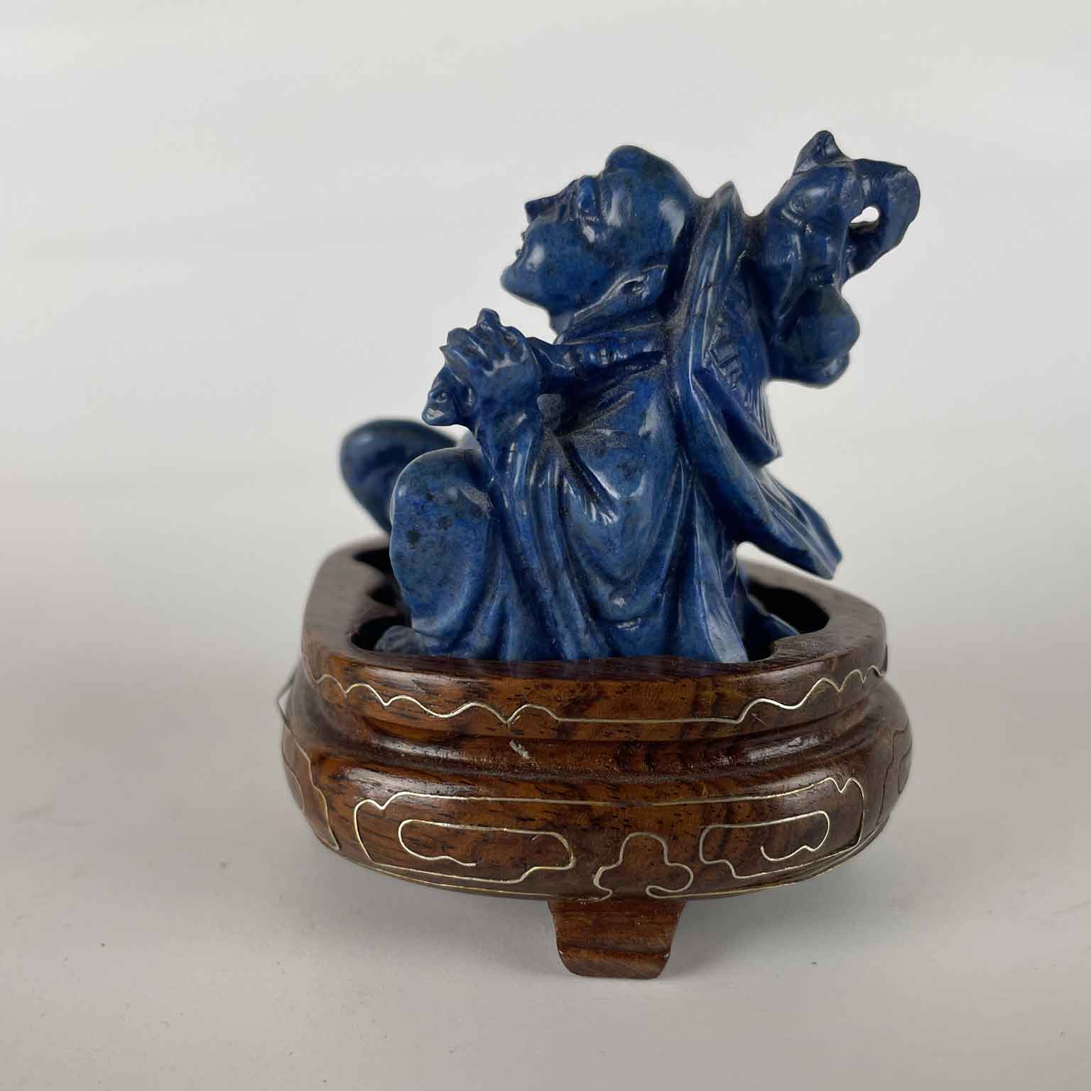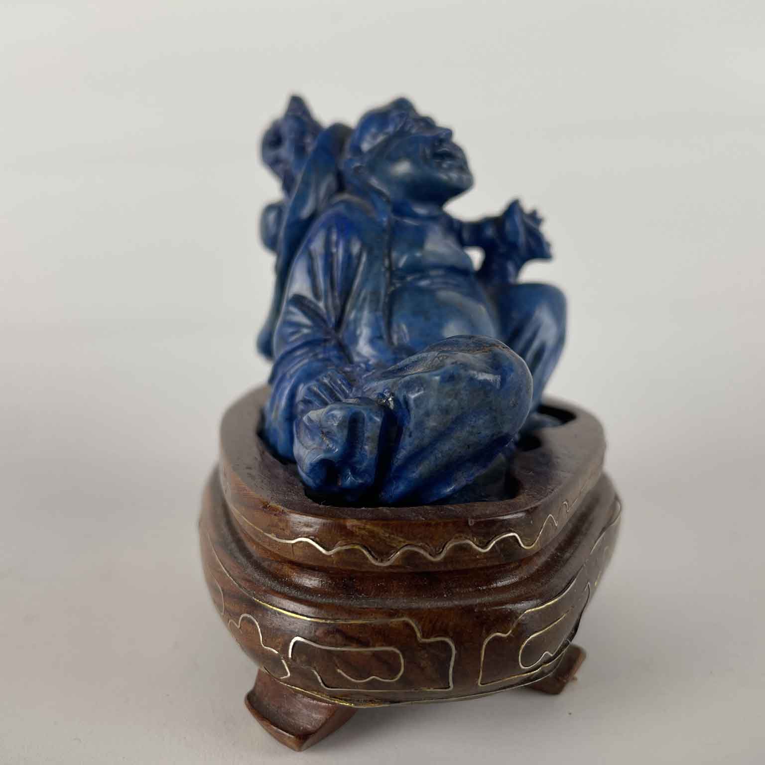 Buddha In Lapislazzuli Di Fattura Cinese Del 1960 Circa appoggiato su di una base  ovale in legno esotico intarsiata con filetti in argento (alcuni mancanti). Il Buddha seduto simboleggia principalmente la meditazione, la pace interiore e il risveglio spirituale ed in questa scultura la serenità è ben evidente. Secondo le credenze taoiste la statua del Buddha attrae le energie positive e posizionandola  all’ingresso assicurerà che le energie negative non entrino in casa. In buono stato Cina 1960.