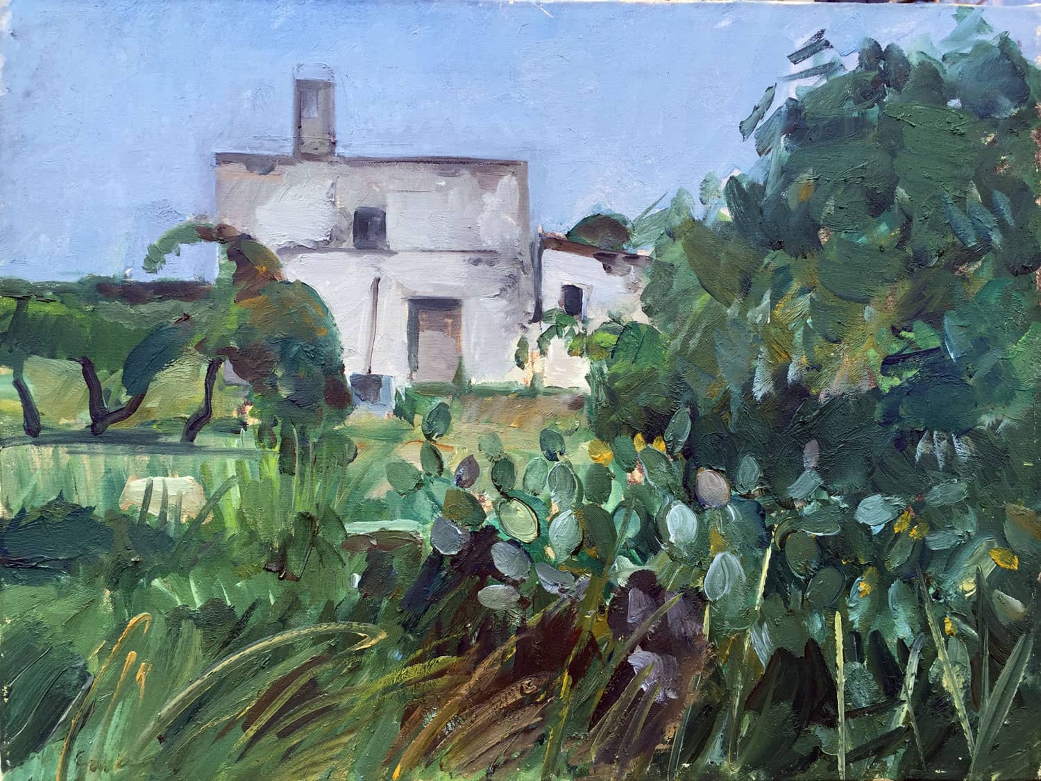 C. Perelli, Campagna Salentina, dipinto ad olio su tela raffigurante una masseria presa dalla campagna, in mezzo ai fichi d’india.  In ottimo stato di conservazione, questo rigoglioso paesaggio pugliese dipinto intorno al 1970 circa,  proviene da una collezione milanese e si presenta entro cornice moderna.