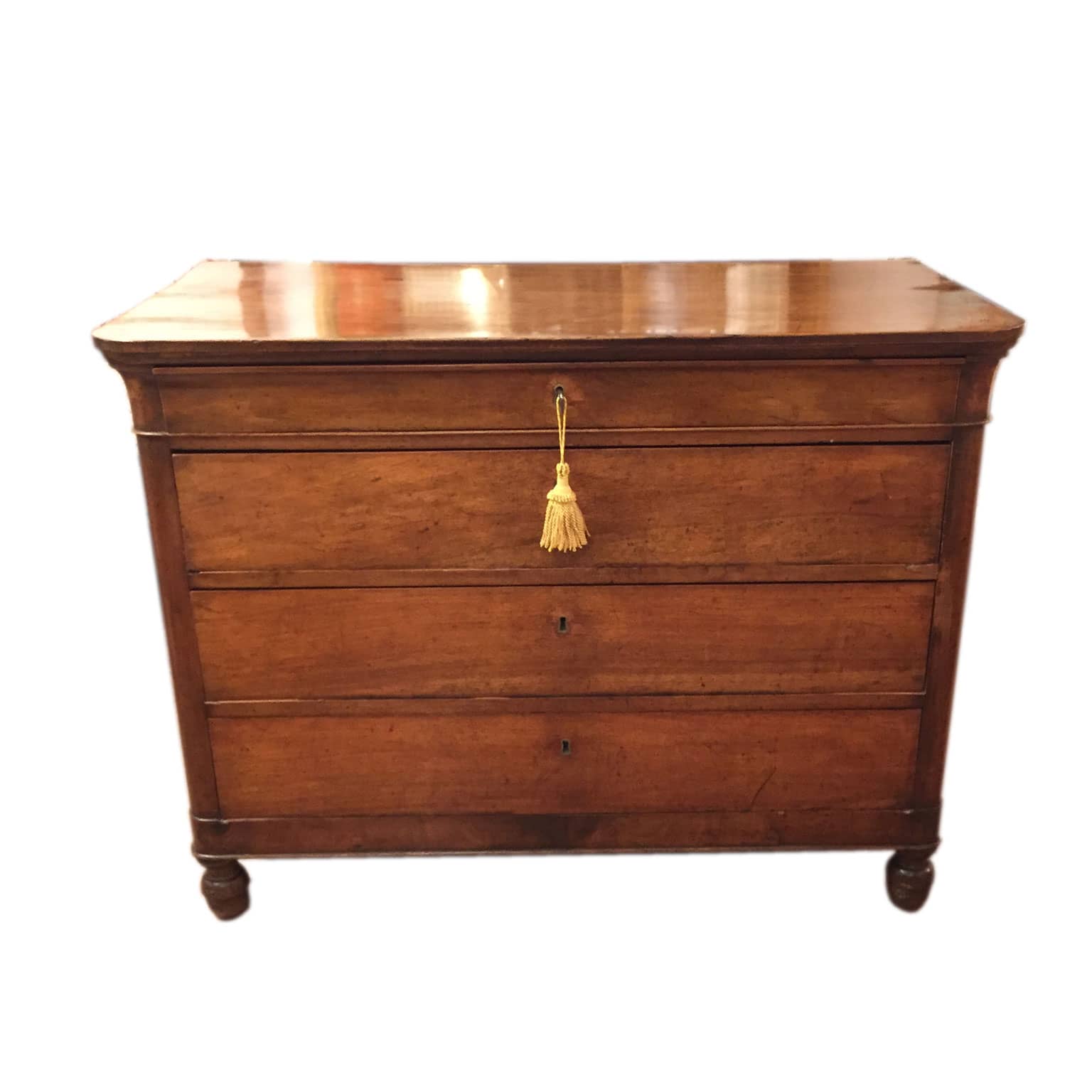 Cassettone Luigi Filippo in Noce del 1880 circa in buono stato di conservazione, con tre grandi cassetti ed uno di misura ridotta sotto il piano. Degna di nota in questo mobile è la qualità del legname utilizzato; il piano infatti è stato costruito con un’unica tavola di noce. Sono della stessa essenza anche gli interni dei cassetti e le fodere della schiena del cassettone. Le serrature sono funzionanti.