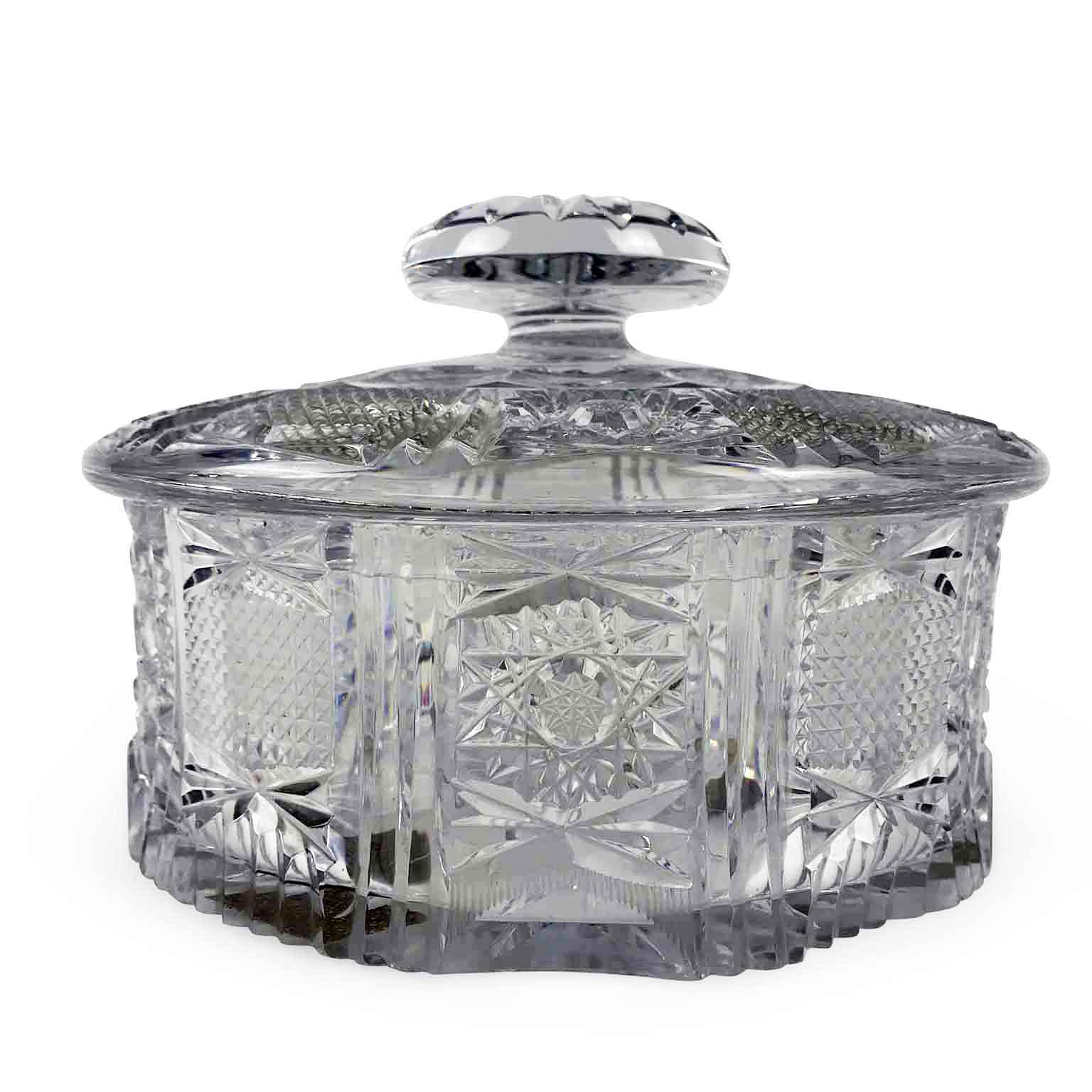 Ciotola Portadolci con Coperchio in Cristallo Molato con un grande pomolo e dieci riquadri ripetuti sia sul coperchio che sul bordo fittamente intagliati con decorazioni geometriche. In buono stato, presenta una piccola sbeccatura sul bordo. 1950 circa.