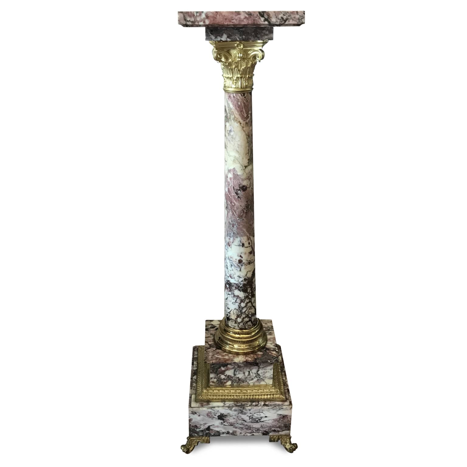 Colonna Portavaso in Marmo di Serravezza e Bronzo Dorato 1800 elegante piedistallo con base gradinata e quadrata, poggiante su piedini a ricciolo, con raffinate cornici con decorazioni geometriche, fusto circolare sormontato da un capitello corinzio con una rifinitura a cesello di ottima qualità ed una superba doratura al mercurio. La colonna è Fior di Pesco di Seravezza o breccia medicea, un marmo raro e prezioso dalle sfumature violette proveniente dalle Apuane, da Seravezza.