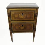 Il piano è in noce, lastronato e profilato da cornici in massello. I fianchi di questo antico comodino sono decorati con intarsio a motivi geometrici e greche mentre sul fronte i due cassetti sono centrati da medaglioni ornati con strumenti musicali. Molteplici sono le essenze utilizzate per realizzare questo intarsio che crea un raffinato effetto cromatico grazie al contrasto armonico dei vari toni del legno; troviamo infatti legni policromi, bois de rose, noce, pero ebanizzato, acero, bosso e ciliegio. Anche i piedi troncopiramidali sono decorati.