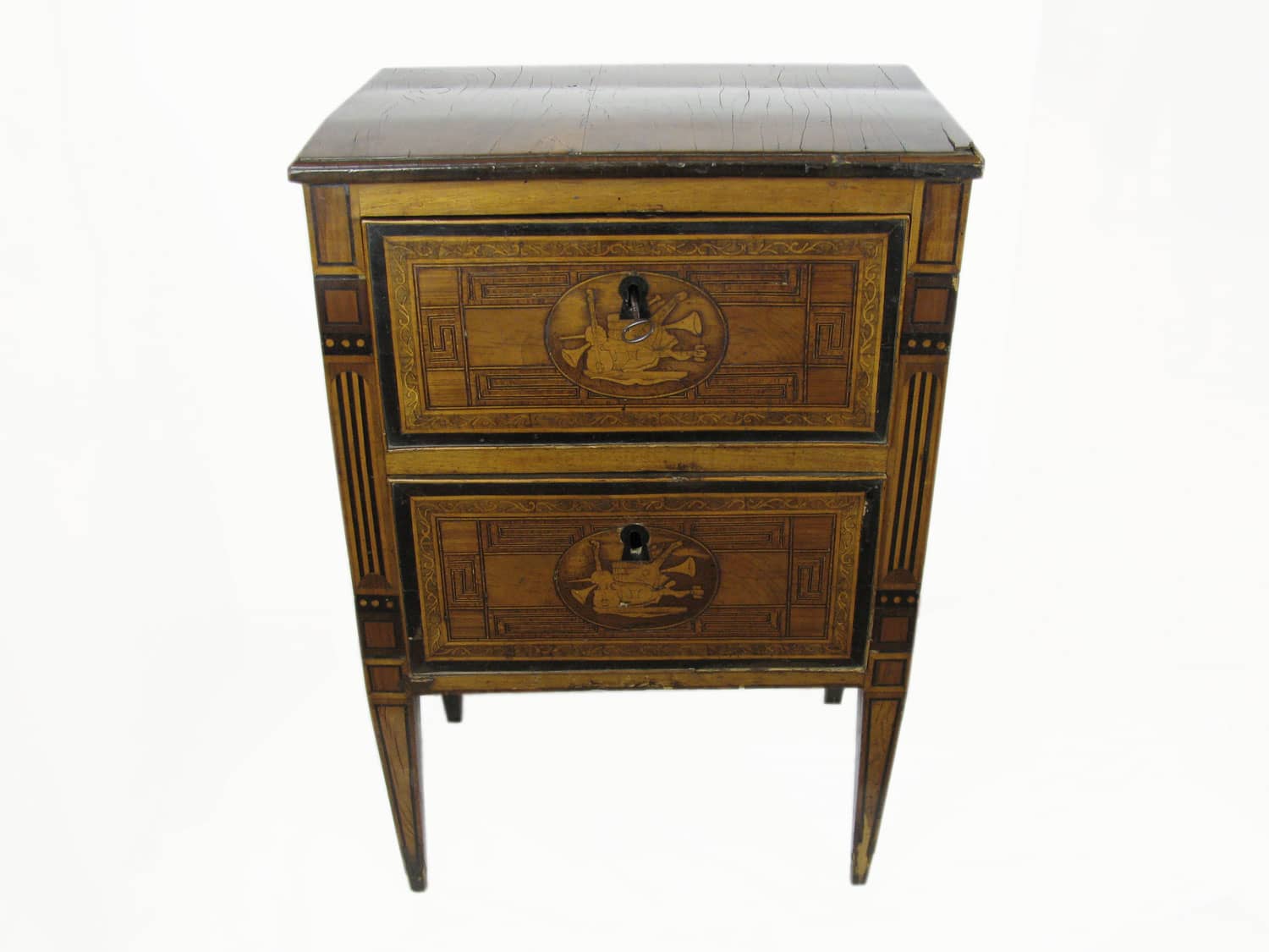 Comodino lastronato Luigi XVI d’epoca con due cassetti intarsiati con strumenti musicali riquadrati da greche geometriche. Da restaurare, risale alla fine del Settecento.