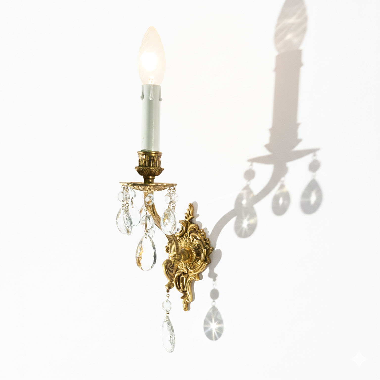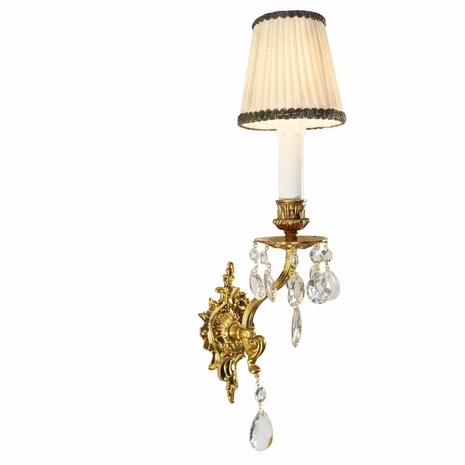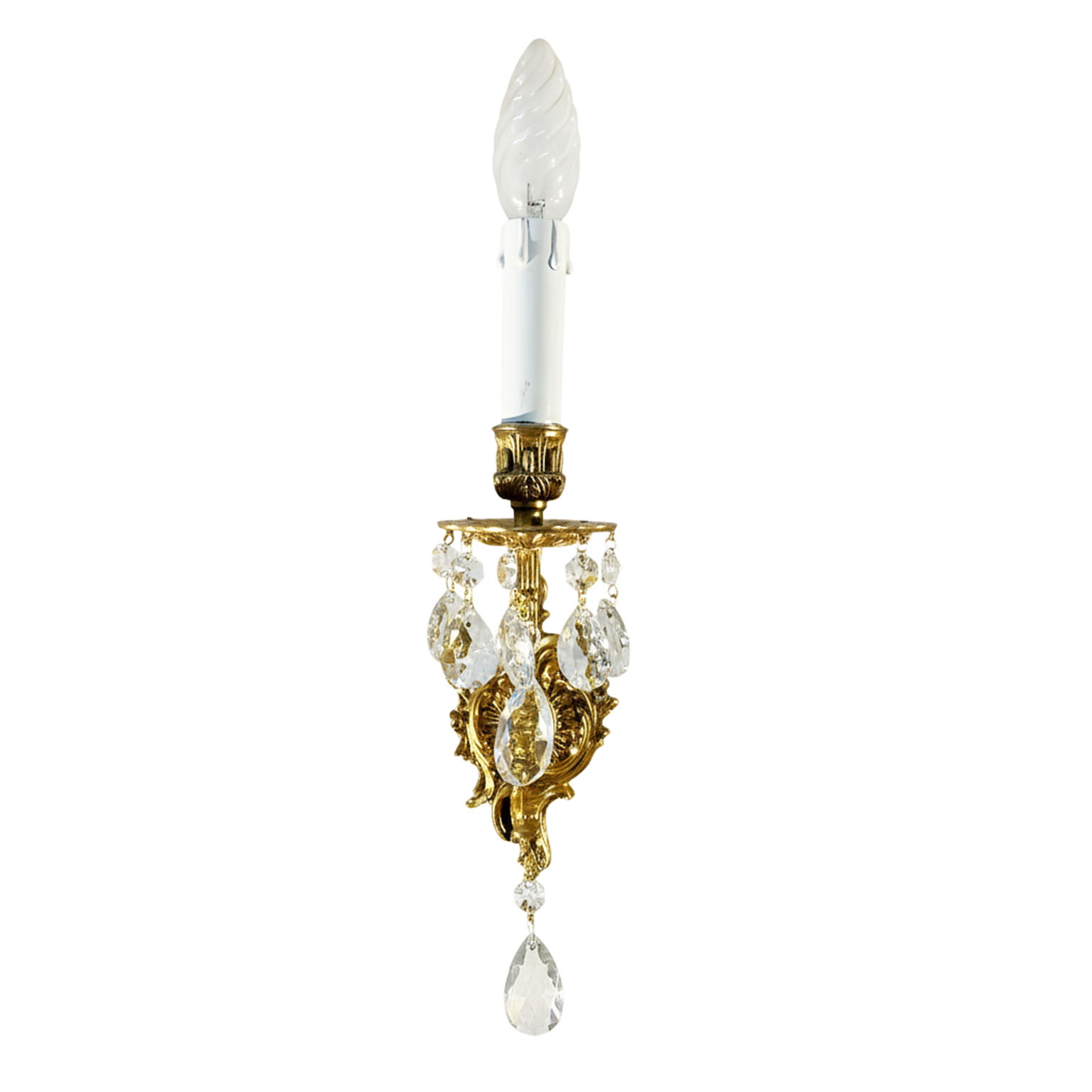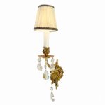 Coppia Appliques In Bronzo E Cristallo A Una Luce costituite da una fusione in bronzo decorata con pendenti in cristallo. Con una candela in legno laccato c’è una luce E14 per una potenza massima di 100 Watt. in Ottimo stato con la parte elettrica completamente rifatta. L’applique si monta tramite due tassellini nel muro. Italia 1970 circa. I paralumi plissettati nella foto sono quelli originali: sono disponibili ma un pò vetusti.
