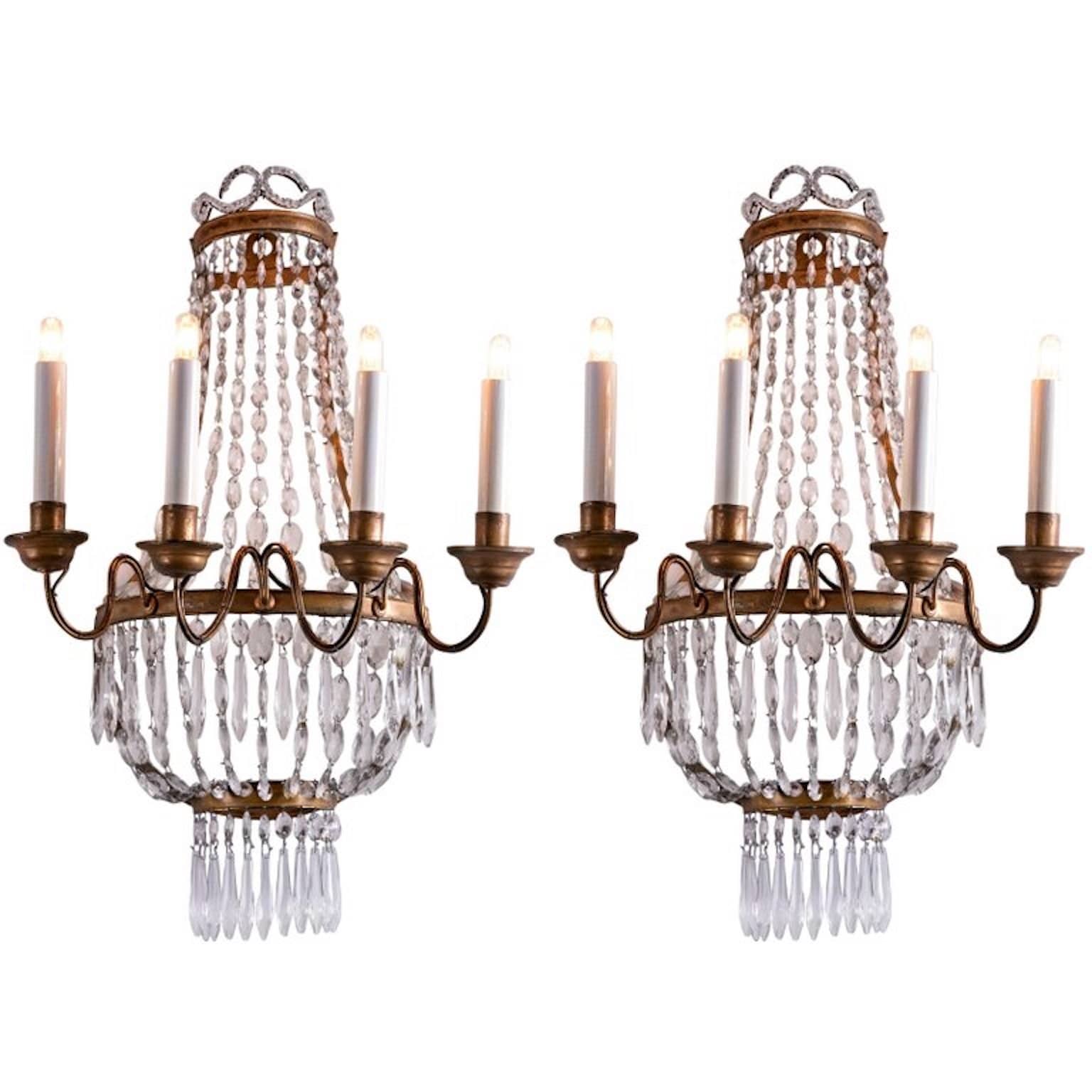 Coppia di appliques antiche  Impero in cristallo,  con struttura a mongolfiera in ferro dorato, con quattro luci innestate sul semicerchio di base.