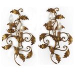 Coppia Di Appliques In Ferro Dorato 1960 circadalla linea morbida e sinuosa, due luci da parete realizzate a motivi fogliati, composte da tralci a ricciolo formati da tondini in ferro battuto dai quali dipartono numerose foglie sempre in ferro con le nervature incise. Su questi racemi vi sono i due punti luce idonei per lampadine Edison 14 montate su due candeline in legno. Risalgono al 1960 circa e sono in buono stato funzionanti.