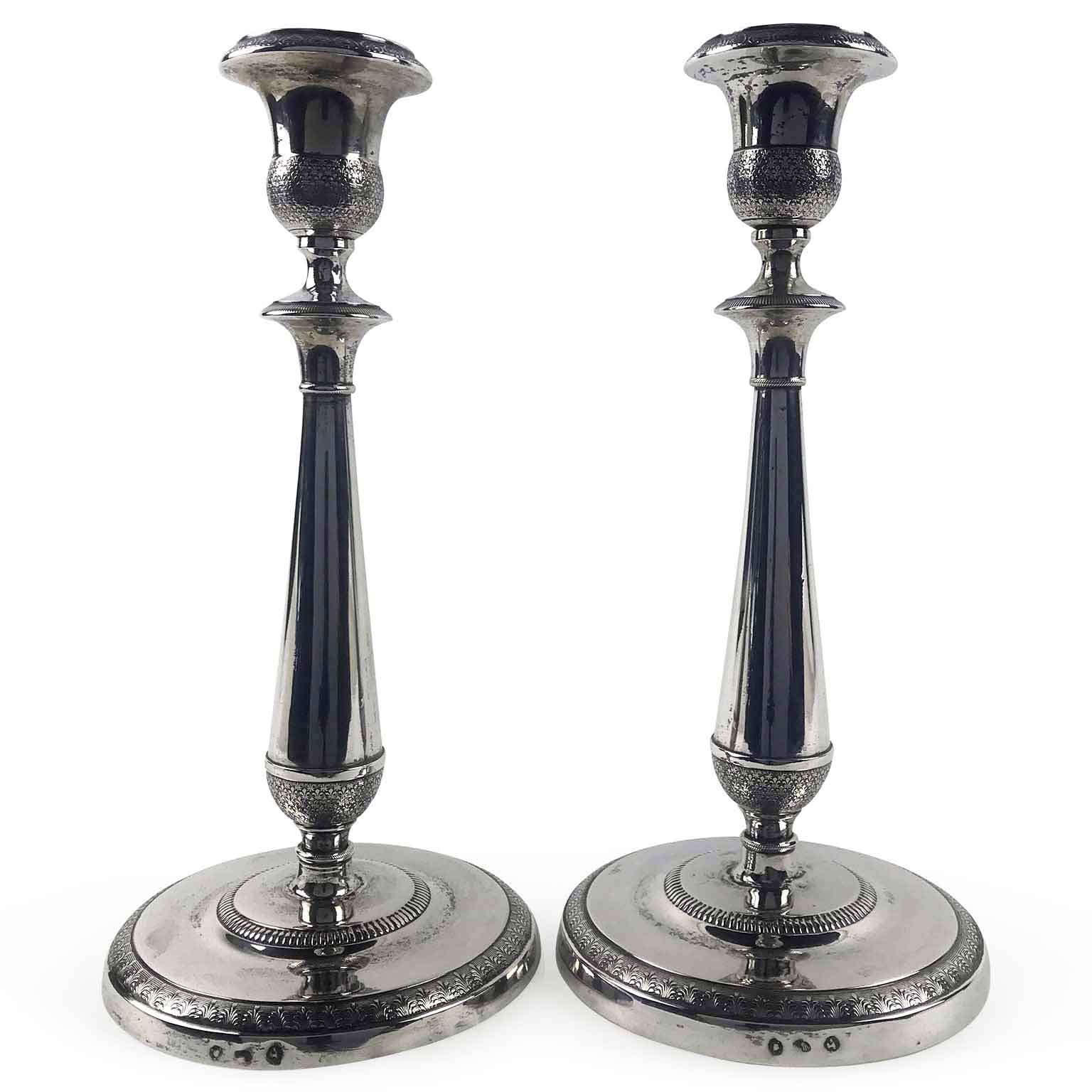 Coppia di Candelieri Antichi in Argento Venezia pesano rispettivamente grammi 354 e 335. Dalla linea essenziale sono realizzati in lamina di argento decorata da fasce di palmette su fondo zigrinato e da un’altro motivo costituito dal ripetersi di una moltitudine di gigli fiorentini. Sulla base, sul fusto e sull’imposta della candela terminale troviamo i marchi del Regno Lombardo Veneto del Mondo Stellato (punzone per grossi lavori per il secondo titolo a 800/000 di argento)e quello dell’Ornamento di Poppa (punzone distintivo dell?ufficio di Garanzia di Milano) e dell’argentiere Fantini Giovanni attivo in Venezia in San Marco n. 840 intorno al 1811 con il punzone di un Leone sopra la lettera F in campo tondo. Sul fondo nella parte interna di uno dei due troviamo una ciappolatura.