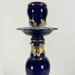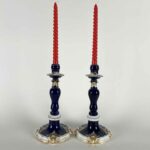 Coppia di Candelieri Meissen Blu e Oro XIX Secolo in porcellana risalenti alla prima metà del 1800.  I candelabri sono in un ricco blu cobalto e bianco, con un’elegante decorazione a volute dorate e foglie d’acanto.  I portacandele sono in buone condizioni conservative senza rotture o sbeccature.