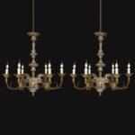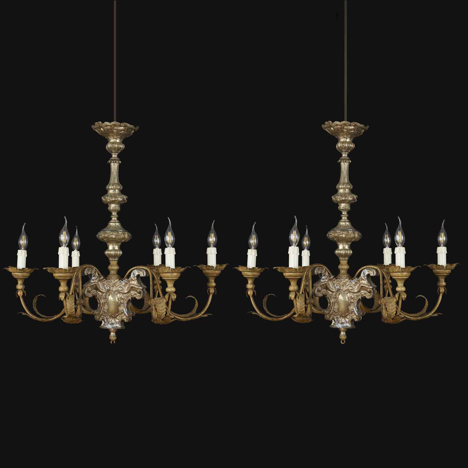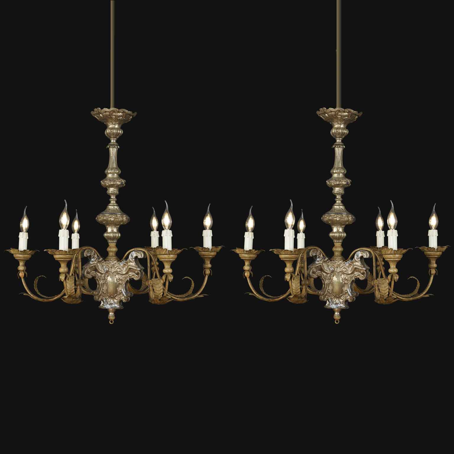 Ricavati da due candelieri d’altare in rame argentato e sbalzato, questi lampadari del 1700 sono stati abilmente arricchiti da sei bracci in ferro battuto, curvi e foliati. Gli elementi in rame presentano una raffinata lavorazione a sbalzo in stile Luigi XV, sono argentati con amalgama di mercurio e presentano alcune saldature a stagno come documentato nella galleria fotografica.