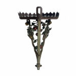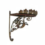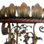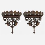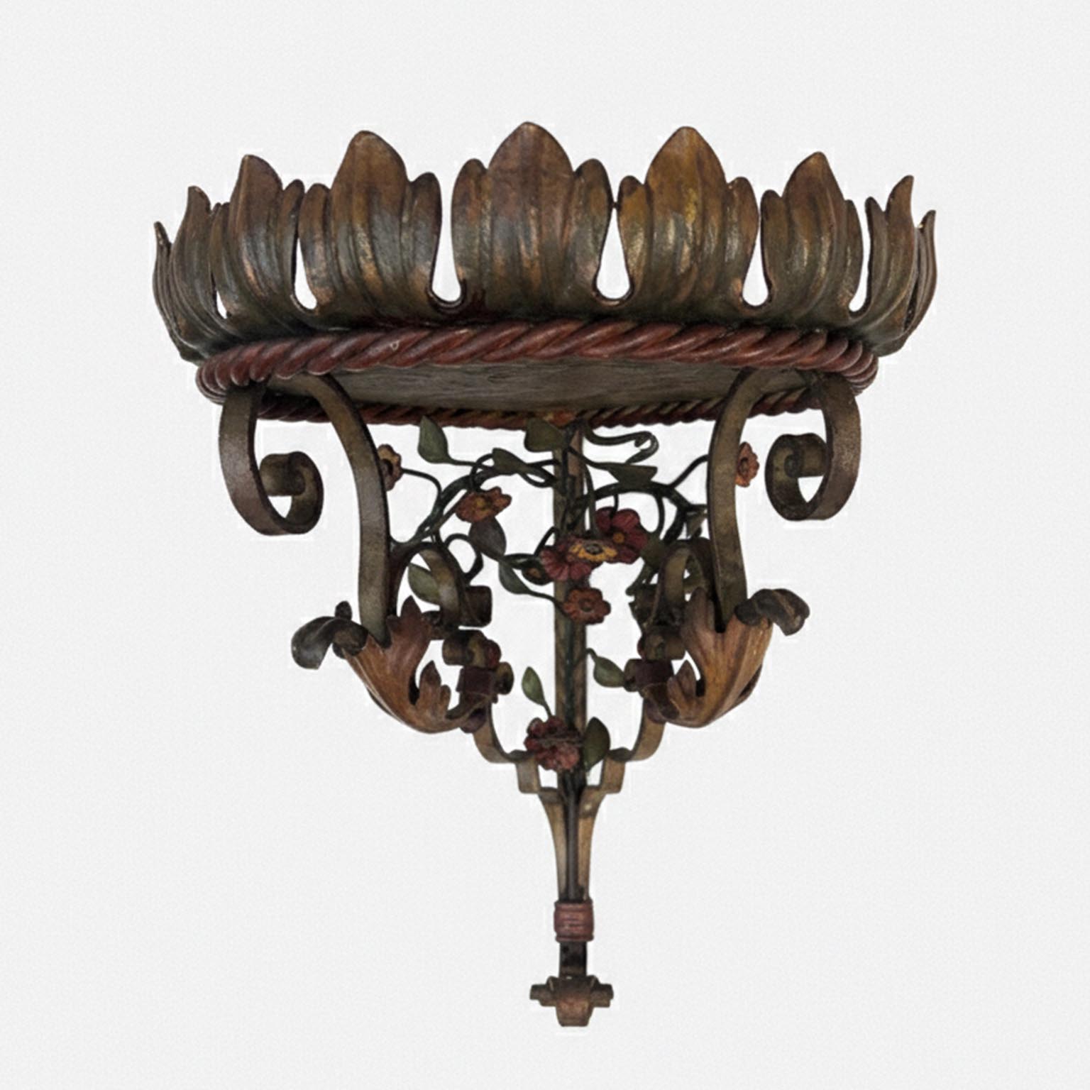 Coppia Di Mensole Angolari In Ferro Battuto Policrome Primi 1900 composte da un piano in lamiera con il bordo profilato da una cordonatura a torciglione e decorato da una ringhiera di foglie d’acanto in lamiera sbalzata. La mensola è formata da due volute in piattina di ferro tenute da fascette e ribattini al cui centro si innestano dei ramoscelli di fiori e foglie. Sono realizzate a mano e laccate nei toni dei verdi, dei bruni e dei rossi. Sono un manufatto italiano di epoca Liberty e risalgono ai primi decenni del 1900. Provengono da una collezione privata milanese e si presentano in buono stato di conservazione. Possono esser fissate al muro mediante un gancio centrale nel montante ad angolo.