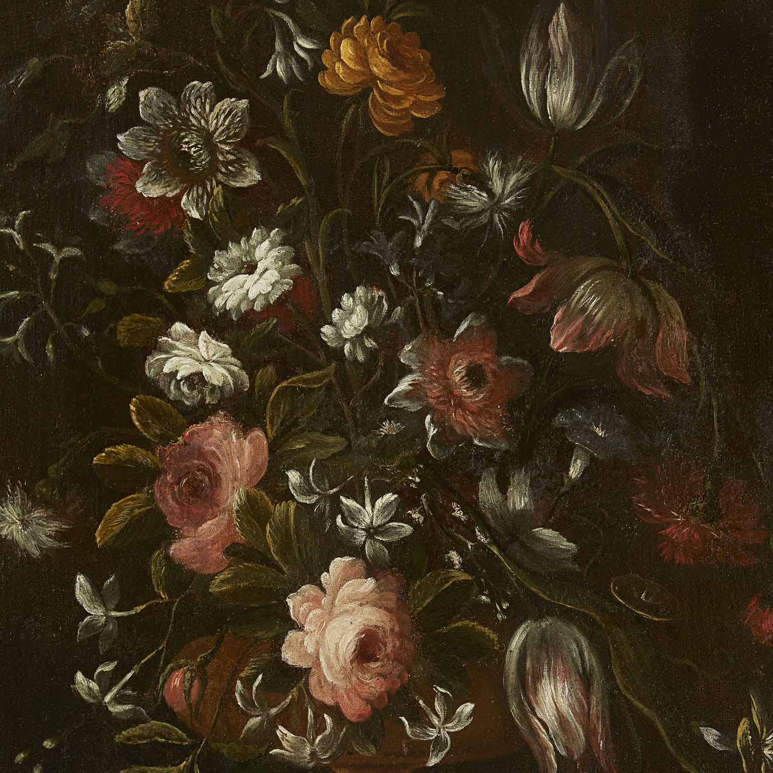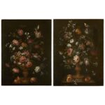 Scuola italiana,  questa coppia di antiche nature morte di fiori risale alla metà del XVII secolo e presenta vecchi restauri ed imperfezioni ma sono in buono stato di conservazione; sono state foderate e riportate su di un nuovo telaio una settantina di anni fa ed a quell’epoca sono stati eseguiti ritocchi pittorici . Si presentano senza cornice. Provengono da una collezione privata milanese.