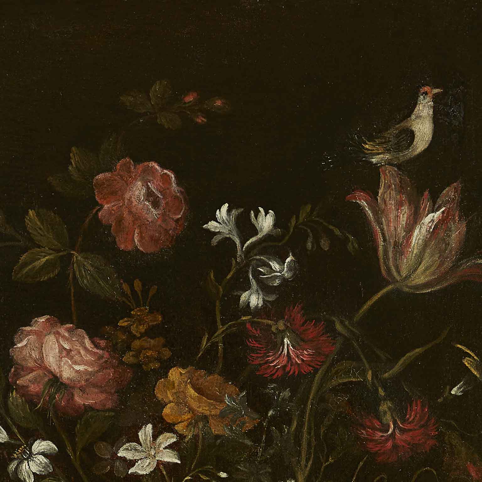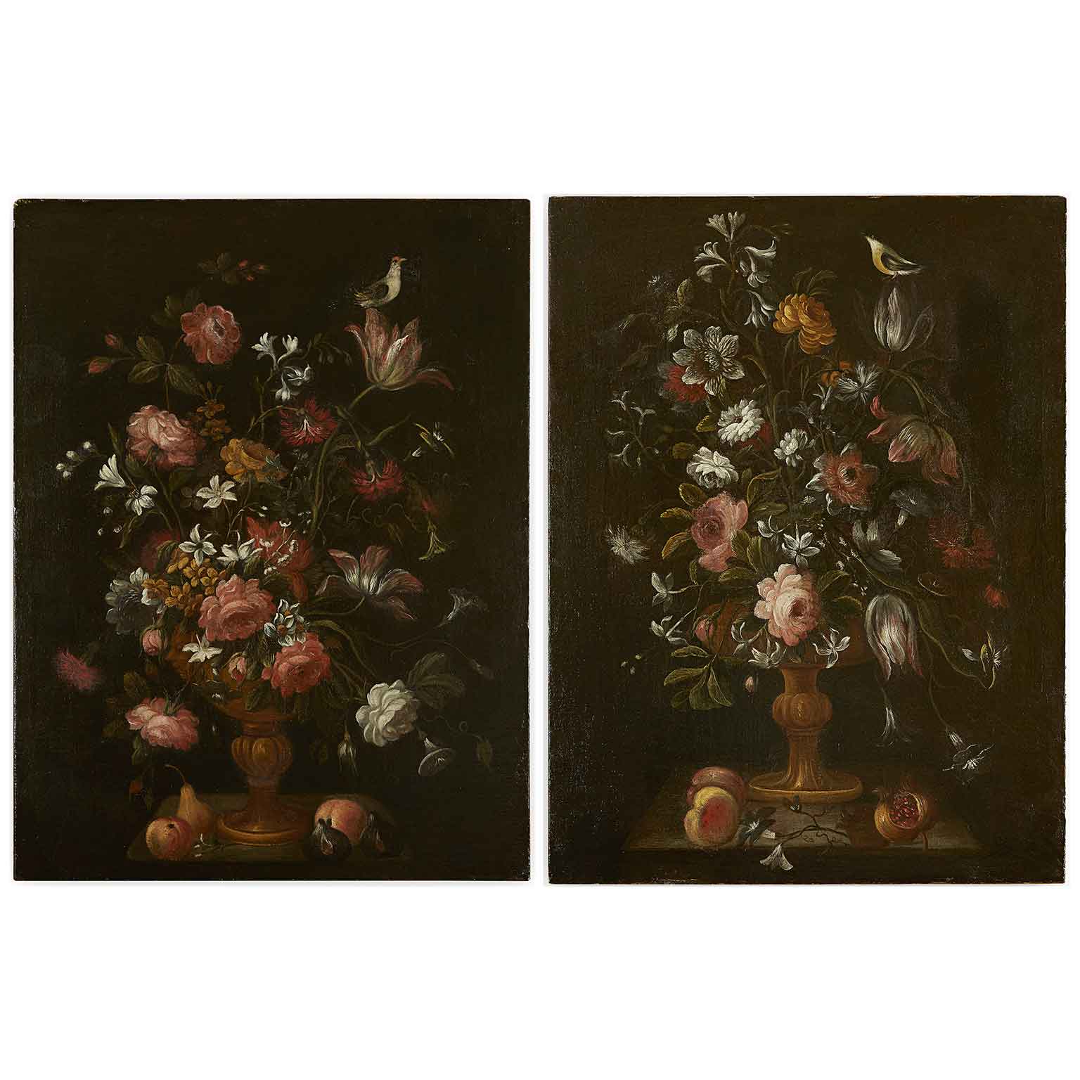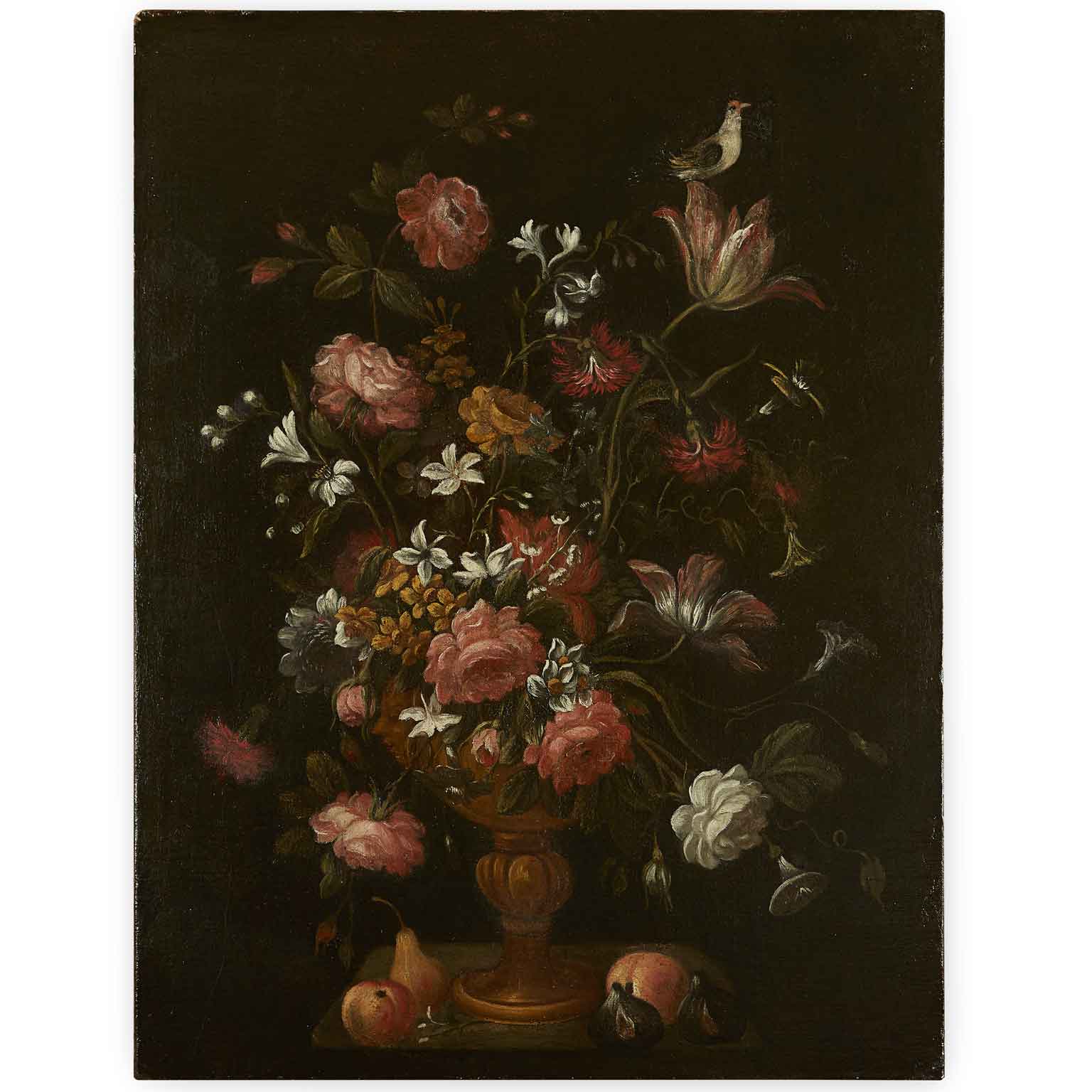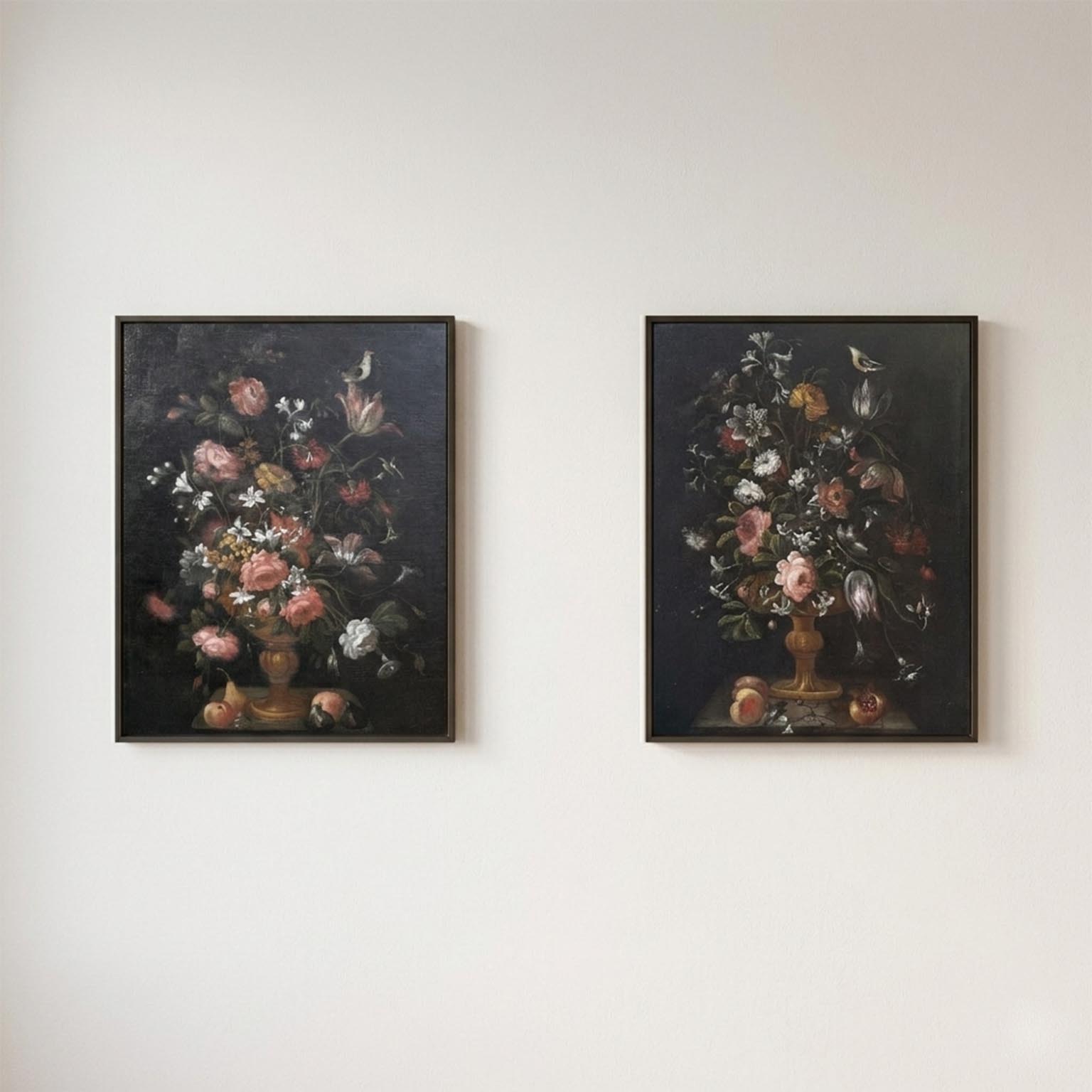 Coppia di Nature Morte di Fiori del 1600 di scuola italiana del XVII secolo, senza cornice.  Dipinti ad olio su tela con sfondo scuro e fiori finemente definiti queste nature morte barocche di scuola italiana sono caratterizzate da un buon equilibrio compositivo, la composizione è ben bilanciata disposta secondo uno schema piramidale con fiori di vario tipo entro un vaso, frutta alla base e uccelli nella parte superiore. Tipica dell’epoca seicentesca era appunto, nell’ambito della natura morta di fiori, lo studio e a rappresentazione di piante di ogni specie, ma anche di fantasia. I colori sono caldi con sfumature di rossi e bianchi senza contrasti, tutti estremamente delicati e morbidi.