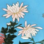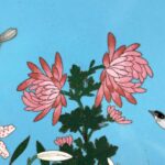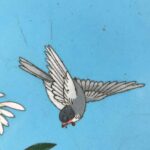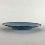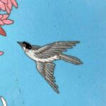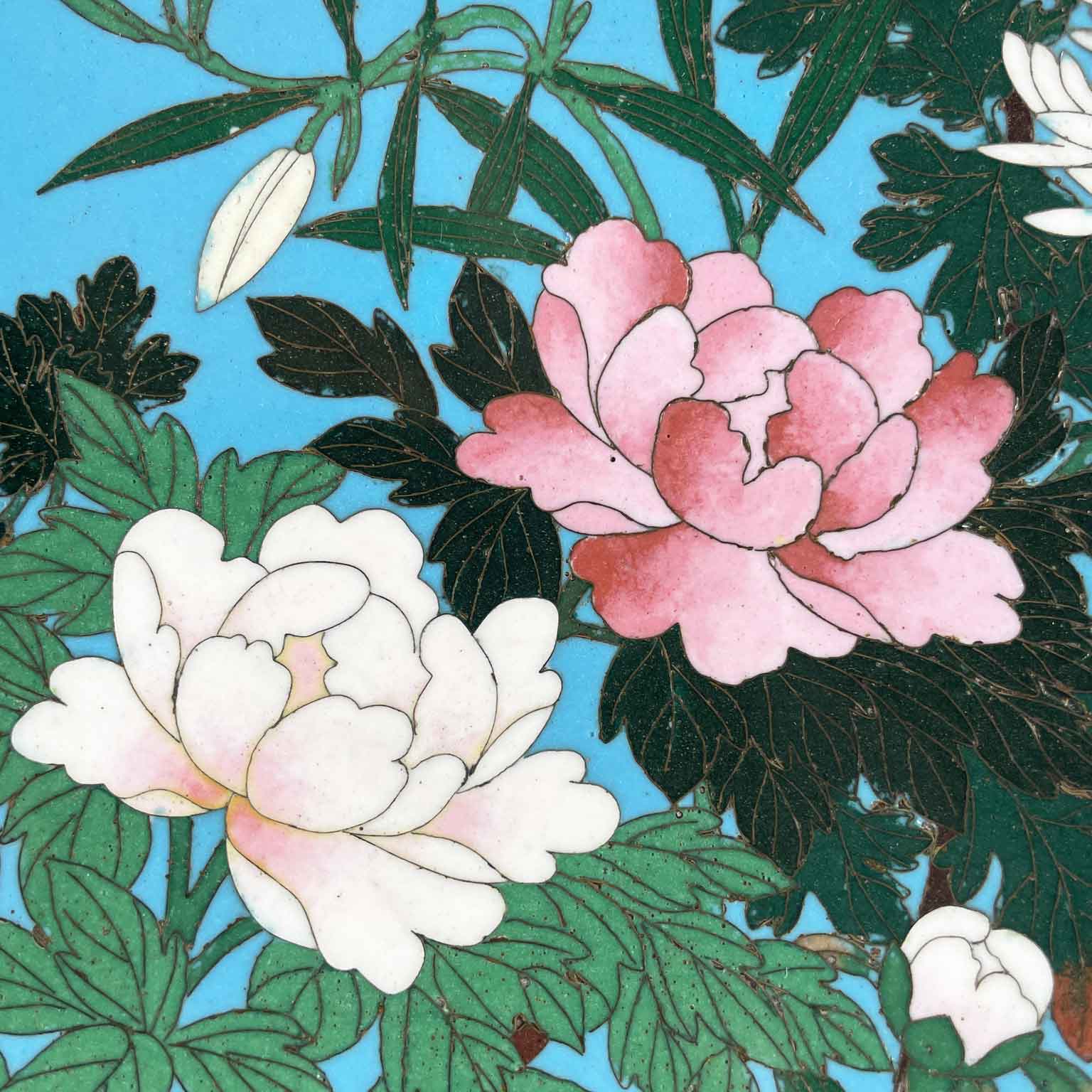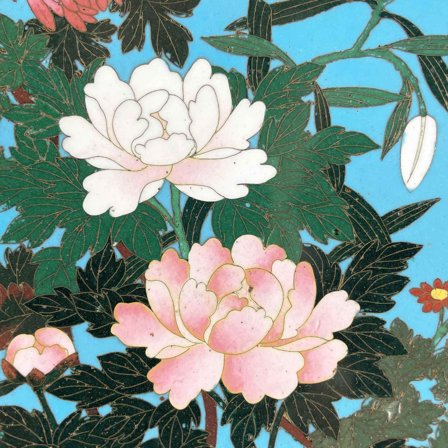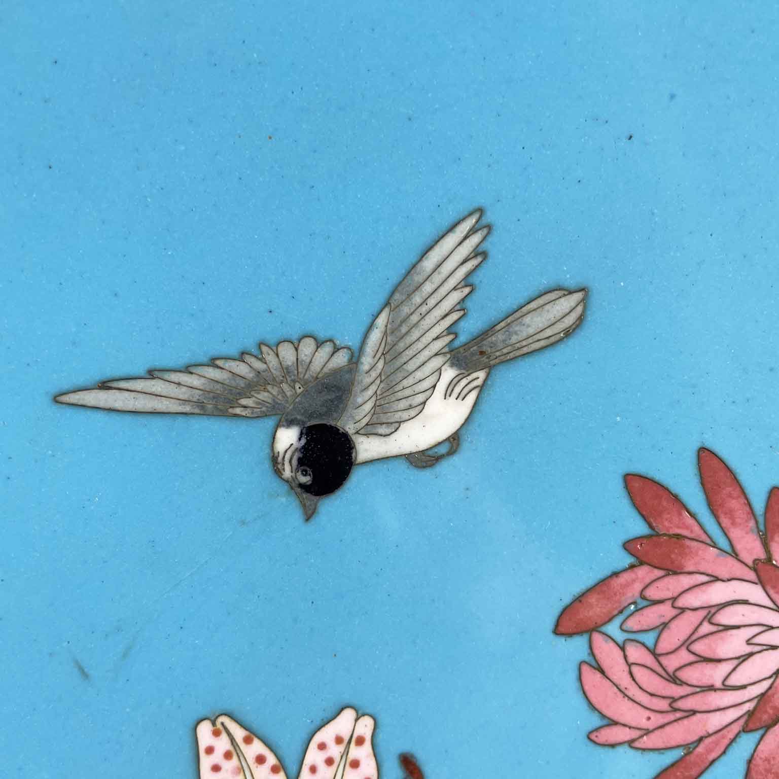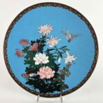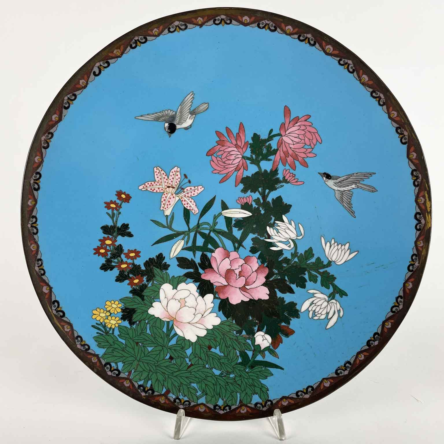 Coppia Di Piatti Giapponesi Periodo Meiji 1868-1912 a fondo turchese in buono stato di conservazione. Sul perimetro, un bordo circolare di cm. 1.7 a fondo scuro composto da cornici geometriche e fiori color senape; la ricca decorazione floreale all’interno è una composizione di rami di fiori di pesco, peonie e crisantemi in splendida fioritura animati da due passeri bianchi e neri.