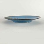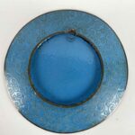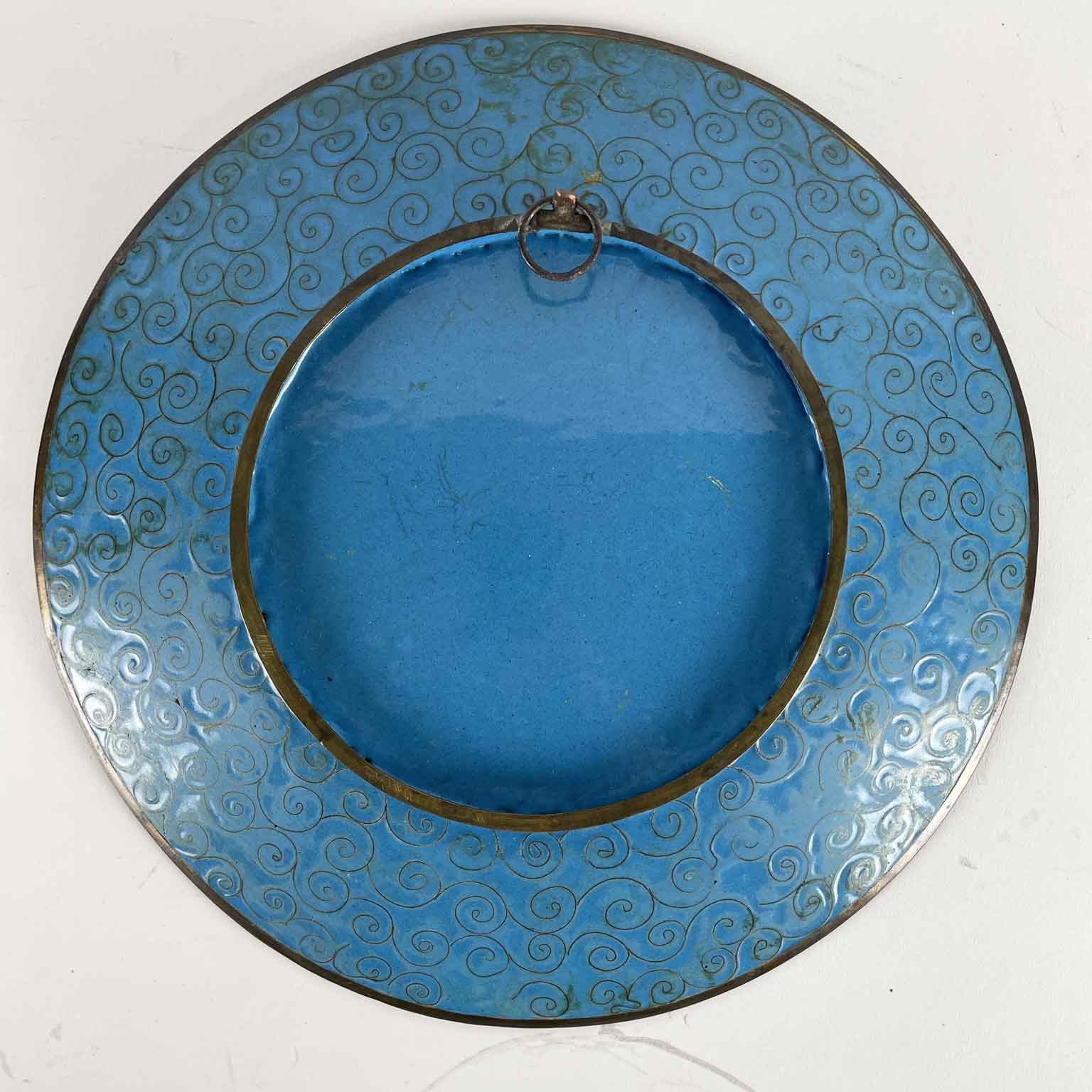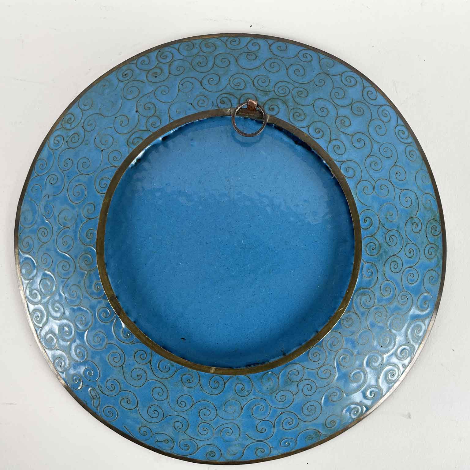 Il retro è smaltato in turchese con girali di ottone sulla tesa. Uno dei due piatti ha una leggera deformazione nella parte superiore della tesa.