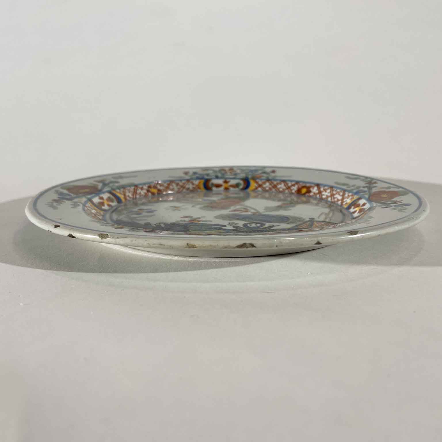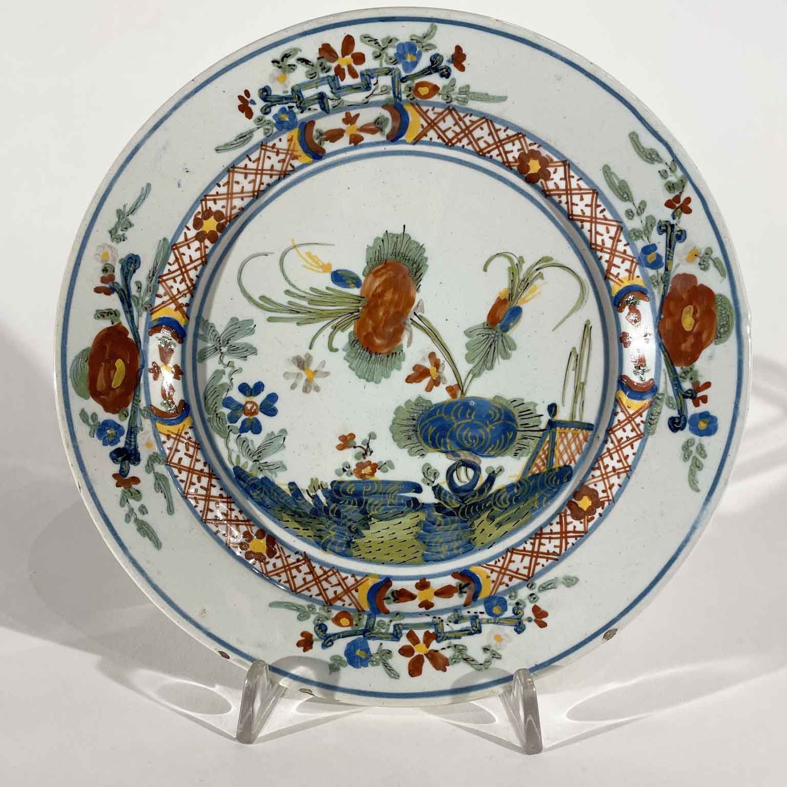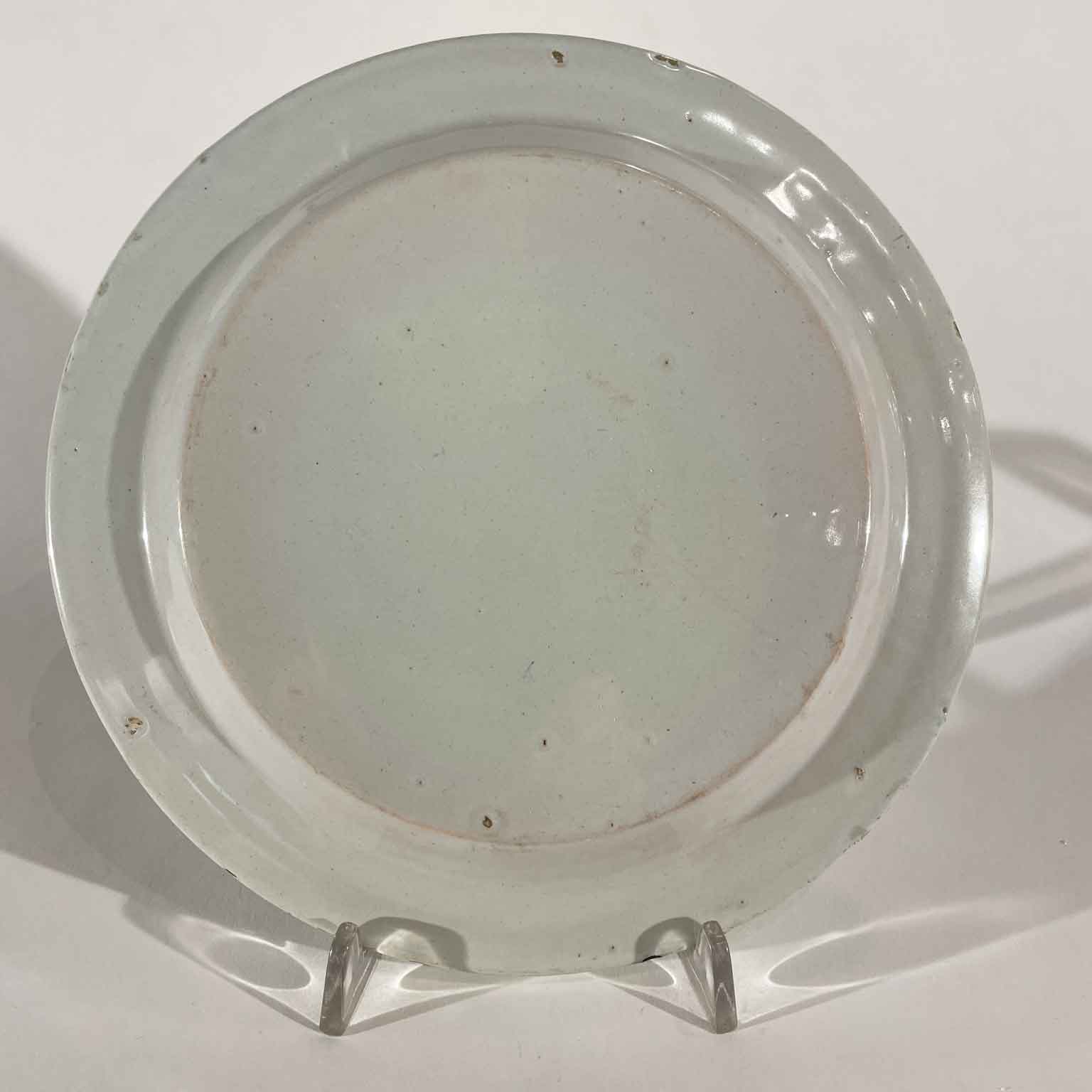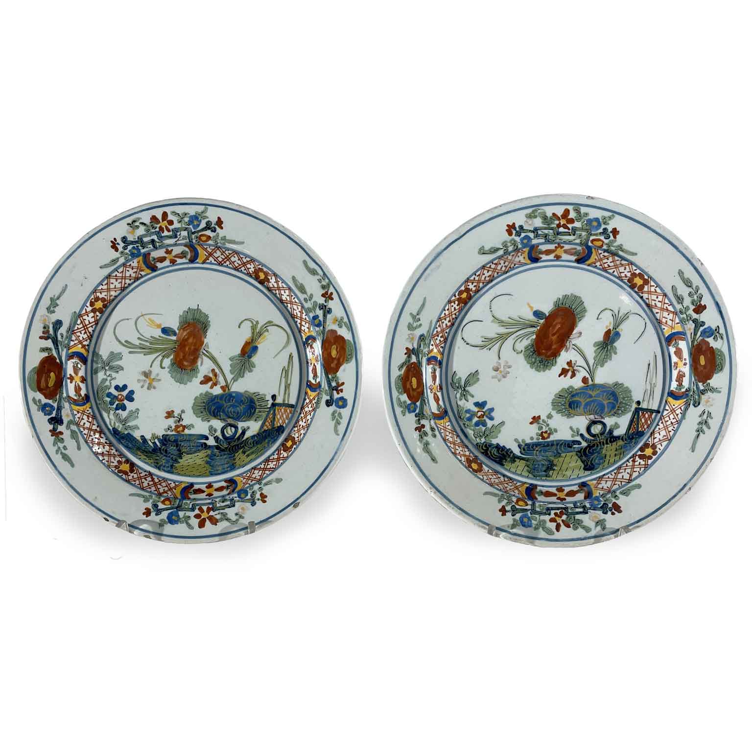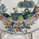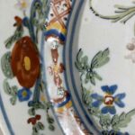 All’interno del cavetto si dispone si dispone la decorazione cosiddetta al garofano con il fiore che campeggia sul lungo stelo sinuoso; una stretta fascia con segmenti a graticce e rametti fioriti incornicia il motivo centrale e segna il passaggio alla tesa che è ornata da due composizioni floreali alternate. Due filetti marcano il bordo della composizione di questi due piatti antichi in maiolica del XVIII secolo di 20 cm di diametro. Faenza, terzo quarto del 1700, in buono stato di conservazione.