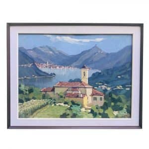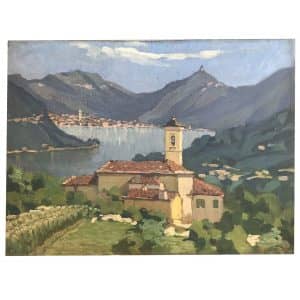 Daniele Fontana La Chiesa Di Santo Stefano A Cernobbio 1927 dipinto ad olio su compensato in buono stato di conservazione è firmato in basso a destra D. Fontana (1900-1984). Il dipinto si presenta entro cornice lignea non coeva e passe-partout in tessuto, ritrae in primo piano la Chiesa di Santo Stefano a Cernobbio con una veduta del paesaggio di montagna retrostante del Lago di Como.