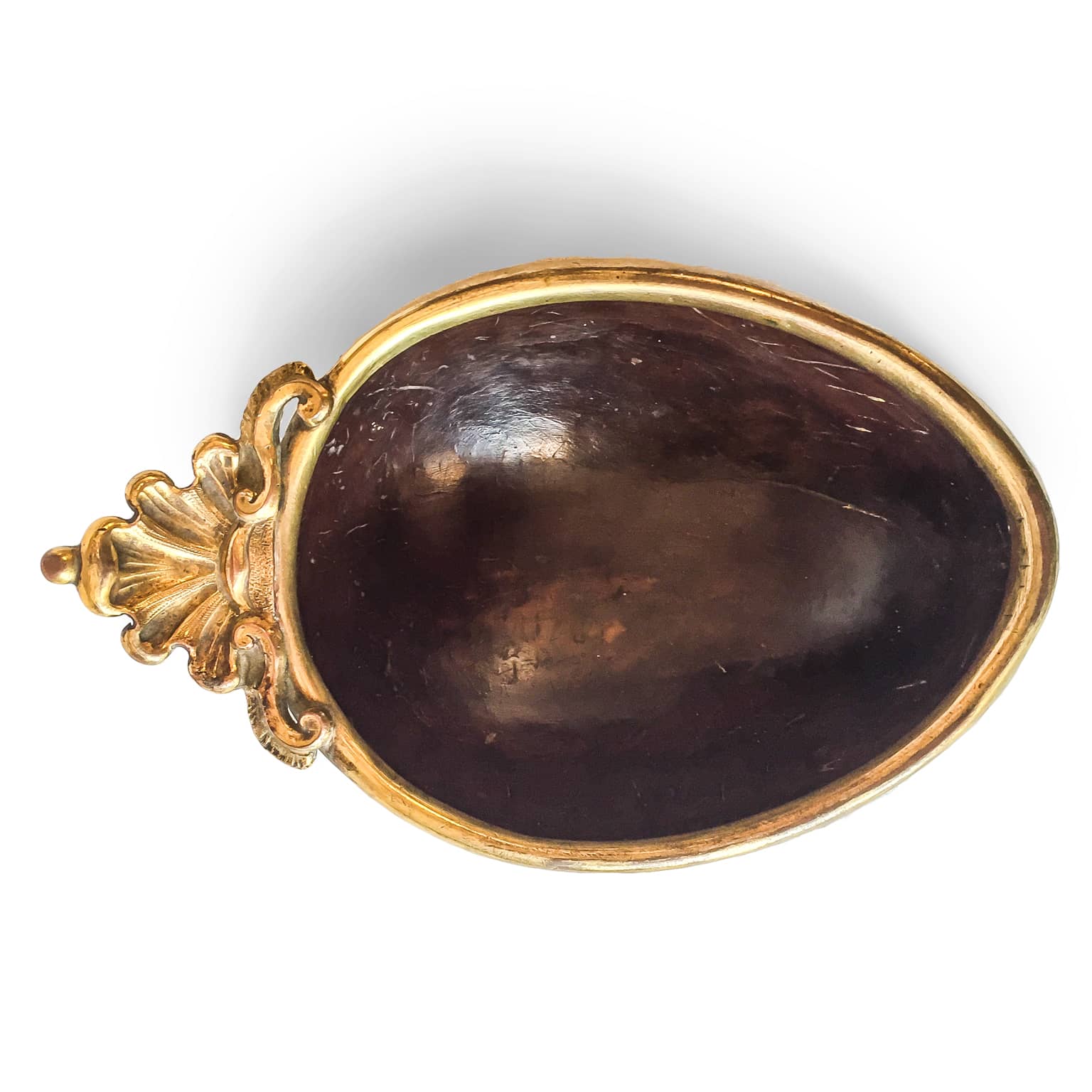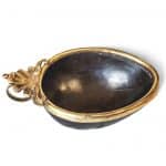 Di particolare rilievo è la montatura in rame sbalzato e dorato a fuoco che con una conchiglia impostata su due volute forma l’impugnatura della ciotola; il contrasto tra la patina scura della noce di cocco e l’oro della bordura unitamente alla semplicità dell’insieme ne fanno un oggetto veramente pregevole oltrechè raro, in quanto troviamo delle tipologie corrispondenti in ambito teutonico ma con finiture elaborate nell’intaglio.