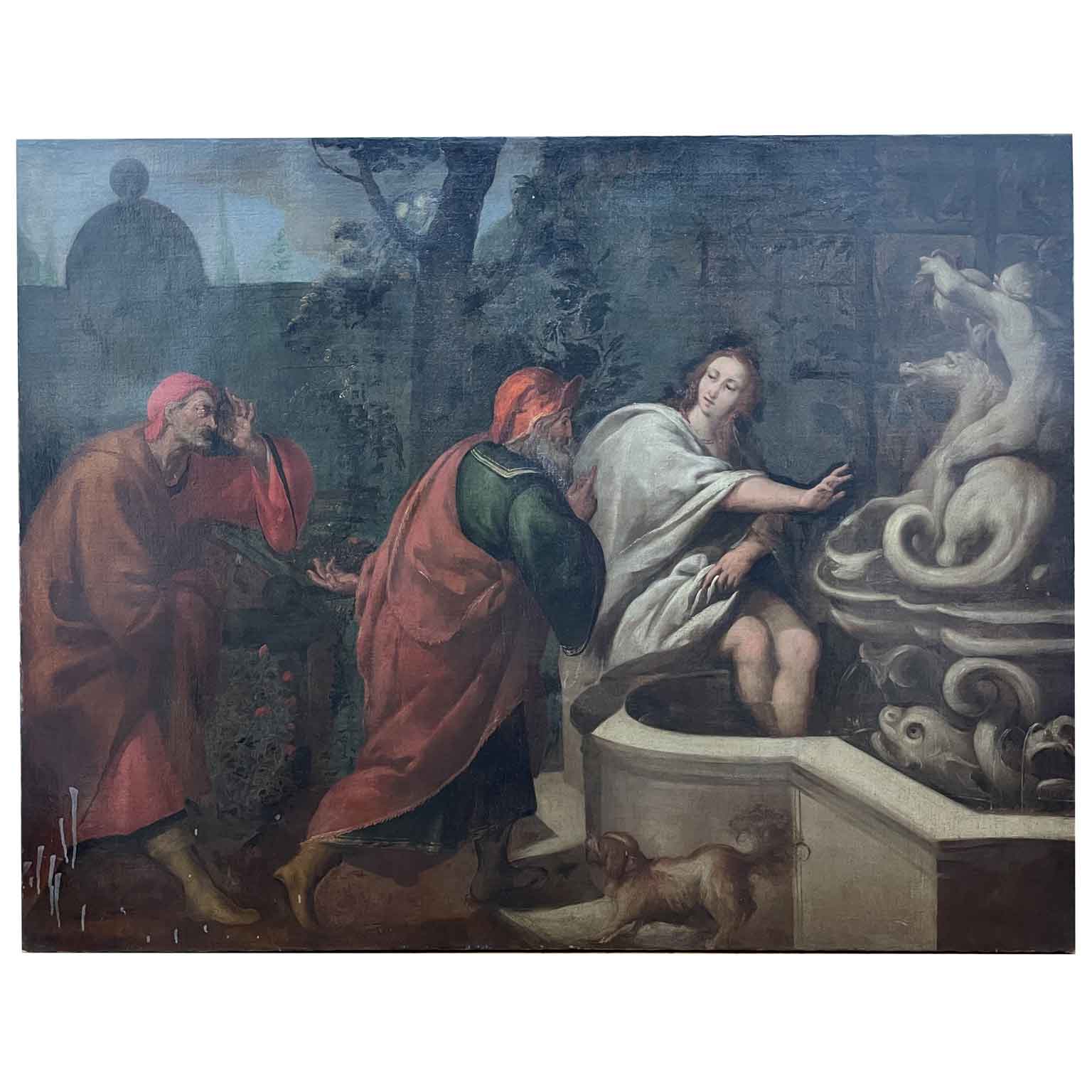 Il dipinto in oggetto raffigura Susanna ai margini seduta sul balaustro di una fontana decorata con sculture equestri, personaggi ed elementi zoomorfi. Davanti a lei un cagnolino osserva l’avvento dei due vecchiardi. Sullo sfondo la vegetazione di un cortile cintato oltre al quale si intravede uno scenario monumentale.