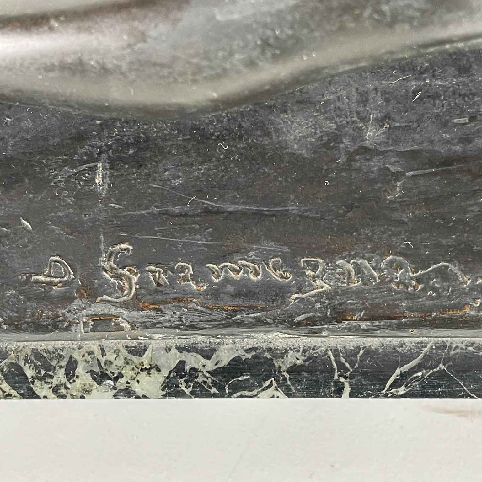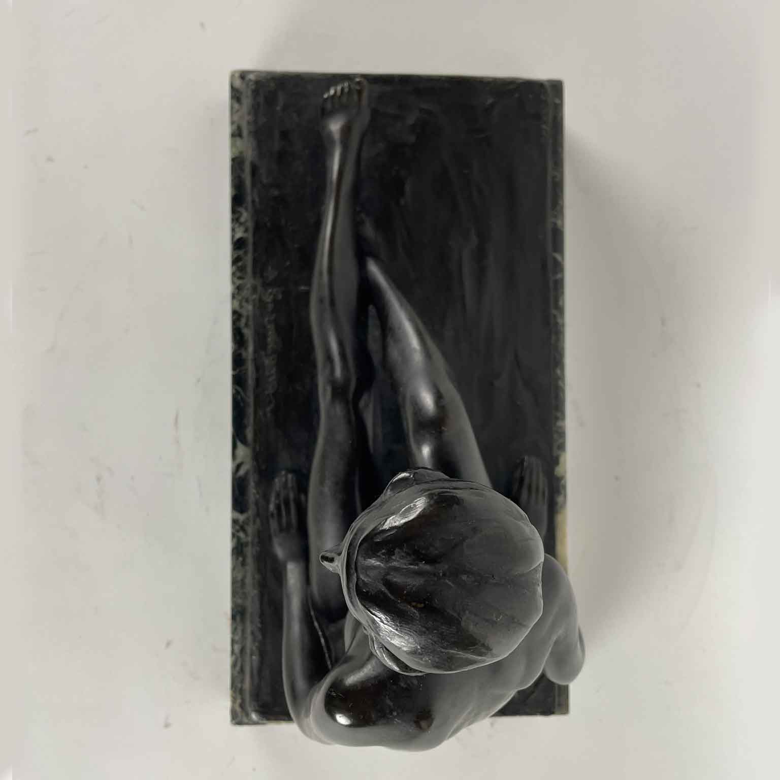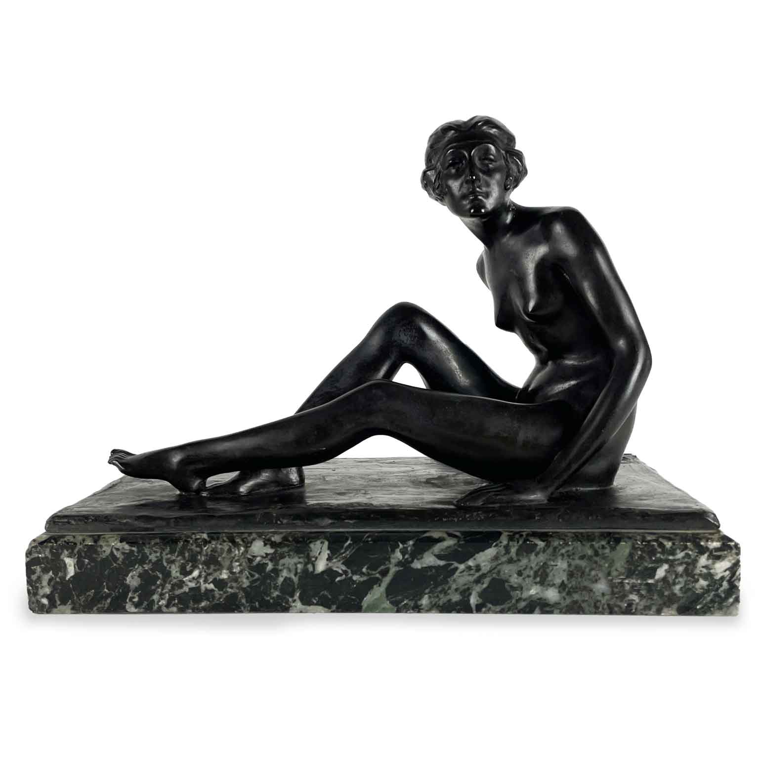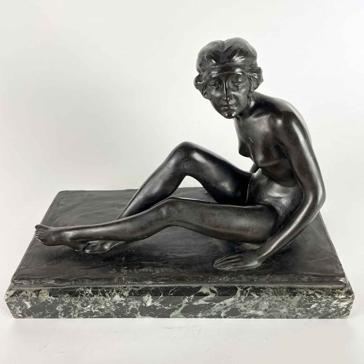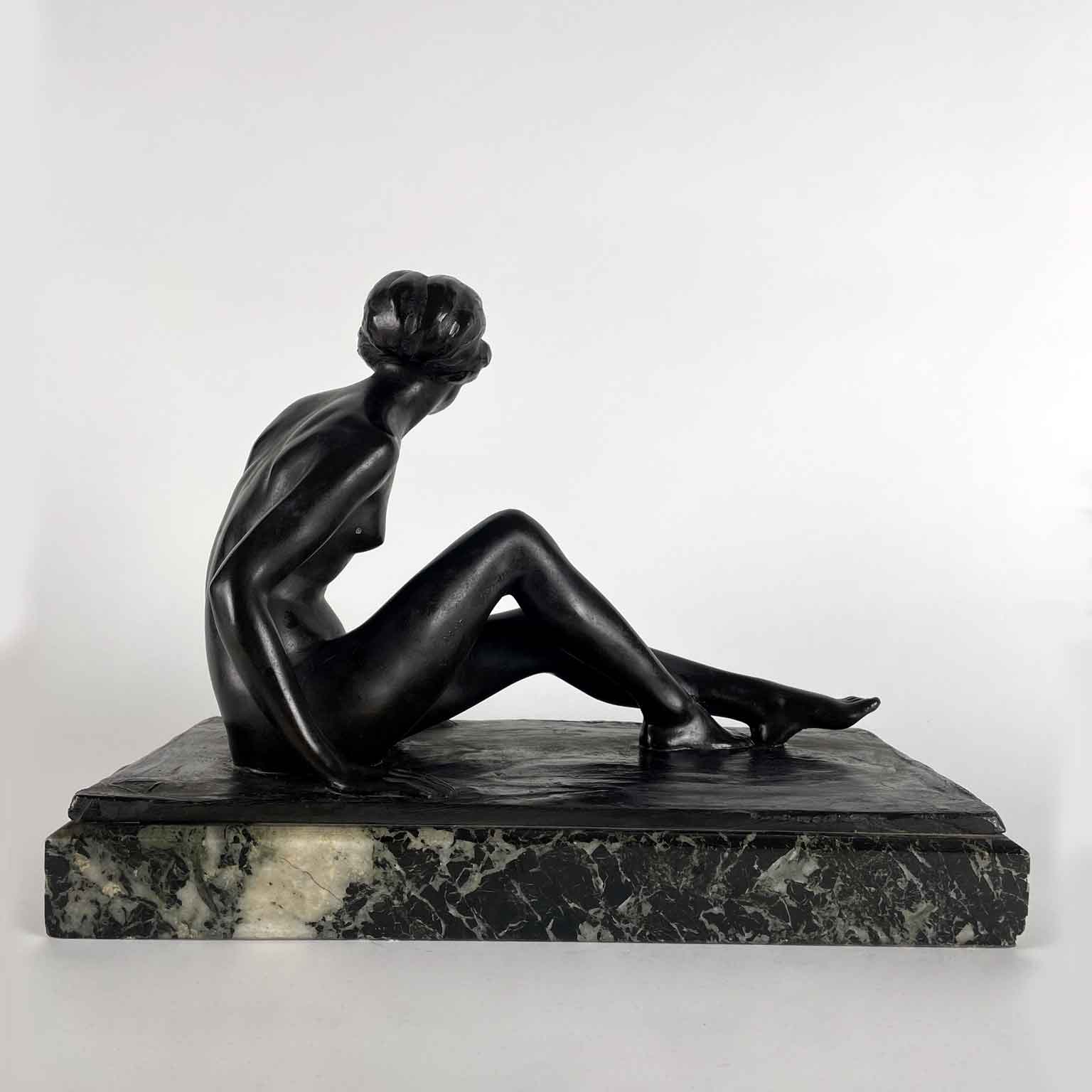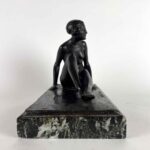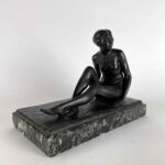 Donato Gramegna Figura Di Donna in Bronzo con base in marmo rettangolare. Rappresenta una donna nuda seduta con le gambe flesse, in ottimo stato, a prescindere da minime sbreccature in corrispondenza degli angoli della base in marmo. La firma di Donato Gramegna (1893-1975) è posta sulla base all’altezza del ginocchio della gamba distesa. In un angolo in campo triangolare il timbro della fonderia artistica cha ha realizzato la fusione a Milano dalla denominazione non decifrabile.