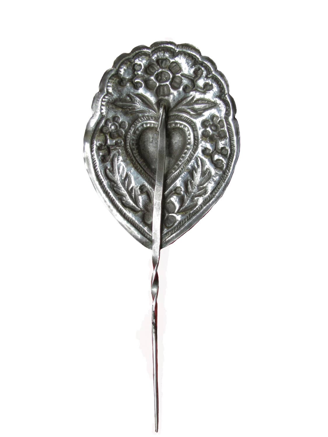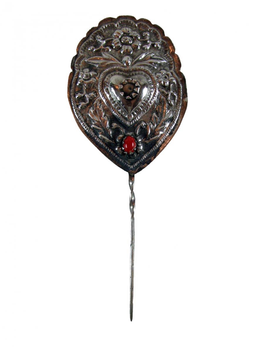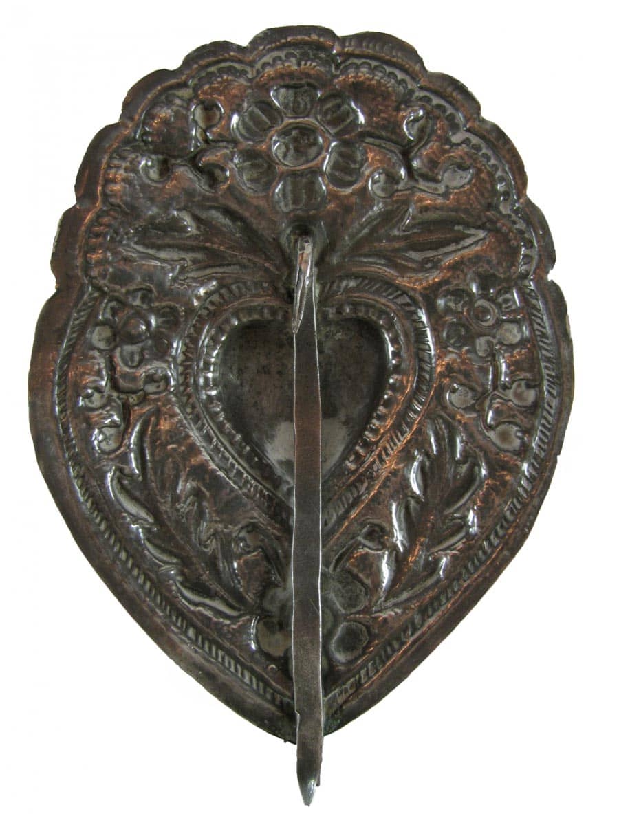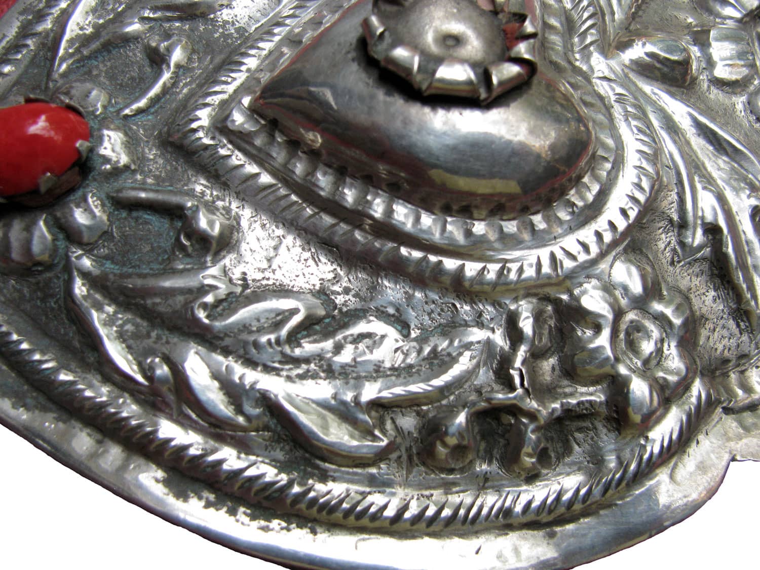 Fermaglio per scialle in argento sbalzato del 1700 proveniente da Kuzco in Perù. Venivano usati per fermare la giunzione dello scialle, sovrapponendo i lembi dello stesso ed “infilzando” il fermaglio nel tessuto ed attaccandolo allo stesso con un gancio. In lamina d’argento (non punzonato) con incastonate delle pietre in pasta vitrea (una mancante). In buono stato di conservazione.