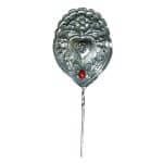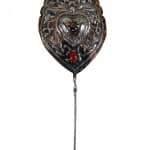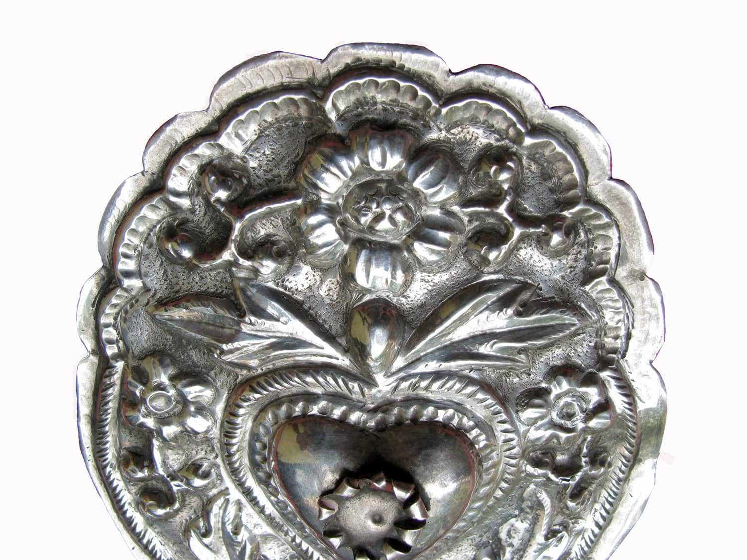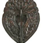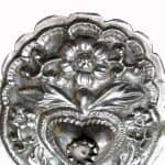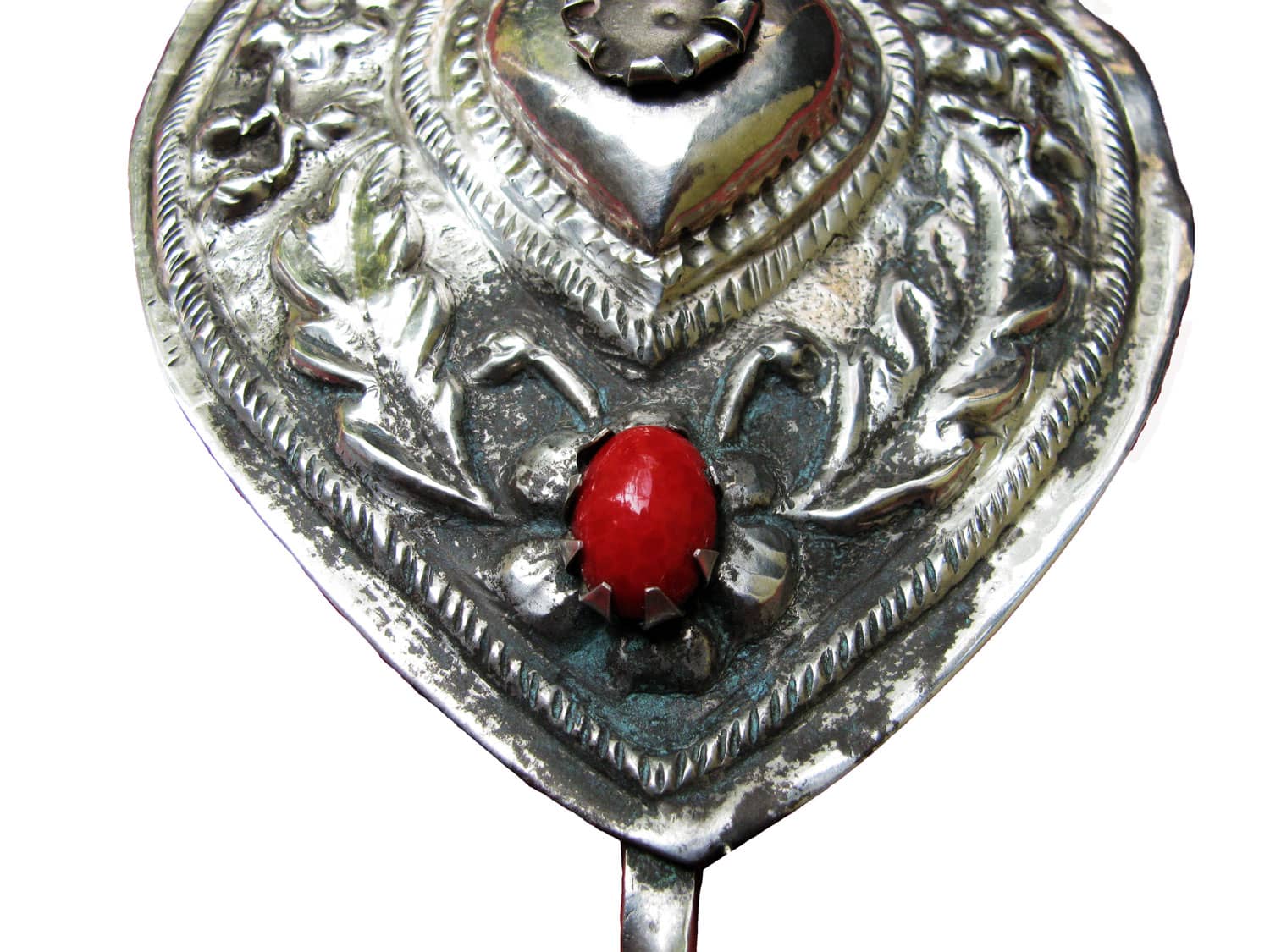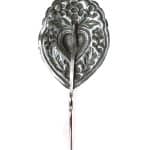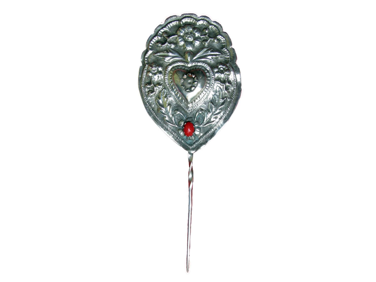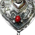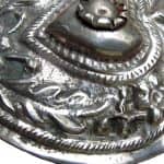 Fermaglio per scialle in argento sbalzato del 1700 proveniente da Kuzco in Perù. Venivano usati per fermare la giunzione dello scialle, sovrapponendo i lembi dello stesso ed “infilzando” il fermaglio nel tessuto ed attaccandolo allo stesso con un gancio. In lamina d’argento (non punzonato) con incastonate delle pietre in pasta vitrea (una mancante). In buono stato di conservazione.