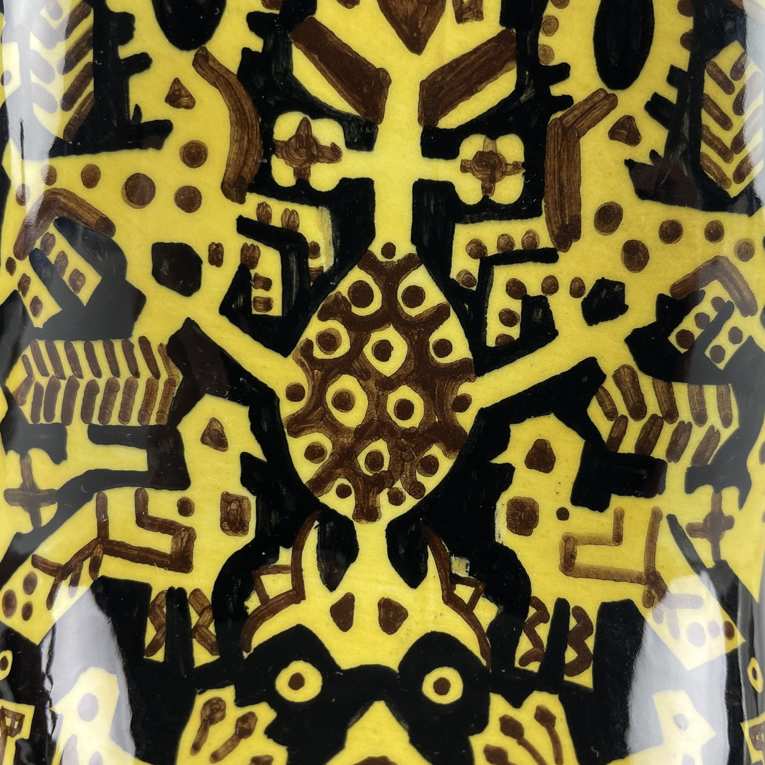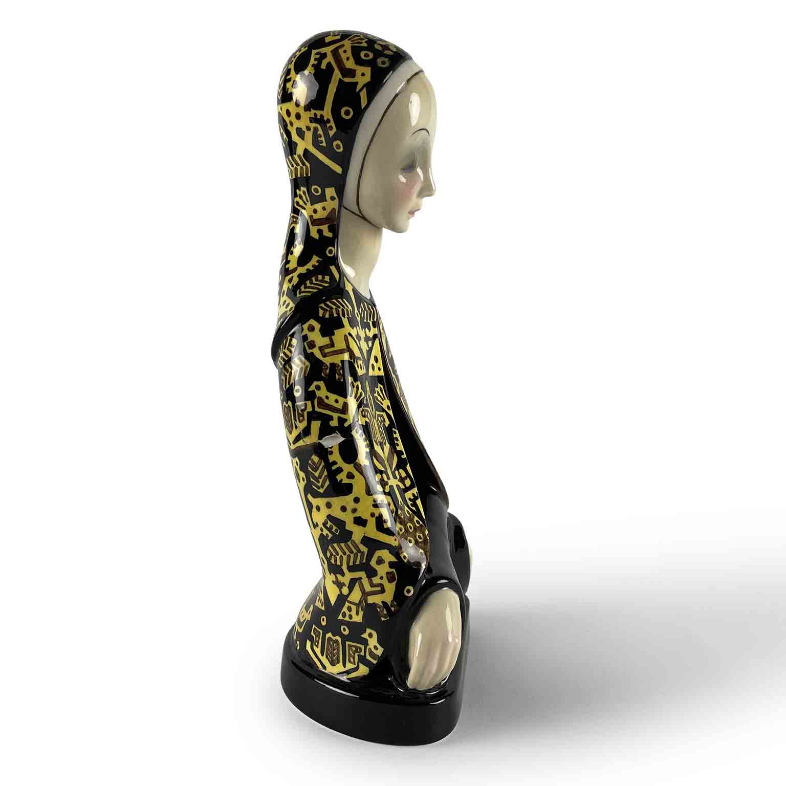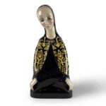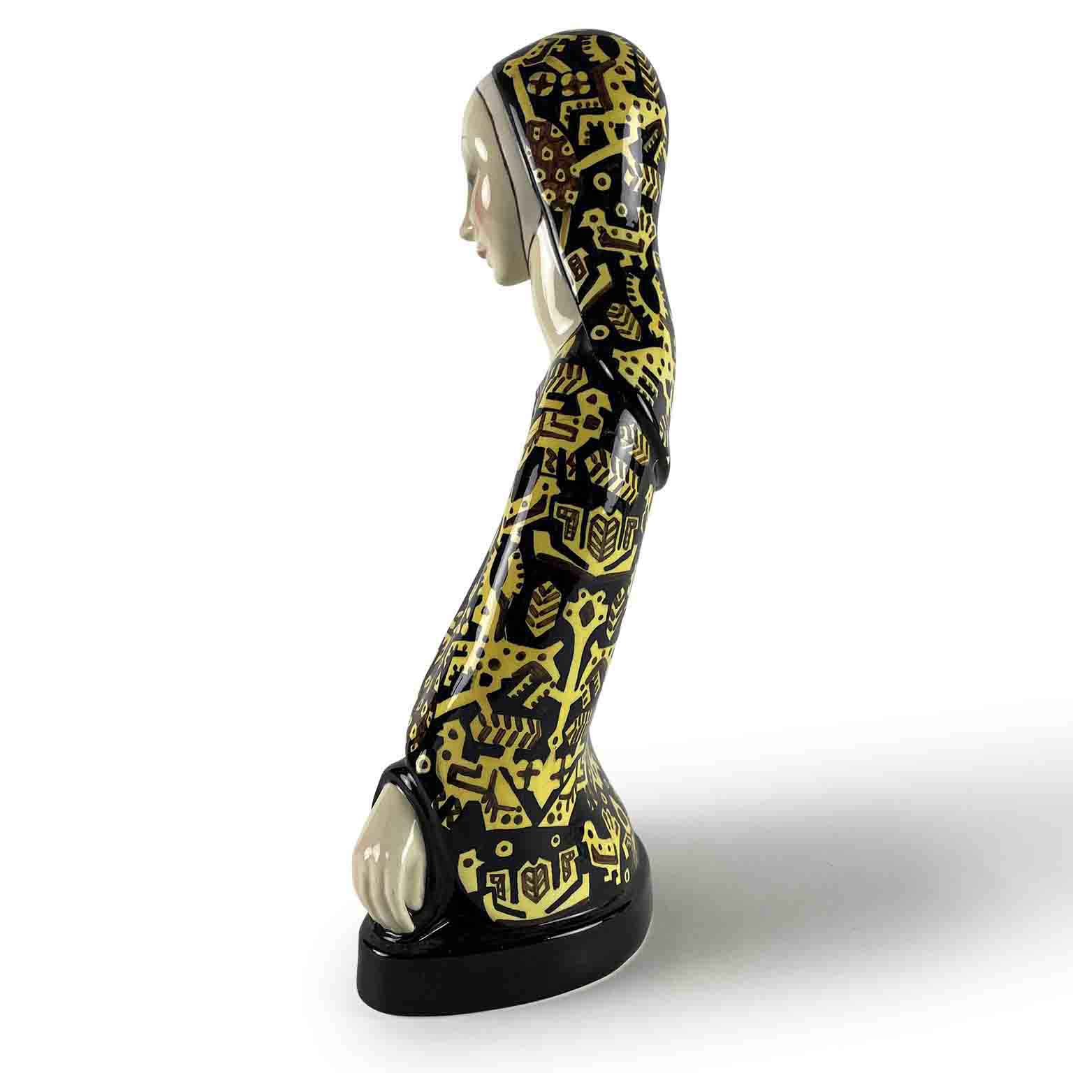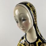 Figura Di Donna Lenci 1933 nota come Rassegnazione realizzata da Helen Konig Scavini (1886-1974) raffigura una figura di donna con velo e mani incrociate in terraglia a colaggio con decoro a smalti policromi nei toni del giallo e marrone su fondo nero.